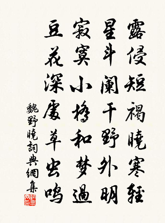 詩詞名句歷史字典書法欣賞書法字典國語詞典說文解字康熙字典古漢語字典標 題 作 者 詩 句 曉作者:魏野 朝代:宋代曉原文露侵短褐曉寒輕,星斗闌乾野外明。寂寞小橋和夢過,豆花深處草蟲鳴。詩詞問答問:曉的作者是誰?答:魏野問:曉寫於哪個朝代?答:宋代魏野曉書法欣賞曉書法作品詩詞推薦和二十二弟二首晃沖之〔宋代〕靜處偷看肘後書,幽棲古有此人無。綠蓑青蒻非吾事,白浪狂風滿太湖。遇仙槎馬鈺〔元代〕名成好息心,利遂堪回首。猿馬不輕狂,龍虎相 * 。常教玉戶開,莫使金關漏。九轉大丹成,萬劫神清秀。憶趙右之連文鳳〔宋代〕羞見梅花照客身,梅花長好客長貧。江天搖落年華晚,何處青山有故人。別故人鄭思肖〔宋代〕拍馬又登程,余酣尚未醒。曙蟾消淡白,秋漢覆空青。江走游龍勢,山蟠睡虎形。飄零毋感歡,天地亦浮萍。道庵小憩錢時〔宋代〕石徑柴門屈曲通,拂檐疏竹弄微風。等閒光影無人管,兩樹金沙相對紅。和答張衡仲孫應時〔宋代〕我方開竹徑,公肯屈籃輿。別去夢猶見,詩來錦不如。乾坤愁思里,風月醉眠餘。會卜溪橋畔,鄰牆小結廬。挽許通判二首劉宰〔宋代〕問訊吾邦鶴髮翁,惟公遺愛百年中。輕刑競喜椼楊脫,薄賦誰嗟杼軸空。遠卜雖孤桐邑望,貞游還喜葛仙同。從今楊貫之提舉輓詩二首李彌遜〔宋代〕錦衣人逐驚漚散,丹旐歌隨落照低。它日扁舟江上路,酸風吹淚過姑溪。新婚致語姚勉〔宋代〕珠簾繡幕藹祥煙,合巹嘉盟締百年。律底春回寒谷暖,堂間夜會德星賢。彩軿牛女歡雲漢,華屋神仙艷洞天。玉潤陳天成用東坡趙清獻高齋詩韻賦適齋次韻樓鑰〔宋代〕二公晚辭軒冕勞,兩齋莫辨適與高。嘗登雲山仰清獻,平地著屋山周遭。白頭日過適齋下,釣游尚想隨兒曹。方從和胡秉彝敷文岩桂四首蔡戡〔宋代〕獨占秋光自一奇,深藏岩壑少人知。招還茉莉同為伴,欺壓黃花不得施。端午貼子詞皇太后閣六首周麟之〔宋代〕慈歡不為植萱叢,聖子晨香孝養隆。況是九重當夏清,偏於扇枕得清風。戲書宋子才止足堂司馬光〔宋代〕舉世戀榮祿,夜行無乃勞。獨君年未至,止足一何高。矮制烏紗帽,寬裁白氎袍。華榱坐終日,閒按紫檀槽。元老和示小詩自謂非戰之罪復作一絕並坐具還蘇轍〔宋代〕請君卻領彌天具,不欲終收陷虎名。莫道昏沉非戰罪,何如不戰屈人兵。訴衷情晏幾道〔宋代〕小梅風韻最妖嬈。開處雪初消。南枝欲附春信,長恨隴人遙。閒記憶,舊江皋。路迢迢。暗香浮動,疏影橫斜,幾送仙遊知縣許延評李覯〔宋代〕策名曾未幾,奪迅出埃塵。陋巷潛心久,亨衢得意新。君恩方責報,民業近多貧。莫學悠悠者,謀身不為人。寄鄭伯元趙蕃〔宋代〕文學崔斯立,才名鄭廣文。傳聞定省暇,不廢簿書勤。流落誰如我,交親更念君。水西佳絕處,詩就想超群。點頭石釋智愚〔宋代〕大包才剖礙人間,日炙風吹轉放頑。見說聽經曾肯首,更須來透鐵門關。唐享太廟樂章。大明舞佚名〔唐代〕赤精亂德,四海困窮。黃旗舉義,三靈會同。旱望春雨,雲披大風。溥天來祭,高祖之功。它山堰陳坰〔宋代〕堰雷推動阿香車,惠澤均沾十萬家。誰任長官身後責,回潮今又見回沙。名句推薦馬蹀閼氏血,旗裊可汗頭。岳飛《送紫岩張先生北伐》 當年曾勝賞,生香熏袖,活火分茶。李清照《轉調滿庭芳·芳草池塘》 寂寂竟何待,朝朝空自歸。孟浩然《留別王侍御維 / 留別王維》 漸秋闌、雪清玉瘦,向人無限依依。李清照《多麗·詠白菊》 接葉巢鶯,平波卷絮,斷橋斜日歸船。張炎《高陽台·西湖春感》 休別有魚處,莫戀淺灘頭。佚名《增廣賢文·上集》 月色穿簾風入竹,倚屏雙黛愁時。顧敻《臨江仙·月色穿簾風入竹》 飛雲當面化龍蛇,夭矯轉空碧。秦觀《好事近·夢中作》 西湖舊日,留連清夜,愛酒幾將花誤。吳文英《永遇樂·探梅次時齋韻》 系我一生心,負你千行淚。柳永《憶帝京·薄衾小枕涼天氣》