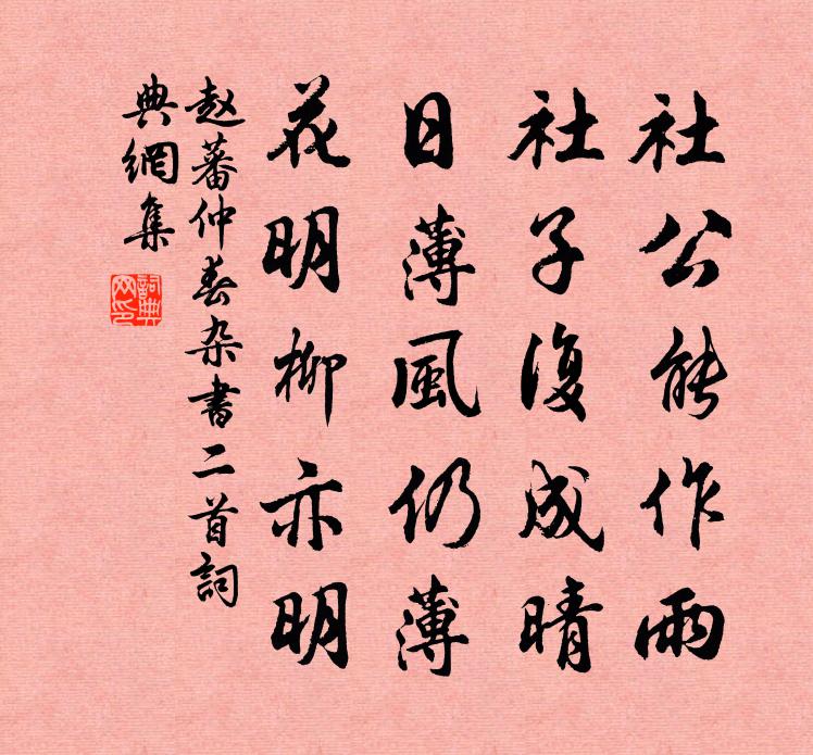 詩詞名句歷史字典書法欣賞書法字典國語詞典說文解字康熙字典古漢語字典標 題 作 者 詩 句 仲春雜書二首作者:趙蕃 朝代:宋代仲春雜書二首原文社公能作雨,社子復成晴。日薄風仍薄,花明柳亦明。詩詞問答問:仲春雜書二首的作者是誰?答:趙蕃問:仲春雜書二首寫於哪個朝代?答:宋代趙蕃仲春雜書二首書法欣賞仲春雜書二首書法作品詩詞推薦句歐陽鈇〔宋代〕風色似傳花信到,夕陽微放柳梢晴。試院七夕喻良能〔宋代〕過雨秋風灑客裳,長廊廣廈更清涼。不看雲際痴牛女,細讀文中古戰場。病骨未輕聊把酒,詩 * 適旋焚香。敢辭影壁自贊釋道濟〔宋代〕面黃以蠟,骨瘦如柴。這般模樣,只好投齋。鴉路溪行,呈陸中丞孟郊〔唐代〕鴉路不可越,三十六渡溪。有物飲碧水,高林掛青蜺。歷覽道更險,驅使跡頻暌。視聽易常主,心魂互相迷。浪石贈紫岩潘庭堅四首白玉蟾〔宋代〕富貴非足羨,貧賤不足羞。張儀但有舌,周朴不惜頭。我少亦學劍,到此萬年休。知君耿素抱,曷不遠行游。平旦釋文珦〔宋代〕平旦氣偏清,境界復深窔。初日上東溟,高峰最先照。會意髮長吟,何似蘇門嘯。不必諧宮商,自是山中調。秋懷五首李謙〔宋代〕英英庭前蘭,密密園中桂。涼飈駕遠馥,素景饒清麗。我居無俗物,二子時獨詣。願言永為好,千載成幽契。送鄭公績赴試金陵朱翌〔宋代〕念我答颯久,區區勞此生。借屋就瞿曇,長湖繞廂瀠。未了文字債,截蒲坐縱橫。天公喜相我,貺以秋風清。他年句吳覺〔宋代〕燕頷英姿宜食肉,羊腸險韻宜剪茶。舍北望牛頭山山有延勝寺先太傅書堂在焉六年陸游〔宋代〕太傅讀書處,秋風曾問途。江如青弋險,山似白鹽孤。路盡還登嶺,林開忽見湖。草堂無復識,流涕想規模。旅次舟中對月寄姜公(此公,丁泉州門客)歐陽詹〔唐代〕中宵天色淨,片月出滄洲。皎潔臨孤島,嬋娟入亂流。應同故園夜,獨起異鄉愁。那得休蓬轉,從君上庾樓。感遇之十三陳子昂〔唐代〕林居病時久。水木澹孤清。閒臥觀物化。悠悠念無生。青春始萌達。朱火已滿盈。徂落方自此。感嘆何時平。醉吟商小品/小品姜夔〔宋代〕又正是春歸,細柳暗黃千縷。暮鴉啼處。夢逐金鞍去。一點芳心休訴。琵琶解語。次韻邢子友陳與義〔宋代〕壯士如今爛莫收,尚思抽矢射旄頭。不堪苦霧侵衰鬢,稍喜和煙入戍樓。萬里中原空費夢,三春勝日偶成游。青松橫波亭為青口帥賦元好問〔金代〕孤亭突兀插飛流,氣壓元龍百尺樓。萬里風濤接瀛海,千年豪傑壯山丘。疏星淡月魚龍夜,老木清霜鴻雁秋。倚劍上湖南孫漕四首廖行之〔宋代〕湘雨湘田處處同,誰知公意與天通。愛民天亦憂民事,望歲公應喜歲豐。自古強兵先足食,從今積粟可平戎。關中寄處州季侍御二首趙蕃〔宋代〕已上湘祠請,猶須漢臘期。側聽惟此雁,發興在南枝。貧已長年事,官寧向老為。舊聞煙雨觀,猶擬和公詩。寄贈洛下達三藏魏野〔宋代〕曾攜缽錫到靈山,古寺歸來洛水邊。新譯經文傳北闕,舊遊詩句在西天。爐中香想諸方施,籠里燈應數世傳。別有送湯丞相帥會稽韓元吉〔宋代〕淮岸春來罷夕烽,君王奏凱大明宮。守關豈但勤蕭相,分陝猶宜屈召公。彩綬不妨龍袞貴,綿衣真與故鄉同。政成苦雨吟十首呈同官諸丈吳潛〔宋代〕田官決水歸,喜有潰重圍。晚種禾頭出,新耘稻本肥。已如雲氣勃,只恨日光稀。安得驅夸父,搪開萬里輝。名句推薦苟利國家生死以,豈因禍福避趨之。林則徐《赴戍登程口占示家人·其二》 明日相思莫上樓,樓上多風雨。游次公《卜運算元·風雨送人來》 亂碧萋萋,雨後江天曉。梅堯臣《蘇幕遮·草》 春晚綠野秀,岩高白雲屯。謝靈運《入彭蠡湖口》 問姓驚初見,稱名憶舊容。李益《喜見外弟又言別》 事以密成,語以泄敗。韓非及後人《韓非子·說難》 曉雞驚樹雪,寒鶩守冰池。李商隱《幽居冬暮》 語言多矯飾,則人品心術,盡屬可疑。王永彬《圍爐夜話·第四十則》 與肩挑貿易,毋占便宜;見貧苦親鄰,須加溫恤。朱柏廬《朱子家訓·全文》 空對著,山中高士晶瑩雪曹雪芹《終身誤》