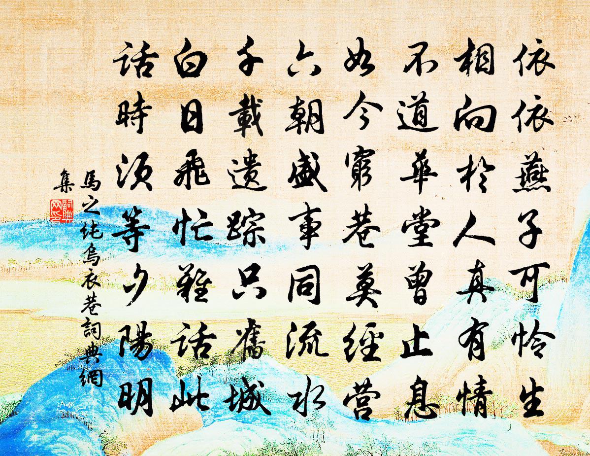 詩詞名句歷史字典書法欣賞書法字典國語詞典說文解字康熙字典古漢語字典標 題 作 者 詩 句 烏衣巷作者:馬之純 朝代:宋代烏衣巷原文依依燕子可憐生,相向於人真有情。不道華堂曾止息,如今窮巷莫經營。六朝盛事同流水,千載遺蹤只舊城。白日飛忙難話此,話時須等夕陽明。詩詞問答問:烏衣巷的作者是誰?答:馬之純問:烏衣巷寫於哪個朝代?答:宋代馬之純烏衣巷書法欣賞烏衣巷書法作品詩詞推薦對竹有感崔敦禮〔宋代〕庭前抱節君,五年不見汝。去時雙玉槊,枝葉稀可數。歸來兒孫多,已滿寸金土。竹盛人凋零,攀枝淚如雨。題黃筌牡丹花下貓李石〔宋代〕紅英艷雲霞,綠葉足風雨。牡丹花未開,生意妙誰主。丹青強摸索,閉目想未睹。天巧非人工,神凝志良苦。竦然菩薩蠻晏幾道〔宋代〕嬌香淡染胭脂雪,愁春細畫彎彎月。花月鏡邊情,淺妝勻未成。佳期應有在,試倚鞦韆待。滿地落英紅,萬條楊柳漁浦戴栩〔宋代〕久慚竅食侶鵷鴻,尚以詩名玷至公。喜對親慈說田裡,了無事鄙到船蓬。漲流暫急潮差候,陰靄俄銷月在空。夢讀下營曉行二首方回〔宋代〕月淡雲濃弄曉晴,草中白處路微明。垂鞭緩轡十餘里,始聽鳴雞第一聲。菊花新(中呂調)張先〔宋代〕墮髻慵妝來日暮。家在畫橋堤下住。衣緩絳綃垂,瓊樹裊、一枝紅霧。院深池靜嬌相妒。粉牆低、樂聲時度。長恐頌古七首釋祖璇〔宋代〕盡卻耳根並眼底,不知何處見如來。數聲幽鳥啼寒木,一片閒雲鋪斷崖。杏林春燕唐寅〔明代〕紅杏梢頭掛酒旗,綠楊枝上轉黃驪。鳥聲花影留人住,不賞東風也是痴。泊鳧磯江館趙嘏〔唐代〕風雪晴來歲欲除,孤舟晚下意何如。月當軒色潮平後,雁斷雲聲客起初。傍曉管弦何處靜,犯寒楊柳繞津疏。三間送蘇松軒路教解任陳著〔宋代〕三載多材地,一團和氣鄉。蛙池疏道脈,蓬島矗文芒。明日歸舟穩,春風驛路長。詞林是氈舊,此去足翱翔。到房交代招飲四首陳造〔宋代〕妓圍簷額潤空青,岫幌雲關夜不扃。吏隱風流輸我輩,可須逋客詫山靈。趙湖州東園雜詠和人韻賓日陳文蔚〔宋代〕著眼高時四海空,何須服日臉霞紅。清朝坐對升暘谷,萬里雲煙在古風。送鄭尚書守建安十首彭龜年〔宋代〕春來苦雪夏來寒,南去愁霖北去乾。又報豐年無一事,乞身遠去可能安。贈雙峯山和尚周朴〔唐代〕峩峩雙髻山,瀑布瀉雲間。塵世自疑水,禪門長去關。茯神松不異,藏寶石俱閒。向此師清業,如何方可攀。暮游嶽麓寺齊己〔唐代〕寺樓高出碧崖棱,城裡誰知在上層。初雪灑來喬木暝,遠禽飛過大江澄。閒消不睡憐長夜,靜照無言謝一燈。回首採蓮曲崔國輔〔唐代〕玉漵花爭發,金塘水亂流。相逢畏相失,並著採蓮舟。伏中作二首孔武仲〔宋代〕去歲復今日,清槐系扁舟。手攜筇竹杖,朝上龜山頭。百川合為一,浩渺蟠天流。徙倚弄佳音,嘯歌懷舊邱。京都江亭別裴饒羅隱〔唐代〕行杯且待怨歌終,多病憐君事事同。衰鬢別來光景里,故鄉歸去亂罹中。乾坤墊裂三分在,井邑摧殘一半空。日晚嘉泰改元桂林大比與計偕者十有一人九月十六王正功〔宋代〕百嶂千峰古桂州,鄉來人物固難儔。峨冠共應賢能詔,策足誰非道藝流。經濟才猷期遠器。縱橫禮樂封前旒。三君減字木蘭花趙福元〔宋代〕吮煤弄筆。草聖寰中君第一。電腳搖光。驟雨旋風聲滿堂。豪厘巧辨。喚起羲之當北面。醉眼摩娑。錯認書顛作酒名句推薦此日六軍同駐馬,當時七夕笑牽牛。李商隱《馬嵬·其二》 手攜稚子夜歸院,月冷空房不見人。白居易《為薛台悼亡》 范增一去無謀主,韓信原來是逐臣。嚴遂成《烏江項王廟》 知音少,弦斷有誰聽。岳飛《小重山·昨夜寒蛩不住鳴》 晚鴉飛去,一枝花影送黃昏夏完淳《婆羅門引·春盡夜》 紅樓隔雨相望冷,珠箔飄燈獨自歸。李商隱《春雨》 十有九人堪白眼,百無—用是書生。黃景仁《雜感》 宜未雨而綢繆,毋臨渴而掘井。朱柏廬《朱子家訓·全文》 專勝者未必克,挾疑者未必敗。范曄《後漢書·列傳·烏桓鮮卑列傳》 大曰逝,逝曰遠,遠曰反。老子《老子·道經·第二十五章》