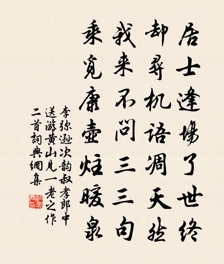 詩詞名句歷史字典書法欣賞書法字典國語詞典說文解字康熙字典古漢語字典標 題 作 者 詩 句 次韻叔孝郎中送游黃山見一老之作二首作者:李彌遜 朝代:宋代原文居士逢場了世終,卻尋機語凋天然。我來不問三三句,乘覓康壺炷暖泉。詩詞問答問:《次韻叔孝郎中送游黃山見一老之作二首》的作者是誰?答:李彌遜問:該詩寫於哪個朝代?答:宋代書法欣賞次韻叔孝郎中送游黃山見一老之作二首書法作品詩詞推薦初夏洪咨夔〔宋代〕鶴帳華纓絕,牛蹊老屐穿。薄晴生晚哢,深綠護余妍。萬卷不堪煮,百懷空自煎。朱櫻黃苦筍,小酌便陶然。句江公亮〔宋代〕好是道人岩邊月,夜深清照飲牛溪。春日絕句陸游〔宋代〕桃李吹成九陌麈,客中又過一年春。余寒漠漠城南路,只見鞦韆不見人。壽李悅齋五首和三勞使尹使君韻程公許〔宋代〕宇縣風塵暗,軍需色目繁。時機寧我待,心事向誰論。膻聚蟣爭慕,泉深驥渴奔。非公能借箸,猛虱恐徒捫。次莊過荊渚以詩寄之趙汝鐩〔宋代〕澤國遙千里,雲帆隔兩州。醉行沙市月,吟破渚宮秋。魚嘆馮驩鋏,貂殘季子裘。人傳君入蜀,無事早歸休。送僧歸吳司馬光〔宋代〕高枕聊成夢,晴空忽見花。浮生儘是客,何處得為家。旅食帝城久,歸舟澤國賒。角因菰菜味,回首浩無涯。早飯龍堂寺趙蕃〔宋代〕櫸藤束縛竹為輿,野飯來尋僧所廬。茅屋正逢飛卷破,夜來風雨問何如。送鹽鐵裴判官入蜀盧綸〔唐代〕傳詔收方貢,登車著賜衣。榷商蠻客富,稅地芋田肥。雲白風雷歇,林清洞穴稀。炎涼君莫問,見即在忘歸。使北二首姜特立〔宋代〕萬里持哀使北芒,偶能成禮報君王。中原舊事成新恨,添得歸來兩鬢霜。館中分韻錢李大著出守上饒徐元傑〔宋代〕赤城烏府家,忠信以為寶。當年璧海珍,摛文絢春藻。光焰萬丈余,膏丐淵浩浩。梯級丹霄寬,聲名日杲杲。幾載東堂四首張耒〔宋代〕烏衣更士能呼旦,金縷嬌娘解唱歌。天與旅人供一笑,不然奈此寂寥何。感遇二十五首張耒〔宋代〕蒼鷹初化鳩,未忍望擊搏。照水或見形,乃見悔其昨。麗戎有奇女,遭虜常涕洟。改服登晉宮,更恨來苦遲。變化二絕句張耒〔宋代〕幽窗老客寒無睡,長聽城樓曉角悲。萬里滄溟初浴日,暗雞先向草間知。講武城洪皓〔宋代〕長笑袁本初,妄意清君側。垂頭返官渡,奇禍憐幕客。曹公走熙尚,氣欲陵韓白。欺取計已成,軍容漫輝赫。跨漳囉嗊曲六首·其三劉采春〔唐代〕莫作商人婦,金釵當卜錢。朝朝江口望,錯認幾人船。贈內李白〔唐代〕三百六十日,日日醉如泥。雖為李白婦,何異太常妻。祝英台近(和辛稼軒“寶釵分”韻)吳潛〔宋代〕霧霏霏,雲漠漠,新綠漲幽浦。夢裡家山,春透一犁雨。傷心塞雁回來,問人歸未,怎知道、蝸名留住。鏡中覷。自在廬為倪遜翁賦連文鳳〔宋代〕翁也家何在,悠然天地間。往來明月牖,坐臥白雲關。晚歲有餘樂,誰人似此間。只為清景惱,吟得鬢毛斑。句釋惠崇〔宋代〕嶺暮清猿急,江寒白鳥稀。留題承旨宋侍郎林亭釋希晝〔宋代〕翰苑營嘉致,到來山意深。會茶多野客,啼竹半沙禽。雪溜懸危石,棋燈射遠林。言詩素非苦,虛答侍臣心。名句推薦東邊日出西邊雨,道是無晴卻有晴。劉禹錫《竹枝詞二首·其一》 微陽下喬木,遠色隱秋山。馬戴《落日悵望》 春蠶到死絲方盡,蠟炬成灰淚始乾。李商隱《無題·相見時難別亦難》 強攜酒、小橋宅,怕梨花落盡成秋色。姜夔《淡黃柳·空城曉角》 東飛伯勞西飛燕,黃姑織女時相見。蕭衍《東飛伯勞歌》 聽君一席話,勝讀十年書。佚名《增廣賢文·上集》 長江千里,煙淡水雲闊。李綱《六么令·次韻和賀方回金陵懷古鄱陽席上作》 動莫若敬,居莫若儉,德莫若讓,事莫若咨。左丘明《國語·周語·晉羊舌肸聘周論單靖公敬儉讓咨》 蟬噪林逾靜,鳥鳴山更幽。王籍《入若耶溪》 行善濟人,人遂得以安全,即在我亦為快意王永彬《圍爐夜話·第五一則》