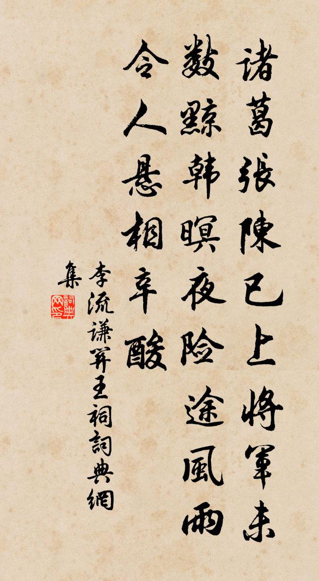 詩詞名句歷史字典書法欣賞書法字典國語詞典說文解字康熙字典古漢語字典標 題 作 者 詩 句 關王祠作者:李流謙 朝代:宋代關王祠原文諸葛張陳已上,將軍未數黥韓。暝夜險途風雨,令人懸相辛酸。詩詞問答問:關王祠的作者是誰?答:李流謙問:關王祠寫於哪個朝代?答:宋代李流謙關王祠書法欣賞關王祠書法作品詩詞推薦後一日因展省歸途口占陳文蔚〔宋代〕春光休道屬誰家,造化平鋪無等差。不問世間凡草木,得春隨意總皆花。遣病十首元稹〔唐代〕服藥備江瘴,四年方一癘。豈是藥無功,伊予久留滯。滯留人固薄,瘴久藥難制。去日良已甘,歸途奈無際。棄置送琉書記還長樂釋崇岳〔宋代〕相見相從道自親,妙高峰頂謾因循。業風忽起波濤惡,一錫飄然到七閩。贊歷代天師第八代諱迥字彥超白玉蟾〔宋代〕丹篆才書泣鬼神,年逾九十脫紅塵。至今岩上結廬處,夜半鳳凰棲綠筠。清湘城西飛來峰三首曾豐〔宋代〕三處飛來一樣奇,佛無所擇我何辭。重輕較到毫釐處,鳴雁行中此白眉。滿江紅王炎〔宋代〕宦海浮沉,名與字、不能彰徹。青雲上、諸公袞袞,難登狹劣。結綬彈冠成底事,解頤折角皆虛說。待黃粱、夢覺和詩送茶寄孫之翰蔡襄〔宋代〕北苑靈芽天下精,要須寒過入春生。故人偏愛雲腴白,佳句遙傳玉律清。衰病萬緣皆絕慮,甘香一味未忘情。封題冬日有懷李賀長吉戴叔倫〔唐代〕歲晚齋居寂,情人動我思。每因一尊酒,重和百篇詩。月冷猿啼慘,天高雁去遲。夜郎流落久,何日是歸期。新安四詠崔鶠〔宋代〕我愛新安好,新安度歲華。風煙迷郡閣,浦漵帶人家。南畝元多黍,丘中亦種麻。更逢飄皂蓋,疆場視新瓜。宮詞王仲修〔宋代〕春風來自斗杓東,萬物欣欣鼓舞中。鳳紙催裁寬大詔,拂明宣下未央宮。送黃吉父將赴南康官歸金溪三首王安石〔宋代〕歲晚相逢喜且悲,莫占風日恨歸遲。我如逆旅當去客,復會有無那得知。王三十七自京垂訪,作此送之徐鉉〔唐代〕失鄉遷客在天涯,門掩苔垣向水斜。只就鱗鴻求遠信,敢言車馬訪貧家。煙生柳岸將垂縷,雪壓梅園半是花。惆悵柳二首李中〔唐代〕春來無樹不青青,似共東風別有情。閒憶舊居湓水畔,數枝煙雨屬啼鶯。最愛青青水國中,莫愁門外間花紅。纖纖江園書事寄盧綸司空曙〔唐代〕種柳南江邊,閉門三四年。艷花那勝竹,凡鳥不如蟬。嗜酒漸嬰渴,讀書多欲眠。平生故交在,白首遠相憐。秋夜宿龍門香山寺奉寄王方城十七丈奉國瑩上…幼成令問李白〔唐代〕朝發汝海東,暮棲龍門中。水寒夕波急,木落秋山空。望極九霄迥,賞幽萬壑通。目皓沙上月,心清松下風。玉斗荊州即事藥名詩八首黃庭堅〔宋代〕垂空青幕六,一一排風開。石友常思我,預知子能來。挽十一伯奉議四首黃公度〔宋代〕有子皆麟鳳,承家賴一夔。朝班通籍日,綸誥錫封時。堂上蘭羞罷,人間風樹悲。生榮死不朽,猶恨未期頤。一日復一日敖陶孫〔宋代〕一日復一日,來如赴海波。今晨我無糧,未卜晡夕過。辛苦幸一飽,知復有明何。平生實愚闇,慮淺憂則多。雀鼠迎春東郊張濯〔唐代〕顓頊時初謝,句芒令復陳。飛灰將應節,賓日已知春。考歷明三統,迎祥受萬人。衣冠宵執玉,壇墠曉清塵。肅穆稱心寺駱賓王〔唐代〕征帆恣遠尋,逶迤過稱心。凝滯蘅灌岸,沿洄楂柚林。穿漵不厭曲,艤潭惟愛深。為樂凡幾許,聽取舟中琴。名句推薦只應守寂寞,還掩故園扉。孟浩然《留別王侍御維 / 留別王維》 如今但暮雨,蜂愁蝶恨,小窗閒對芭蕉展。呂渭老《薄倖·青樓春晚》 老母與子別,呼天野草間。李白《豫章行》 練於骨者,析辭必精;深乎風者,述情必顯。劉勰《文心雕龍·風骨》 村北村南,穀雨才耕遍。秀麥連岡桑葉賤。范成大《蝶戀花·春漲一篙添水面》 一片閒愁,想丹青難貌柳永《尾犯·夜雨滴空階》 金谷園中柳,春來似舞腰。李益《上洛橋》 正西望長安,下見江水流。李白《秋浦歌十七首》 名豈文章著,官應老病休。杜甫《旅夜書懷》 名聲若日月,功績如天地荀子《荀子·王霸》