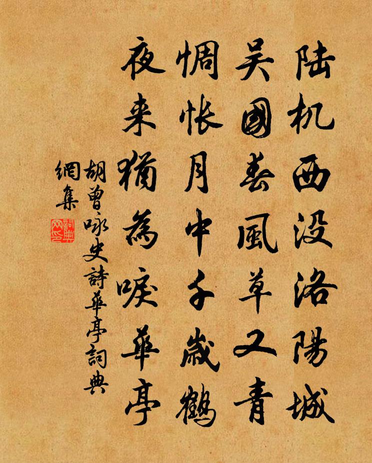 詩詞名句歷史字典書法欣賞書法字典國語詞典說文解字康熙字典古漢語字典標 題 作 者 詩 句 詠史詩華亭作者:胡曾 朝代:唐代詠史詩華亭原文陸機西沒洛陽城,吳國春風草又青。惆悵月中千歲鶴,夜來猶為唳華亭。詩詞問答問:詠史詩華亭的作者是誰?答:胡曾問:詠史詩華亭寫於哪個朝代?答:唐代問:詠史詩華亭是什麼體裁?答:七絕胡曾詠史詩華亭書法欣賞詠史詩華亭書法作品注釋全唐詩:卷647-54詩詞推薦元夕雨中偶成四絕奉寄東齋陳起〔宋代〕車駕行將享孟春,月收梅影可愁人。雨師不管閒舞舞,預向天街灑暗塵。晚題江館(一作晚秋江館書事寄姚郎中)周賀〔唐代〕病寄曲江居帶城,傍門孤柳一蟬鳴。澄波月上見魚擲,晚徑葉多聞犬行。越島夜無侵閣色,寺鐘涼有隔原聲。故園酹江月 上元夜觀月譚處端〔元代〕上元佳節,正一輪西步,天渠飛躍。素魄當空澄湛湛,獨現寒光無著。皓彩乾坤,無私遍照,萬古無瑕膜。渾如寶家國吟邵雍〔宋代〕邪正異心,家國同體。邪能敗亡,正能興起。挽葉子儀二首杜范〔宋代〕當年共短檠,心事熟論評。豈我非同志,於公不用情。幾多才莫試,有此恨難平。舊友凋零盡,悲哉伐木聲。荔子鄧肅〔宋代〕荔子有佳品,乃在府城東。我來方秀髮,黃雲幾萬重。遙知香味色,已具碎花中。憑欄一念足,不食意自充。人世偈頌三十六首釋如珙〔宋代〕般若如我大火聚,著得一絲飛毫麽。一拳拳倒黃鶴樓,一踢踢翻鸚鵡洲。有意氣時添意氣,不風流處也風流。西湖即事周文璞〔宋代〕閒看浮鳩棲曲渚,倦隨奔鹿上荒陵。松門雨過長廊靜,一架藤花供病僧。白紵歌孔稚珪〔南北朝〕山虛鐘磬徹。癸巳歲邑中大歉三七侄捐金散谷以濟艱食因成吳芾〔宋代〕吾家謂侄非常兒,自幼讀書嘗下帷。平居事母盡孝道,力供子職曾無違。辛勤農畝三十載,頓立門戶成家肥。恥同憶友葉茵〔宋代〕蕭蕭檐角雨,冉冉雨中舟。年老難於別,春寒重卻愁。風窗亂書葉,塵壁暗燈篝。夜半無來雁,披衣對小樓。偈頌十四首釋宗杲〔宋代〕無諸比丘名近悅,為母王氏請普說。妙喜便登曲錄床,忉忉怛怛恣饒舌。從來法本離言詮,不假思量與分雖。說甚再和十首蘇轍〔宋代〕張公詩社見公名。白首山城嘆不平。坐客要聞新樂府,應須湓口琵琶聲。感歡時事王邁〔宋代〕十家生聚發無聊,雞犬驚惶避使軺。昔日青苗猶出鏹,如今表紙作青苗。獅子岩黃夢攸〔宋代〕蛟龍躍,獅子吼,頭角崢嶸精神抖。若問破天荒,還我霹靂手。煮茶晏殊〔宋代〕稽山新茗綠如煙,靜挈都藍煮惠泉。未向人間殺風景,更持醪醑醉花前。和曹侍御除夜有懷薛能〔唐代〕有病無媒客,多慵亦太疏。自憐成叔夜,誰與薦相如。嗜退思年老,諳空笑歲除。跡閒過寺宿,頭暖近階梳。春立熊安生徐鈞〔宋代〕周禮宏深熟討論,鸞輿造請亦登門。雖居異壤人爭慕,縱閱千年書尚存。山居武元衡〔唐代〕身依泉壑將時背,路入煙蘿得地深。終歲不知城郭事,手栽林竹盡成陰。送余少卿知睦州梅堯臣〔宋代〕青山峽里桐廬郡,七里灘頭太守船。雲霧未開藏宿鳥,坡原將近見燒田。養茶摘蕊新春後,種橘收包小雪前。民事名句推薦厚祿故人書斷絕,恆飢稚子色淒涼。杜甫《狂夫》 橋成漢渚星波外,人在鸞歌鳳舞前。晏幾道《鷓鴣天·當日佳期鵲誤傳》 待小人不難於嚴,而難於不惡;待君子不難於恭,而難於有禮。洪應明《菜根譚·概論》 師也者,教之以事而喻諸德者也戴聖《禮記·文王世子》 青綾被,莫憶金閨故步晁補之《摸魚兒·東皋寓居》 波上馬嘶看棹去,柳邊人歇待船歸。溫庭筠《利州南渡》 水調數聲持酒聽。午醉醒來愁未醒。張先《天仙子·水調數聲持酒聽》 正見空江明月來,雲水蒼茫失江路。歐陽修《晚泊岳陽》 故國山川,故園心眼,還似王粲登樓。周密《一萼紅·登蓬萊閣有感》 酷暑天,葵榴發,噴鼻香十里荷花。白樸《得勝樂·夏》