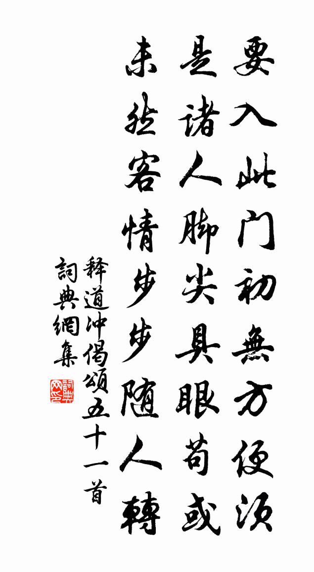 詩詞名句歷史字典書法欣賞書法字典國語詞典說文解字康熙字典古漢語字典標 題 作 者 詩 句 偈頌五十一首作者:釋道沖 朝代:宋代偈頌五十一首原文要入此門,初無方便。須是諸人,腳尖具眼。苟或未然,客情步步隨人轉。詩詞問答問:偈頌五十一首的作者是誰?答:釋道沖問:偈頌五十一首寫於哪個朝代?答:宋代釋道沖偈頌五十一首書法欣賞偈頌五十一首書法作品詩詞推薦九日山中宴集趙源〔宋代〕九日登臨老奈何,強將幽恨寄悲歌。疲欹巾帽愁風動,病著飢腸厭酒多。東嶺荒榛藏馬鬣,西岩空榻鎖蜂窠。獨憐偈頌一百四十一首釋師範〔宋代〕二由一有,一亦莫守。新羅日午打三更,回首面南看北斗。堪悲堪笑,黃面禪和到處行腳,只管將鼻孔東邊嗅西邊賢者之孝二百四十首趙琰林同〔宋代〕禮稱親未葬,喪服不除焉。食麥斷鹽味,悲哉四十年。新開小軒晁子西有詩以韻答之二首郭印〔宋代〕我無先世英,敢望燕台築。譬如坎井蛙,拘虛徒窘束。又如鷦鷯巢,所寄一枝足。名不聞公卿,跡非侶樵牧。眼花水調歌頭 長源被放,西歸長安,過予內鄉,元好問〔金代〕詩見及,因為賦此相思一尊酒,今日盡君歡。長歌一寫孤憤,西北望長安。鬱郁閶門軒蓋,浩浩龍津車馬,風雪一高齋誢事詩謝朓〔南北朝〕余雪映青山。寒霧開白日。曖曖江村見。離離海樹出。披衣就清盥。憑軒方秉筆。列俎歸單味。連駕止容膝。空為周伯神喜神贊白玉蟾〔宋代〕方丈老仙客,寸心水一滴。雙臉紅硃砂,兩眼點黑漆。白須撫掌笑呵呵,白鶴一去無人識。秋懷三十六首邵雍〔宋代〕草綠露沾衣,草衰風切肌。物情非作異,人意強生疑。岐動楊朱泣,絲添墨子悲。知之何太晚,徒自淚淋漓。縱筆二首劉克莊〔宋代〕風月佳時一放懷,幸無章綬束筋骸。眵昏端以親燈故,憂患皆從識字來。受業門人留不住,載醪客子盡教回。閉門沁園春(詠西湖酒樓)陳人傑〔宋代〕南北戰爭,惟有西湖,長如太平。看高樓倚郭,雲邊矗棟,小亭連苑,波上飛甍。太守風流,遊人歡暢,氣象邇來素梅 二二王冕〔元代〕月明曾過西湖路,愛看橫枝當水斜。試問玉堂諸學士,幾時清夢到山家?同諸友城南張園賞梅十首邵雍〔宋代〕春早梅花正爛開,生平不飲亦銜杯。城南盡日高台上,恰似江南去一回。櫻桃楊億〔宋代〕團於火色貝,燦極日光珠。西海瑤池苑,曾城寶樹區。鳳幘生猶嫩,龍睛未脫枯。彤標與霞彩,紫府閟雪腴。次韻黃玉如大章攜先集來訪二首許月卿〔宋代〕橋梓風流滿腹經,桂花香里識魁名。翻成宵夢古今事,何況人間父子情。先集一編詩橐富,家傳萬卷子金榮。掛名臨江仙(席上次韻韓文若)葉夢得〔宋代〕聞道安車來過我,百花未敢飄零。疾催弦管送杯行。五朝瞻舊老,揮麈聽風生。鳳詔遠從天上落,高堂燕喜初醒。石門黃庚〔宋代〕贏馬東山路,駸駸抵石門。落花春夜雨,流水暮煙村。久客悲行役,清愁攪夢魂。勞生多感慨,余恨付乾坤。王成之給事輓歌辭陸游〔宋代〕詩騷湘水客,風度曲江公。一夕南樓去,千秋東省空。囊封震朝右,墨敕絕宮中。贈極文昌貴,君恩厚飾終。未試即事雜書率用秋日同文館為首句張耒〔宋代〕名自諸侯選,功收一日長。文章雜蛟蚓,丹墨有淡涼。平昔曾充貢,酸寒未易忘。書生成底事,飽死笑東方。柳梢青佚名〔宋代〕荷綻花繁。蓂開六莢,喜溢門闌。好是驂鸞,特離月殿,來駐人間。兒童歌舞衣班。接踵升堂視笑顏。祝頌勤拳,自命上官統〔宋代〕官氏亘古至於今,歷派源流振家聲。吾今生爾九兄弟,各在一方以安身。人人立志守豪富,個個撐持家業均。但今名句推薦有梅無雪不精神,有雪無詩俗了人。盧梅坡《雪梅·其二》 人有喜慶,不可生妒忌心;人有禍患,不可生喜幸心。朱柏廬《朱子家訓·全文》 群峭碧摩天,逍遙不記年李白《尋雍尊師隱居》 見善則遷,有過則改。佚名《易傳·象傳下·益》 細草微風岸,危檣獨夜舟。杜甫《旅夜書懷》 林花謝了春紅,太匆匆。無奈朝來寒雨晚來風。李煜《相見歡·林花謝了春紅》 紅酥手,黃縢酒,滿城春色宮牆柳。陸游《釵頭鳳·紅酥手》 欲系青春,少住春還去。朱淑真《蝶戀花·送春》 西湖到日,重見梅鈿皺。吳文英《瑞龍吟·送梅津》 東面望者不見西牆,南鄉視者不睹北方呂不韋《呂氏春秋·覽·有始覽》