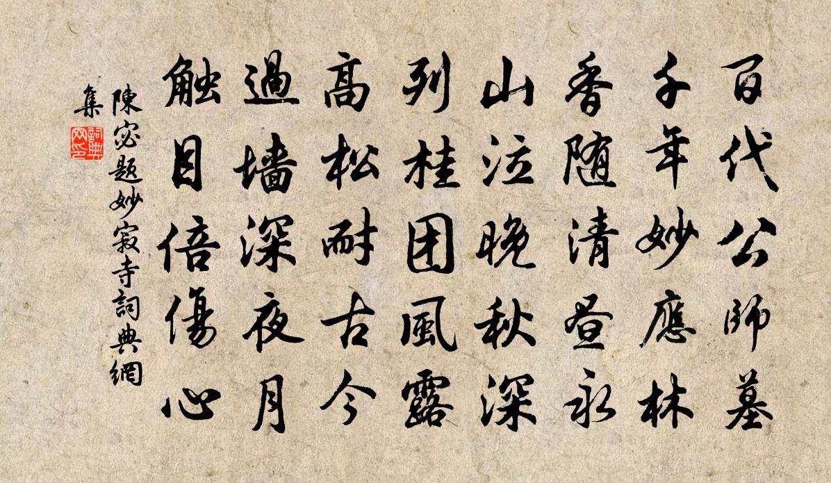 詩詞名句歷史字典書法欣賞書法字典國語詞典說文解字康熙字典古漢語字典標 題 作 者 詩 句 題妙寂寺作者:陳宓 朝代:宋代題妙寂寺原文百代公師墓,千年妙應林。香隨清晝永,山泣晚秋深。列桂團風露,高松耐古今。過牆深夜月,觸目倍傷心。詩詞問答問:題妙寂寺的作者是誰?答:陳宓問:題妙寂寺寫於哪個朝代?答:宋代陳宓題妙寂寺書法欣賞題妙寂寺書法作品詩詞推薦搗練子黃庭堅〔宋代〕梅凋粉,柳搖金。微雨輕風斂陌塵。厚約深盟何處訴,除非重見那人人。凌虛台郭印〔宋代〕高台收晚照,遠思浩無窮。竹里清飈泛,山高翠靄蒙。九層平可上,一徑曲能通。誰揭凌虛字,名浮亦未公。小飛來亭二首楊長孺〔宋代〕拔地齊天可上不,倚岩危棧半空浮。偶然憶得垂堂戒,前猛還成新懦休。綿蠻佚名〔先秦〕綿蠻黃鳥,止於丘阿。道之雲遠,我勞如何。飲之食之,教之誨之。命彼後車,謂之載之。綿蠻黃鳥,止於丘隅。出德清縣張鎡〔宋代〕天公有意作詩顛,入得苕溪未見蓮。先放水葓圍半時,硬功夫將蘆葉界平川。明金扇日停蒼渚,碧玉環山吐白煙。客至當飲酒二首王安石〔宋代〕天提兩輪光,環我屋角走。自從紅顏時,照我至白首。累累地上土,往往平生友。少年所種樹,磥砢行復朽。古人逍遙詠宋太宗〔宋代〕世界諸方聖,如同在眼前。其於通要妙,便見理深玄。法教窮難盡,周知本自然。信誠含萬象,秘隱口親宣。黃朝散輓詩朱長文〔唐代〕江湖嘗佩左符歸,一臥漳濱素願違。平日華旌過里巷,此時丹旐下岩扉。群峰拱揖開新穴,萬木森羅條舊圍。佇看嘲白髮王安石〔宋代〕久應飄轉作蓬飛,眷惜冠巾未忍違。種種春風吹不長,星星明月照還稀。寄舊同游李復〔宋代〕去鄉甲子四十二,歸路山川九百三。長河無鯉來東北,遠夢隨月轉西南。檐花雨落春獨酌,窗竹燈寒夜對談。石上武陵春晏幾道〔宋代〕九日黃花如有意,依舊滿珍叢。誰似龍山秋興濃,吹帽落西風。年年歲歲登高節,歡事旋成空。幾處佳人此會同,李供奉彈箜篌歌顧況〔唐代〕國府樂手彈箜篌,赤黃絛索金鎝頭。早晨有敕鴛鴦殿,夜靜遂歌明月樓。起坐可憐能抱撮,大指調弦中指撥。腕頭江天暮景有嘆二首楊萬里〔宋代〕只爭一水是江淮,日暮風高雲不開。白鷺倦飛波政闊,都從淮上過江來。水調歌頭李訦〔宋代〕足跡半天下,家說在瓊州。往來無定,蓬頭垢面任憎嫌。揮掃筆頭萬字,貫穿胸中千古,不記受生年。海角一相遇高兄徐倉高弟和劉公之兩絕見寄再韻謝之杜范〔宋代〕袖手閒居德日新,靜安增伴四時春。君方入室慰此老,肯作浮陽愧古人。偈頌一百五十首釋心月〔宋代〕青山為家,白雲作戶。穩密田園,鴉飛不度。皷腹台前一轉頭,不覺四月二十五。古風其三十六李白〔唐代〕抱玉入楚國。見疑古所聞。良寶終見棄。徒勞三獻君。直木忌先伐。芳蘭哀 * 。盈滿天所損。沉冥道為群。東海三部樂(榴花)楊 * 〔宋代〕濃綠叢中,露半坼芳苞,自然奇絕。水亭風檻,正是蕤賓之月。固知道、春色無多,但絳英數點,照眼先發。為君宿泊孟津寄三堂友人韋莊〔唐代〕解纜西征未有期,槐花又逼桂花時。鴻臚陌上歸耕晚,金馬門前獻賦遲。只恐愁苗生兩鬢,不堪離恨入雙眉。分明題壁(人有以爐火藥術為事者,辭大哂之,命筆題其壁)張辭〔唐代〕爭那金烏何,頭上飛不住。紅爐漫燒藥,玉顏安可駐。今年花發枝,明年葉落樹。不如且飲酒,莫管流年度。名句推薦舍南舍北皆春水,但見群鷗日日來。杜甫《客至》 誰念遷客歸來,老大傷名節。李綱《六么令·次韻和賀方回金陵懷古鄱陽席上作》 人煙寒橘柚,秋色老梧桐。李白《秋登宣城謝朓北樓》 孤飛一片雪,百里見秋毫。李白《觀放白鷹二首》 天相漢,民懷國。史達祖《滿江紅·九月二十一日出京懷古》 百二禁兵辭象闕,三千宮女下龍舟。許渾《汴河亭》 相思一夜窗前夢,奈個人、水隔天遮。王沂孫《高陽台·和周草窗寄越中諸友韻》 放眼暮江千頃,中有離愁萬斛,無處落征鴻。楊炎正《水調歌頭·把酒對斜日》 佳人彩雲里,欲贈隔遠天。李白《折荷有贈》 夜聽胡笳折楊柳,教人意氣憶長安。王翰《涼州詞二首》