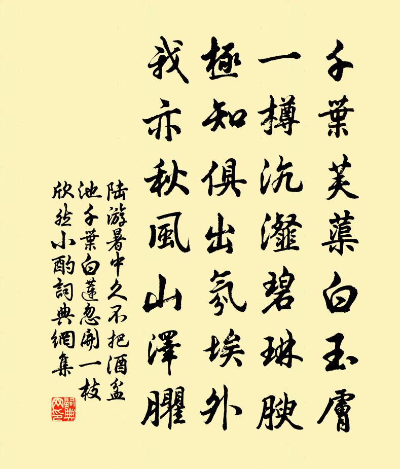 詩詞名句歷史字典書法欣賞書法字典國語詞典說文解字康熙字典古漢語字典標 題 作 者 詩 句 暑中久不把酒盆池千葉白蓮忽開一枝欣然小酌作者:陸游 朝代:宋代原文千葉芙蕖白玉膚,一樽沆瀣碧琳腴。極知俱出氛埃外,我亦秋風山澤臞。詩詞問答問:《暑中久不把酒盆池千葉白蓮忽開一枝欣然小酌》的作者是誰?答:陸游問:該詩寫於哪個朝代?答:宋代問:陸游的名句有哪些?答:陸游名句大全書法欣賞暑中久不把酒盆池千葉白蓮忽開一枝欣然小酌書法作品詩文賞析原題:暑中久不把酒盆池千葉白蓮忽開一枝欣然小酌因賦絕句詩詞推薦天仙子和凝〔唐代〕柳色披衫金縷鳳,縴手輕捻紅豆弄。翠娥雙斂正含情,桃花洞,瑤台夢,一片春愁誰與共。和宋永兄罷官還家途中見寄四絕黃公度〔宋代〕流年忽忽雙蓬鬢,薄宦紛紛一旅亭。惟有長官衫色在,至今猶與眼俱青。賢者之孝二百四十首古初林同〔宋代〕長沙有孝子,姓字死猶香。料得郡舉首,他無人敢當。五更仇遠〔宋代〕山寺鐘未鳴,城樓角已奏。角聲正可聽,欹枕續殘漏。晚春初夏八首張耒〔宋代〕古柳參天鳴啄木,青蕪覆地下鳴鳩。白頭懶作留春計,睡起移時獨倚樓。玉樓春晏幾道〔宋代〕一尊相遇春風裡。詩好似君人有幾。吳姬十五語如弦,能唱當時樓下水。良辰易去如彈指。金盞十分須盡意。明朝酬李紺歲除送酒雍陶〔唐代〕歲盡貧生事事須,就中深恨酒錢無。故人充壽能分送,遠客消愁免自沽。一夜四乘傾鑿落,五更三點把屠蘇。已供晚發鹹陽,寄同院遺補李嘉祐〔唐代〕征戰初休草又衰,鹹陽晚眺淚堪垂。去路全無千里客,秋田不見五陵兒。秦家故事隨流水,漢代高墳對石碑。回首八月八日發潭州後得絕句四十首趙蕃〔宋代〕露冷初疑是曉霜,風高已覺愛朝陽。莫雲節變能如此,直念吾衰不復強。金剛隨機無盡頌不受不貪分第二十八釋印肅〔宋代〕古今人易老,無異霜凋草。本根依舊青,不解尋元討。次韻晁大舅祖子應趙蕃〔宋代〕離騷皎皎在湖湘,冀北茫茫失乘黃。徒手豈能探虎穴,敝車安得繞羊腸。外家文律況吾祖,有作歲時常一囊。天遣讀書樓二首洪咨夔〔宋代〕引卻蜂衙一事無,求師尚友聖賢俱。激昂意氣中興頌,收斂身心太極圖。畲火明邊飢虎過,渡船聲外老鶬呼。江南再次韻奉答子由黃庭堅〔宋代〕蠆尾銀鉤寫珠玉,剡藤蜀繭照松煙。似逢海若談秋水,始覺醯雞守瓮天。何日清揚能覿面,只今黃落又凋年。萬錢秋色黃庚〔宋代〕虹影界開微慘澹,雁痕點破更淒清。一番雨過天容碧,儘是西風染得成。秋夜對雨董嗣杲〔宋代〕對月飛觴往事休,胡床寂寞瘐公樓。西風解使蛩專夜,長日能無酒送愁。新雁陣分離塞徼,殘螢火死落汀流。醉來李士舉見寄次韻為謝二首晁公溯〔宋代〕想見山靈喜,如看柱史來。江清無急硤,野潤失飛埃。行攬孟博轡,再然安國灰。相過忍遽別,莫放錦帆開。代謝人見惠墨竹朱淑真〔宋代〕紛紛桃李皆凡俗,四時之中惟有竹。非惟蒼悴列風輕,對之自覺清人肉。羨君年少多才藝,筆墨潛偷造化力。掃出送洞元法師歸茅山三首蔡肇〔宋代〕一庵疇昔共嶔崯,古木垂阻歲月深。恐是三生房次律,要隨藤杖去重尋。閏正月三日偶書二首李覯〔宋代〕一步寒郊一慘眉,望春春色苦來遲。東君未必私桃李,只恐梅花謝有時。雙鵲白玉蟾〔宋代〕蒼然東阿松,上有烏鵲枝。雙雙噪西風,而背夕陽歸。雙飛復雙止,長與蒼松期。飢啄鼎(左口中邕左隹)囀巔,名句推薦夕陽無限好,只是近黃昏。李商隱《樂遊原 / 登樂遊原》 因病得閒殊不惡,安心是藥更無方。蘇軾《病中游祖塔院》 臣聞君子樂得其志,小人樂得其事。姜子牙《六韜·文韜·文師》 清香隨風發,落日好鳥歸。李白《詠鄰女東窗海石榴》 惟有河邊雁,秋來南向飛。庾信《重別周尚書》 香爐瀑布遙相望,回崖沓嶂凌蒼蒼。李白《廬山謠寄盧侍御虛舟》 日落君山雲氣,春到沅湘草木,遠思渺難收。張孝祥《水調歌頭·過岳陽樓作》 金剛則折,革剛則裂。劉向《說苑·敬慎》 相知無遠近,萬里尚為鄰。張九齡《送韋城李少府》 首夏猶清和,芳草亦未歇。謝靈運《游赤石進帆海》