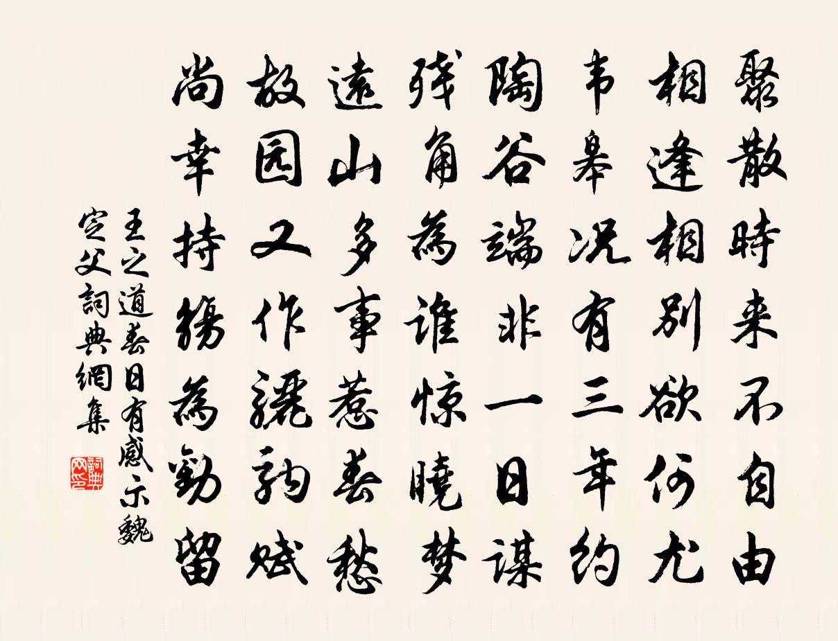 詩詞名句歷史字典書法欣賞書法字典國語詞典說文解字康熙字典古漢語字典標 題 作 者 詩 句 春日有感示魏定父作者:王之道 朝代:宋代春日有感示魏定父原文聚散時來不自由,相逢相別欲何尤。韋皋況有三年約,陶谷端非一日謀。殘角為誰驚曉夢,遠山多事惹春愁。故園又作驪駒賦,尚幸持觴為勸留。詩詞問答問:春日有感示魏定父的作者是誰?答:王之道問:春日有感示魏定父寫於哪個朝代?答:宋代王之道春日有感示魏定父書法欣賞春日有感示魏定父書法作品詩詞推薦初一夜月詩蘇福〔宋代〕氣朔盈虛又一初,嫦娥應事半分無。都於無處分明有,恰似先天太極圖。次韻南軒先生榕溪閣閣山谷所名也吳儆〔宋代〕紹聖用事臣,黨與紛相樛。當代幾忠良,一朝鹹黜幽。太史坐直筆,愈黜名愈休。消長關否泰,天意匪人謀。纍臣浣溪沙 冬日喜晴宋褧〔元代〕萬瓦輕霜愛日明。遊絲來往似春晴。幽禽弄暖百般聲。斑竹乍翻經夏籜,綠池猶泛過秋萍。溪橋誰共探梅行。秋夜憶親庭有感釋紹嵩〔宋代〕碧澗寒侵屋,高林露氣清。空窗閒月色,密竹動秋聲。宴坐游三昧,鄰談喧五更。兩親今正老,此別不勝情。尋廬山崔征君丘為〔唐代〕日高雞犬靜,門掩向寒塘。夜竹深茅宇,秋亭冷石床。住山年已遠,服藥壽偏長。虛棄浮生者,相逢益自傷。惜別行送劉僕射判官(僕射乃其主將劉乃僕射之判官也)杜甫〔唐代〕聞道南行市駿馬,不限匹數軍中須。襄陽幕府天下異,主將儉省憂艱虞。只收壯健勝鐵甲,豈因格鬥求龍駒。而今浪淘沙(再和)張榘〔宋代〕雨過暮天南。高下青巒。小樓燕子話春寒。多少夕陽芳草地,霧掩煙漫。別恨正相關。心上眉間。離歌一曲間悲歡用李參政韻並錄寄舟峰師四首曹勛〔宋代〕海色琉璃照我肝,何疑飛電掣晴岩。山留畫鷁風從怒,珠炯翔龍夜亦銜。蓮社經徒能能摘句,玉川茶興自開緘。從送嚴侍御武元衡〔唐代〕巴檄故人去,蒼蒼楓樹林。雲山千里合,霧雨四時陰。峽路猿聲斷,桃源犬吠深。不須貪勝賞,漢節待南侵。題林夢馨本朝雜詠劉克莊〔宋代〕二百新題字四千,庚申已後甲寅前。繼周可以知百世,續漢誰曾到八年。江左重修泰陵錄,水心絕重建隆編。何時挽故知容州朝請陶公章陳棨〔宋代〕靖節高風去千載,至今遺響在平塘。洗耳洗心甘綠野,濯纓濯足付滄浪。松間月色詩千首,竹里棋聲酒幾觴。正受田家釋文珦〔宋代〕田家翁媼頗自適,翁解耕耘婦能織。官中租賦無稽違,所養牛羊亦蕃息。歲時力作不徒勞,桑柘滿園禾黍高。皆因對食陸游〔宋代〕天賦元無滿谷羊,不煩粱肉污龜腸。忽逢客釜蓴羹美,遙憶山廚麥飯香。正有一簞元自足,縱嘲三韭亦何傷?江邊雜興二首高翥〔宋代〕新分菊本自鋤山,手縛枯藤作矮闌。比似著書空用力,種花猶得一年看。壬辰天中節,赴平江錫燕,因懷去年以侍臣攝范成大〔宋代〕去歲排場德壽宮,薰風披拂酒鱗紅。小臣供奉金龍醆,親到虛皇玉座東。天中繖動玉輿來,萬歲三聲徹九街。想見靈岩禪寺王大寶〔宋代〕雁盪聞名久,靈岩舍道邊。諸峰皆列岫,一柱獨擎天。卓筆豈容有,展旗非偶然。眼前無障礙,自是洞中仙。水龍吟趙汝鈉〔宋代〕露華洗盡凡妝,玉妃來侍瑤池宴。風裳水佩,冰肌雪艷,清涼不汗。解語情多,凌波步穩,酒容易散。想溫泉浴罷九日懷聶之美司馬光〔宋代〕太室橫山蔽千里,相思空復上高台。瓮頭白酒行當熟,離下黃花稍復開。陶令不無同醉興,孟君況有解嘲才。欲愚徐鳧岩釋鑒〔宋代〕蕭然上方境,人稀知地僻。徙聞古仙人,石上有遺蹟。上元楊億〔宋代〕天碧銀河欲下來,月華如水浸樓台。誰將萬斛金蓮子,撤向星都五夜開。名句推薦因依老宿發心初,半學修心半讀書。王建《寄舊山僧》 若非群玉山頭見,會向瑤台月下逢李白《清平調·其一》 物是人非事事休,欲語淚先流。李清照《武陵春·春晚》 明足以察秋毫之末,而不見輿薪,則王許之乎?孟子《孟子·梁惠王章句上·第八節》 漁父天寒網罟凍,莫徭射雁鳴桑弓。杜甫《歲晏行》 數萼初含雪,孤標畫本難。崔道融《梅花》 知人者智,自知者明。老子《老子·道經·第三十三章》 反者道之動;弱者道之用。老子《老子·德經·第四十章》 黃葉古祠寒雨積,清山荒冢白雲多。于謙《岳忠武王祠》 世事漫隨流水,算來一夢浮生。李煜《烏夜啼·昨夜風兼雨》