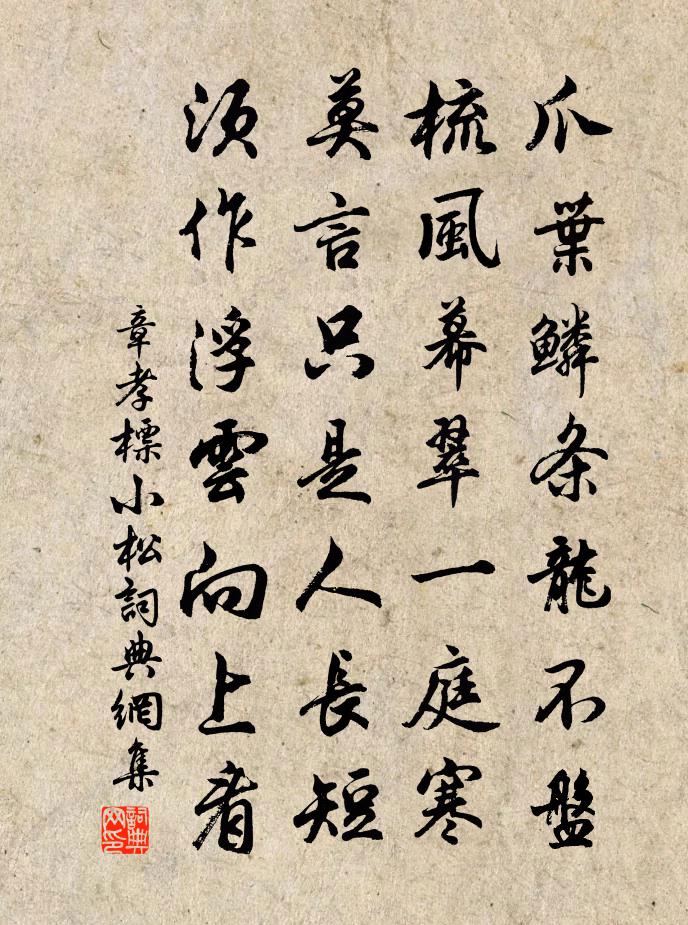 詩詞名句歷史字典書法欣賞書法字典國語詞典說文解字康熙字典古漢語字典標 題 作 者 詩 句 小松作者:章孝標 朝代:唐代小松原文爪葉鱗條龍不盤,梳風幕翠一庭寒。莫言只是人長短,須作浮雲向上看。詩詞問答問:小松的作者是誰?答:章孝標問:小松寫於哪個朝代?答:唐代問:小松是什麼體裁?答:七絕章孝標小松書法欣賞小松書法作品注釋全唐詩:卷506-56詩詞推薦春日憶平陽郡博士大雲心兄章粲〔宋代〕東風歸林園,雲日靉春事。靜觀化道伸,良感幽貞利。煙芳生暮愁,晴思起新思。有酒誰見同,惻惻夜亡寐。送韓司直路出延陵(一作劉長卿詩)郎士元〔唐代〕游吳還適越,來往任風波。復送王孫去,其如春草何。岸明殘雪在,潮滿夕陽多。季子留遺廟,停舟試一過。踏雲行 激發丹陽王哲〔元代〕東海汪洋,西山詳審。金鉤釣得歡無恁。一頭活樂大鯨魚。萬鱗燦爛鋪白錦。隨我遨遊,水雲信任。青山綠水相過喜照密閒實四上人見過白居易〔唐代〕紫袍朝士白髯翁,與俗乖疏與道通。官秩三回分洛下,交遊一半在僧中。臭帑世界終須出,香火因緣久願同。齋後好事近(程繼誠生日)王之道〔宋代〕霞影入瑤觴,酒與餘霞同色。人共昌朝方永,過觥籌三百。一枝紅皺石榴裙,簾卷篆煙碧。約我他年湖上,看九華漢宮李覯〔宋代〕哀平外立國權分,只為當時乏嗣君。試問莽新誰佐命,最應飛燕是元勛。次韻蘇翰林廄馬好頭赤晁補之〔宋代〕君不見崑崙龍種非凡肉,不但蹄高耳批竹。區區吳蜀有二駿,跳過斷橋飛出谷。萬蹄縱牧原野赤,汧隴收駒日復日餞魏州判鵬舉邵桂子〔宋代〕松下吟喔幾唱酬,卻攜螃蟹餞監州。穩挑書擔去環碧,頻寄詩筒來雪舟。畢姓弟兄千里月,故山泉石一天秋。葛峰宿正覺寺曾季貍〔宋代〕月落僧窗暗,衾單客夢驚。雞吟催客起,犬吠惡人行。蓐食事已畢,膏車天未明。畏塗飢餓歲,哪能得事宵征。予頃至鄞中常館同叔之筠軒修篁交陰奇石中峙孫應時〔宋代〕玉立眾君子,岩瞻一丈夫。老蒼何突兀,密節各敷腴。風日清如許,塵埃到得無。主人三益友,不厭著臞儒。送洛陽韓丞東遊韋應物〔唐代〕仙鳥遊戲何飄颻,遊戲綠衣翠為遊戲襟。顧我差池羽,咬咬懷好音。徘徊洛陽中,遊戲清川潯。神交不在結,歡愛聞前王使君在澤潞居貫休〔唐代〕為善無近名,竊名者得聲不如心,誠哉是言也。使君聖朝瑞,乾符初刺婺。德變人性靈,筆變人風土。煙霞與蟲鳥呈陳和叔二首王安石〔宋代〕數椽庳屋茨生草,三畝荒園種晚蔬。永日終無一杯酒,可能留得故人車。日暮至湖上陸游〔宋代〕籃輿晚繞湖,樂此新秋涼。粉落竹方老,紅凋荷更香。天宇無纖雲,仰視鴻鵠翔。小樓久不登,撫檻悲慨慷。浮生驀山溪賀鑄〔宋代〕畫橋流水,宛是南州路。轉柁綠楊灣,恍然間、青樓舊處。迴腸斷盡,猶剩爾多愁,記新聲,懷昵語。依約對眉宇次韻姜邦傑見訪留贈三詩張鎡〔宋代〕何曾一事擾中扃,醉便投床林亦清。書卷猶嫌舊時習,未能熟處放教生。感舊四首黃景仁〔清代〕大道青樓望不遮,年時系馬醉流霞。風前帶是同心結,杯底人如解語花。下杜城邊南北路,上闌門外去來車。匆匆次韻任君官舍秋雨黃庭堅〔宋代〕牆根戢戢數蝸牛,雨長垣衣亭更幽。驚起歸鴻不成字,辭柯落葉最知秋。菊花莫恨開時晚,谷穟猶思晴後收。獨立紹興以後時享二十五首真宗〔宋代〕冠佩雍容,時惟上公。享於清齋,陟降彌恭。籩豆靜嘉,粢盛潔豈。孝孫有慶,萬福來同。南柯子 七夕吟馬鈺〔元代〕天上初流火,人間乍變秋。鵲橋銀漢瑞雲浮。織女今宵,何處喚牽牛。閨女離閨閣,無愁自起愁。焚香乞巧拜無休名句推薦登山則情滿于山,觀海則意溢於海劉勰《文心雕龍·神思》 太乙近天都,連山接海隅王維《終南山》 集韻增廣,多見多聞。佚名《增廣賢文·上集》 二月湖水清,家家春鳥鳴。孟浩然《春中喜王九相尋 / 晚春》 不可以身相得見如來。鳩摩羅什譯《金剛經·如理實見》 明日近長安,客心愁未闌。納蘭性德《菩薩蠻·白日驚飈冬已半》 羈旅長堪醉,相留畏曉鍾。戴叔倫《客夜與故人偶集 / 江鄉故人偶集客舍》 子用私道者家必亂,臣用私義者國必危。劉向《戰國策·趙二·趙燕後胡服》 苦雨思白日,浮云何由卷。李白《玉真公主別館苦雨贈衛尉張卿二首》 篤志而體,君子也。荀子《荀子·修身》