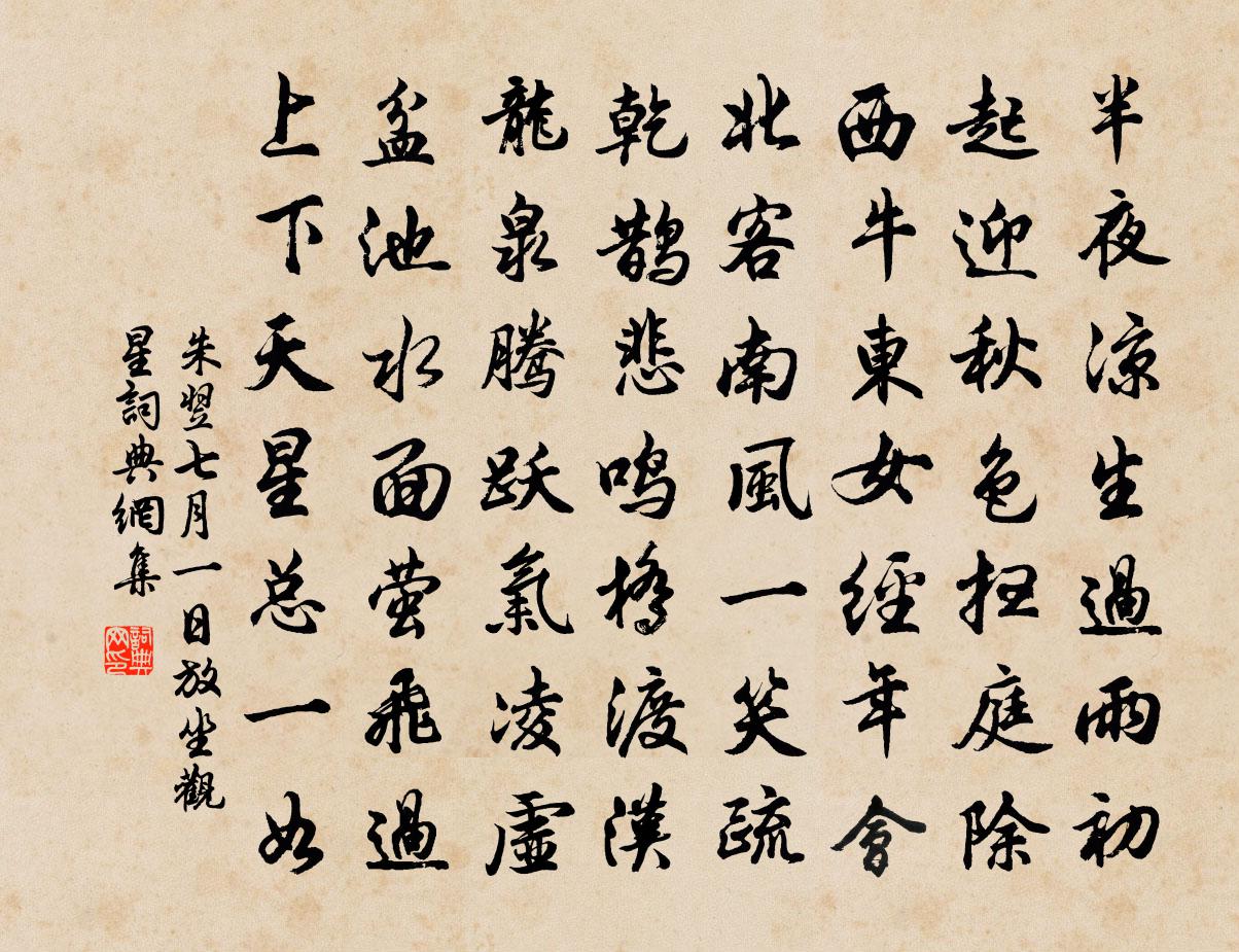 詩詞名句歷史字典書法欣賞書法字典國語詞典說文解字康熙字典古漢語字典標 題 作 者 詩 句 七月一日放坐觀星作者:朱翌 朝代:宋代七月一日放坐觀星原文半夜涼生過雨初,起迎秋色掃庭除。西牛東女經年會,北客南風一笑疏。乾鵲悲鳴橋渡漢,龍泉騰躍氣凌虛。盆池水面螢飛過,上下天星總一如。詩詞問答問:七月一日放坐觀星的作者是誰?答:朱翌問:七月一日放坐觀星寫於哪個朝代?答:宋代朱翌七月一日放坐觀星書法欣賞七月一日放坐觀星書法作品詩詞推薦寄題陳憲郎中竹軒蘇轍〔宋代〕家有修篁綠滿軒,趨庭詩禮舊忘言。凌霜自得良朋友,過雨時添好子孫。試翦輕筠扶野步,旋收涼葉煮清樽。風流曲江鄭谷〔唐代〕細草岸西東,酒旗搖水風。樓台在煙杪,鷗鷺下沙中。翠幄晴相接,芳洲夜暫空。何人賞秋景,興與此時同。上茶使趙伯川度正〔宋代〕六陽浩蕩奏薰風,白雨肥梅纂纂紅。學到狼胡心湛湛,性同麟趾步融融。已鋤漢戚更王化,行建周宗輔聖聰。師友雜曲歌辭君子有所思行僧貫休〔唐代〕我愛正考甫,思賢作商頌。我愛揚子云,理亂皆如鳳。振衣中夜起,露花香旖旎。撲碎驪龍明月珠,敲出鳳凰五色送客不及劉筠〔宋代〕日上旗亭第五重,百壺春釀與誰同。黃山遠隔奔霽騎,紫塞孤飛避弋鴻。湘竹几時休染淚,楚旌終日自搖風。此情柳梢青姬翼〔元代〕明徹口頭三昧,拂跡便、忘言守拙。古道潛通,先賢冥會,太平時節。長安陌上縱橫,更不在、拈花摘葉。處處圓詠談容娘常非月〔唐代〕舉手整花鈿,翻身舞錦筵。馬圍行處匝,人壓看場圓。歌要齊聲和,情教細語傳。不知心大小,容得許多憐。秋夜待月李石〔宋代〕白毫光里玉魂飛,留看常娥醉魄迷。一任檐牙沸蝙蝠,忍將明鏡照狐狸。已亥雜詩 48龔自珍〔清代〕萬事源頭必正名,非同綜核漢公卿。時流不沮狂生議,側立東華儜佩聲。題孫端甫別墅葉紹翁〔宋代〕幽居地僻少人知,野水春風枳樹籬。檢歷預尋移竹日,題牆閒記種花時。堪嗤狡兔須三窟,只學鷦鷯占一枝。淨掃奉和聖制送張說上集賢學士賜宴(賦得西字)韋抗〔唐代〕廣庭臨璧沼,多士侍金閨。英宰文儒葉,明君日月齊。集賢光首拜,改殿發新題。早夏初移律,餘花尚拂溪。壺觴品令陳允平〔宋代〕玉壺塵靜。蟾光透、一簾疏影。偏愛水月樓台近。畫闌獨倚,風度寒香陣。猶記曲江煙水恨。嘆淒涼誰問。夜深沙岸行洪咨夔〔宋代〕少年血氣暗消磨,盎盎陽春保大和。已放杏花風味短,未酸梅子典刑多。一官滿去魚無餌,萬里歸來燕有窠。但願贈史坑冶二首袁燮〔宋代〕公子詞鋒莫敢當,更兼世故飽更嘗。區區殘寇猶侵侮,願試胸中卻敵方。燕歌行高適〔唐代〕開元二十六年,客有從御史大夫張公出塞而還者,作《燕歌行》以示適。感征戍之事,因而和焉。漢家煙塵在東北次韻耿薦可催菊三首仲並〔宋代〕年來花意亦難猜,陶令東籬獨未開。伴賦落英吾豈敢,狂言聊復為君催。送僧歸嚴陵郯韶〔元代〕春船上瀨急,歸路石濺濺。白石百花靜,清江初月圓。偶逢林下叟,為話竹間禪。明發遙相憶,青山生莫煙。秋感杜牧〔唐代〕金風萬里思何盡,玉樹一窗秋影寒。獨掩柴門明月下,淚流香袂倚闌乾。次雨中暖房韻洪皓〔宋代〕首夏霜淫似早秋,坐邀車馬愧無由。提壺見就傾三爵,具饌何嘗選百羞。剛道暖房排旅悶,實圖求友慰幽囚。言歸五月十一日睡起陸游〔宋代〕病眼慵於世事開,虛堂高臥謝氛埃。簾櫳無影覺雲起,草樹有聲知雨來。茶碗嫩湯初得乳,香篝微火未成灰。翛然名句推薦訪戴歸來,尋梅懶去,獨釣無聊。薛昂夫《蟾宮曲·雪》 妾本秦羅敷,玉顏艷名都。李白《陌上桑》 流水本自斷人腸,堅冰舊來傷馬骨。盧思道《從軍行》 見碧水丹山,黃蘆苦竹。宋江《滿江紅·喜遇重陽》 樓台處處迷芳草,風雨年年怨落花。曾棨《維揚懷古》 葡萄美酒夜光杯,欲飲琵琶馬上催。王翰《涼州詞二首·其一》 非我而當者,吾師也;是我而當者,吾友也;諂諛我者,吾賊也。荀子《荀子·修身》 民之從事,常於幾成而敗之。老子《老子·德經·第六十四章》 君看石芒碭,掩淚悲千古李白《丁督護歌》 樂殊貴賤,禮別尊卑。周興嗣《千字文·全文》