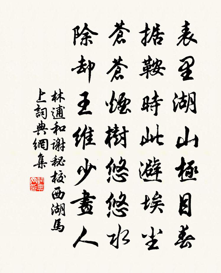 詩詞名句歷史字典書法欣賞書法字典國語詞典說文解字康熙字典古漢語字典標 題 作 者 詩 句 和謝秘校西湖馬上作者:林逋 朝代:宋代和謝秘校西湖馬上原文表里湖山極目春,據鞍時此避埃塵。蒼蒼煙樹悠悠水,除卻王維少畫人。詩詞問答問:和謝秘校西湖馬上的作者是誰?答:林逋問:和謝秘校西湖馬上寫於哪個朝代?答:宋代林逋和謝秘校西湖馬上書法欣賞和謝秘校西湖馬上書法作品詩詞推薦予酷愛桂香置兩枝於蕭寺之寓室日出不得對花陳文蔚〔宋代〕惜午故剪碧雲枝,卻負花香花有辭。為輟清眠陪永夜,月窗相對恰相宜。杏溪十首蓮塘姚合〔唐代〕方塘菡萏高,繁艷相照耀。幽人夜眠起,忽疑野中燒。曉尋不知休,白石岸亦峭。賡沈贊府題二陸草堂衛宗武〔宋代〕二俊書堂歷幾秋,風雲壯志浩難收。儻知蓴美過斗酪,應返故山尋勝游。中丞嚴公雨中垂寄見憶一絕,奉答二絕杜甫〔唐代〕雨映行宮辱贈詩,元戎肯赴野人期。江邊老病雖無力,強擬晴天理釣絲。何日雨晴雲出溪,白沙青石先無泥。只須小勞劉克莊〔宋代〕性不耐閒懶,小勞方小佳。鋸沉成薄片,末麝入新芽。以同心之言其臭如蘭為韻寄李子先黃庭堅〔宋代〕流水鳴無意,白雲出無心,水得平淡處,渺渺不厭深。雲行不能雨,還歸碧山岑。斯人似雲水,廊廟等山林。呈齡叟二首陳著〔宋代〕老師神用笑談中,不但能降大小空。自謂我心頑似鐵,也隨柳絮舞春風。雜曲歌辭。胡渭州佚名〔唐代〕亭亭孤月照行舟,寂寂長江萬里流。鄉國不知何處是,雲山漫漫使人愁。楊柳千尋色,桃花一苑芳。風吹入簾里,雜興方岳〔宋代〕百年一瞬息,萬事皆塵埃。所以身後名,不如掌中杯。山園足花草,雨露相先開。獨有崖下松,春風不曾來。青林東風第一枝(梅)王之道〔宋代〕玉骨冰肌,絳趺檀口,玲瓏亞竹當戶。嫣然照雪精神,消得東君眷與。群芳退舍,顧凡下、非伊朋侶。卻自有、薝霞外亭二首劉應時〔宋代〕詩眼眈眈細八荒,小亭徙倚濕山光。飛鴻影落遙岑外,興與飛鴻更渺茫。漣上別王秀才高適〔唐代〕飄颻經遠道,客思滿窮秋。浩蕩對長漣,君行殊未休。崎嶇山海側,想像無前儔。何意照乘珠,忽然欲暗投。東路次韻邦直見答二首蘇轍〔宋代〕真能一醉逃煩暑,定勝三杯御臘寒。自有詩書供永日,莫將絲竹亂風灘。舞雩何處歸春莫,叩角誰人怨夜漫。聞道冬青花林景熙〔宋代〕冬青花,花時一日腸九折。隔江風雨晴影空,五月深山護微雪。石根雲氣龍所藏,尋常螻蟻不敢穴。移來此種非人感興薛嵎〔宋代〕簞瓢吾道在,此樂語人難。遺卻形骸累,始知天地寬。遠山不辨樹,高屋易生寒。數夜雪風忽,編蘆壁未完。褒禪山有於湖所題寶塔二字羅點〔宋代〕古剎浮屠映碧山,狀元題墨最為嫻。遊人倦憩塵心寂,雲自青天水自閒。寓壺源僧舍三絕吳儆〔宋代〕風檐淅淅褪新青,書展殘燈翳復明。讀罷離騷還獨坐,此時此夜若為情。寒食雨中,同舍約游天竺,得十六絕句呈陸務楊萬里〔宋代〕老檜如憧翠接連,山茶作塔綠縈纏。山僧相識渾相忘,不到山中十五年。題延福寺釋宗美〔宋代〕倚檻寒松偃,連雲一徑橫。就中國不得,窗戶入江聲。鵲橋仙(為人慶八十席間戲作)辛棄疾〔宋代〕朱顏暈酒,方瞳點漆,閒傍松邊倚杖。不須更展畫圖看,自是個、壽星模樣。今朝盛事,一杯深勸,更把新詩齊唱名句推薦知一切法無我。得成於忍。鳩摩羅什譯《金剛經·不受不貪》 玄都觀里桃千樹,儘是劉郎去後栽。劉禹錫《元和十年自朗州至京戲贈看花諸君子 / 玄都觀桃花》 青梅如豆柳如眉,日長蝴蝶飛。歐陽修《阮郎歸·南園春半踏青時》 此夜曲中聞折柳,何人不起故園情。李白《春夜洛城聞笛 / 春夜洛陽城聞笛》 驚起卻回頭,有恨無人省。蘇軾《卜運算元·黃州定慧院寓居作》 農不出則乏其食,工不出則乏其事,商不出則三寶絕,虞不出則財匱少。司馬遷《史記·七十列傳·貨殖列傳》 無可奈何花落去,似曾相識燕歸來。晏殊《浣溪沙·一曲新詞酒一杯》 招魂楚些何嗟及,山鬼暗啼風雨。元好問《摸魚兒·雁丘詞 / 邁陂塘》 女兒年幾十五六,窈窕無雙顏如玉。蕭衍《東飛伯勞歌》 吾生也有涯,而知也無涯。莊子《莊子·內篇·養生主原文》