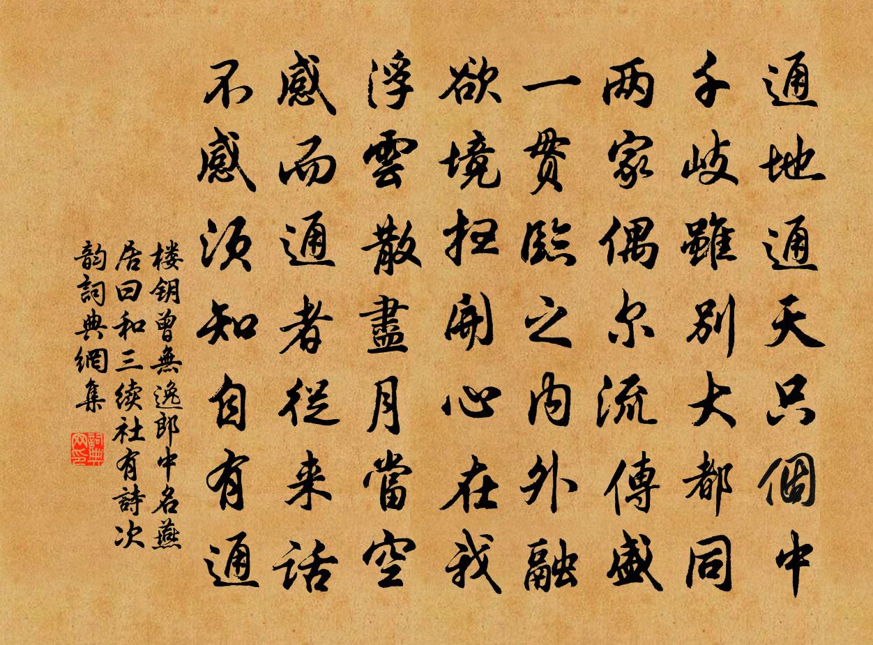 詩詞名句歷史字典書法欣賞書法字典國語詞典說文解字康熙字典古漢語字典標 題 作 者 詩 句 曾無逸郎中名燕居曰和三續社有詩次韻作者:樓鑰 朝代:宋代原文通地通天只箇中,千岐雖別大都同。兩家偶爾流傳盛,一貫臨之內外融。欲境掃開心在我,浮雲散盡月當空。感而通者從來話,不感須知自有通。詩詞問答問:《曾無逸郎中名燕居曰和三續社有詩次韻》的作者是誰?答:樓鑰問:該詩寫於哪個朝代?答:宋代書法欣賞曾無逸郎中名燕居曰和三續社有詩次韻書法作品詩詞推薦窮居陸游〔宋代〕厄窮心自樂,寂寞道常尊。老病頻辭客,嬉遊不出村。淖糜均列鼎,徒步當華軒。不但終吾世,猶堪遺子孫。南樓令(次陳君衡韻)周密〔宋代〕桂影滿空庭。秋更廿五聲。一聲聲、都是消凝。新雁舊蛩相應和,禁不過、冷清清。酒與夢俱醒。病因愁做成。展直羅縣三絕句晁說之〔宋代〕縈迴頡頏亂山河,目眩心搖到直羅。待得羅川平直處,晚來荀令恨如何。【南呂】一枝花_春風醉碧桃佚名〔元代〕春風醉碧桃,流水題紅葉。只因閒信馬,為此誤隨車。妝氵井妝呆,一笑千金舍。痴心不暫歇,經了些歡聚愁別,題報慈寺花葯園孔武仲〔宋代〕少時隨眾蹂京塵,曾倚朱欄看晚春。二十年間頭半白,方知花木解磨人。麥飯熟邵定〔宋代〕麥飯熟,兒莫哭,阿爺搗麥麥煮粥。煨一蝦,配麥粥,飽兒腹。去年春梢鋪麥田,馱兒走竄青山顛。歸來破灶無晨釣台劉昌言〔宋代〕不會持竿意,由來善一身。何如事天子,就削漢功臣。亂木凋雲際,幽禽散水濱。空餘台下月,千載屬漁人。雪寒百司作暇獨入局觀雪簡張直閣項安世〔宋代〕書生賦分合清愁,官與休辰不自休。特地忍寒開省署,誰家見雪似瀛洲。白銀殿閣雲中看,素李園林月下游。說與同誼夫國才餞季然於普門院取壁間五字詩各探王灼〔宋代〕滿酌青慈杯,醉臥白石枕。借予驪駒曲,侑我河朔飲。生查子·重葉梅辛棄疾〔宋代〕百花頭上開,冰雪寒中見。霜月定相知,先識春風面。主人情意深,不管江妃怨。折我最繁枝,還許冰壺薦。讀白樂天集釋智圓〔宋代〕李杜之為詩,句亦模山水。錢郎之為詩,旨類圖神鬼。諷刺義不明,風雅猶不委。於鑠白樂天,屈起冠唐賢。下視展敬文孝廟喻良能〔宋代〕才昔高南國,名今播八紘。英姿留此地,餘澤及編氓。仙去江山在,恩來日月明。經從千載後,款謁薦微誠。聞杜鵑戲作絕句陸游〔宋代〕半世羈游厭路岐,憑鞍日日數歸期。勞君樹杪丁寧語,似勸飢人食肉糜。如夢令許有壬〔元代〕老子風神清灑。好句自然傳寫。立雪賦梅花,更折綠條成把。閒雅。閒雅。莫道吉人辭寡。春暮向敏中〔宋代〕恨別春歸酒滿杯,殘芳繚繞舊亭台。不甘淑景隨風便,剛被炎光繼日催。弱柳綠濃還易合,夭桃紅盡更難開。明年端午貼子詞皇帝閣六首周麟之〔宋代〕西湖雨歇鑒奩開,江面銀濤一線來。自有雲山供四座,聖君元不事池台。答權乾用命字韻見惠章甫〔宋代〕峩峩儒衣冠,昕貴知義命。大道若坦途,狂夫蹈邪徑。惟君異流俗,學古師往聖。窮居飲一瓢,輕視車千乘。粹然別永新侯江總〔隋代〕送君張掖郡。分悲函谷關。欲知腸斷絕。浮雲去不還。題趙少隱青白堂三首陳與義〔宋代〕使君堂上無俗客,白白青青兩勝流。添得吟詩老居士,千年一笑澤南州。洛陽春吟邵雍〔宋代〕春歸花謝日初長,燕語鶯啼各息忙。何故遊人斷來往,綠陰殊不減紅芳。名句推薦人一能之,己百之。人十能之,己千之。子思《中庸·第二十章》 九月九日眺山川,歸心歸望積風煙。盧照鄰《九月九日玄武山旅眺》 人過留名,雁過留聲。佚名《增廣賢文·下集》 宮粉雕痕,仙雲墮影,無人野水荒灣。吳文英《高陽台·落梅》 強自取柱,柔自取束。荀子《荀子·勸學》 小軒獨坐相思處,情緒好無聊。石孝友《眼兒媚·愁雲淡淡雨瀟瀟》 富與貴,是人之所欲也;不以其道得之,不處也。孔子弟子《論語·里仁篇》 下窺指高鳥,俯聽聞驚風。岑參《與高適薛據同登慈恩寺浮圖》 看風流慷慨,談笑過殘年辛棄疾《八聲甘州·故將軍飲罷夜歸來》 不信妾腸斷,歸來看取明鏡前。李白《長相思三首》