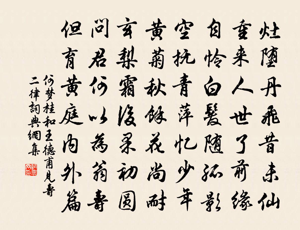 詩詞名句歷史字典書法欣賞書法字典國語詞典說文解字康熙字典古漢語字典標 題 作 者 詩 句 和王德甫見壽二律作者:何夢桂 朝代:宋代和王德甫見壽二律原文灶墮丹飛昔未仙,重來人世了前緣。自憐白髮隨孤影,空撫青萍憶少年。黃1/1菊秋余花尚耐,玄梨霜後果初圓。問君何以為翁壽,但育黃庭內外篇。詩詞問答問:和王德甫見壽二律的作者是誰?答:何夢桂問:和王德甫見壽二律寫於哪個朝代?答:宋代何夢桂和王德甫見壽二律書法欣賞和王德甫見壽二律書法作品詩詞推薦霜夜陸游〔宋代〕黃甘磊落圍三寸,赤蟹輪囷可一斤。更喚東陽麴道士,與君霜夜策奇勳。聽崇德君鼓琴黃庭堅〔宋代〕月明江靜寂寥中,大家斂袂撫孤桐。古人已矣古樂在,彷佛雅頌之遺風。妙手不易得,善聽良獨難。猶如優曇華,與頓起孫勉泛舟探韻得未字蘇軾〔宋代〕窗前堆梧桐,床下鳴絡緯。佳人尺書到,客子中夜喟。朝來一樽酒,晤語聊 * 。秋蠅已無聲,霜蟹初有味。當為渭水西別季侖崔國輔〔唐代〕隴外長亭堠,山深古塞秋。不知嗚咽水,何事向西流?再和廷邁洪咨夔〔宋代〕步障晴絲夾道青,土橋石磴向西坰。李烏奴宅空懷古,武阿婆祠懶乞靈。杜宇一聲猶客路,白雲萬里是親庭。只應江畔老人愁崔顥〔唐代〕江南年少十 * ,乘舟欲渡青溪口。青溪口邊一老翁,鬢眉皓白已衰朽。自言家代仕梁陳,垂朱拖紫三十人。兩朝雨中移竹梅堯臣〔宋代〕荷鍤冒秋霖,蕭條移翠竹。欲分溪上陰,聊助池邊綠。中散林未開,子猷心已足。青青謝栽培,豈愧凡草木。東湖懷洪景伯曾惇〔宋代〕東湖徑昃半蒼苔,問訊紅蕖幾許開。渺渺波光侵坐席,霏霏荷氣著尊罍。片雲正為詩情起,好雨更將涼意來。別乘題南海東廟楊萬里〔宋代〕羅浮山如萬石鍾,一服南走如渴龍。雷奔電萬遮不住,直抵海濱無去處。低頭飲海吐絳霞,舉頭戴著祝融家。珠宮次韻劉簿觀雪用東坡聚星堂韻禁體物語方岳〔宋代〕江皋黯黯飛雲葉,淅瀝破窗鳴急雪。亂飄蜜灑寒正苦,低唱淺斟痴亦絕。凍吟可但筆鋒健,醒狂不覺屐齒折。留連雨夜同厲玄懷皇甫荀賈島〔唐代〕桐竹繞庭匝,雨多風更吹。還如舊山夜,臥聽瀑泉時。磧雁來期近,秋鍾到夢遲。溝西吟苦客,中夕話兼思。盧助教質夫輓詞二首林亦之〔宋代〕山中香火今誰在,那聽殘春薤曲新。第一傷心惟此老,父時諸客已無人。贈友人邊游回 [一作薛能詩]馬戴〔唐代〕遊子新從絕塞回,自言曾上李陵台。尊前語盡北風起,秋色蕭條胡雁來。以桃並酒餉賈之奇曹勛〔宋代〕家園有桃瓮有酒,取以先餉國正公。定能百杯步兵飲,可助一枕羲黃風。奉酬陳宮教白玉蟾〔宋代〕落魄逍遙一醉仙,笑攜藜杖夕陽邊。三年睡法應須得,九蘊仙方妙不傳。驟雨猛催今日作,老苔為鎖異時鐫。偶來晚秋登樓王同祖〔宋代〕獨上危樓望落暉。昏鴉歸處遠煙微。湖光洗得秋容淨,爭奈江南雁又飛。朱槿花陸壑〔宋代〕壁槿扶疎當縛籬,山深不用掩山扉。客來踏破松梢月,鶴向主人頭人飛。祝英台近史達祖〔宋代〕落花深,芳草暗,春到斷腸處。金勒驕風,欲過大堤去。翠樓葛領西邊,恰如曾約,畫闌映、一枝瓊樹。正凝佇。龐居士贊釋慧開〔宋代〕平欺馬祖,下祝諸方。生涯盪卻,今古無雙。不興萬法為侶,一口吸盡西江。詠史八首蔡文姬蒲壽宬〔宋代〕琴彈十八拍,聽此雙淚流。一死固已難,萬言復誰尤。九原見衛子,何語可以酬。名句推薦君知妾有夫,贈妾雙明珠。張籍《節婦吟·寄東平李司空師道》 前庭一葉下, 言念忽悲秋。敬括《省試七月流火》 兩句三年得,一吟雙淚流。賈島《題詩後》 奇卓異非至人,至人只是常。洪應明《菜根譚·概論》 不用憑欄苦回首,故鄉七十五長亭。杜牧《題齊安城樓》 孝子之事親也,居則致其敬,養則致其樂,病則致其憂,喪則致其 哀,祭則致其嚴。孔子及其弟子《孝經·紀孝行》 主貴多變,國貴少變。國多物,削;主少物,強。商鞅《商君書·去強》 孔雀東南飛,五里一徘徊。佚名《孔雀東南飛 / 古詩為焦仲卿妻作》 別裁偽體親風雅,轉益多師是汝師。杜甫《戲為六絕句》 西施若解傾吳國,越國亡來又是誰。羅隱《西施》