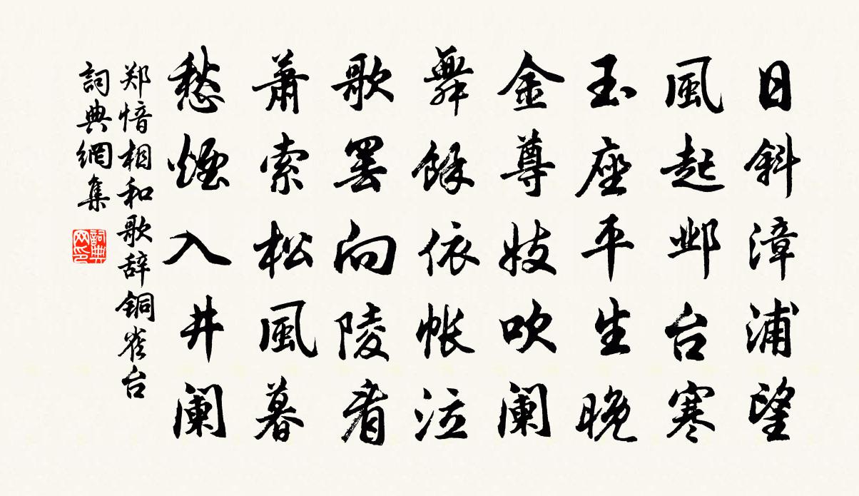 詩詞名句歷史字典書法欣賞書法字典國語詞典說文解字康熙字典古漢語字典標 題 作 者 詩 句 相和歌辭。銅雀台作者:鄭愔 朝代:唐代相和歌辭。銅雀台原文日斜漳浦望,風起鄴台寒。玉座平生晚,金尊妓吹闌。舞餘依帳泣,歌罷向陵看。蕭索松風暮,愁煙入井闌。詩詞問答問:相和歌辭。銅雀台的作者是誰?答:鄭愔問:相和歌辭。銅雀台寫於哪個朝代?答:唐代問:相和歌辭。銅雀台是什麼體裁?答:樂府鄭愔相和歌辭。銅雀台書法欣賞相和歌辭。銅雀台書法作品注釋全唐詩:卷106_10詩詞推薦月色張鎡〔宋代〕月色夜逾淨,虛庭當我前。風裳幾白玉,何煩佩褊褼。曼倩去已久,誰同醉陶然。空懷依隱心,三叫芙蕖邊。太常引 憶歸劉敏中〔元代〕無窮塵土與風濤。名利兩徒勞。解印便逍遙。算只有、淵明最高。小窗幽圃,種蘭栽菊,心遠氣應豪。海上摘蟠桃評花舒岳祥〔宋代〕我欣牟{上艹右含}重,君喜菜花黃。露浥虀菹味,風搖餅鉺香。均為資食品,作可少羹湯。若論充冬蓄,何如續八歸·秋江帶雨史達祖〔宋代〕秋江帶雨,寒沙縈水,人瞰畫閣愁獨。煙蓑散響驚詩思,還被亂鷗飛去,秀句難續。冷眼盡歸圖畫上,認隔岸、微賦得荷詩庾信〔南北朝〕秋衣行欲制。風蓋漸應欹。若有千年蔡。須巢但見隨。金丹詩四十八首張繼先〔宋代〕忍辱多多日苦辛,閉門又被鬼 * 。不知牢鎖丹田固,爭奈魂狂紫府傾。陽氣旋衰難保壽,陰邪浸長易消兵。勸君涼思吳融〔唐代〕松間小檻接波平,月淡煙沉暑氣清。半夜水禽棲不定,綠荷風動露珠傾。東湖夜坐松間陳杰〔宋代〕夜深仍露坐,湖貢小迷藏。松月半身影,藕花三面香。雖忘入城府,終擬卜林塘。何日清逋賊,妖星漸不芒。題逃戶薛能〔唐代〕幾界瞢農桑,凶年竟失鄉。朽關生濕菌,傾屋照斜陽。雨水淹殘臼,葵花壓倒牆。明時豈致此,應自負蒼蒼。宿小粉村楊萬里〔宋代〕暮宿溪邊小粉村,一峰如筆正當門。看來山色元無粉,拂殺濃藍淺黛痕。夢中作舒岳祥〔宋代〕桃李成蹊春不言,有人扶瘦倚欄乾。柔柔軟軟愁如困,燕子初歸帶薄寒。送龍學和寄王元之郎中張徽〔宋代〕未持雙節去朝元,玉陛猶虛待從班。龜洛舊遊天直上,雞林新句海中間。品流有日歸陶治,隱逸無時奉宴閒。鶴馭食鵝梨三首劉子翬〔宋代〕琱盤一卵寧論價,新帶中原雨露來。卻憶春行梁宋野,雪花瓊蕊數程開。過許村方回〔宋代〕長安才上堰,風物似微饒。野老能相認,輕船不待招。炊菱開甑熱,秤鯽滿籃跳。偶前樽中物,何為靳一澆。日梅趙時韶〔宋代〕紅日移陰上粉牆,烘乾花底夜來霜。不須水月黃昏景,疏影風前午更香。五洩龍井釋文珦〔宋代〕五吉蜿蜒宅,幽深父老言。傍溪唯見瀑,度嶺始知源。夾欲斜暉隱,空林夕電翻。屢聞當旱歲,噀雨出松門。朱元晦過訪盛璲〔宋代〕梅花樹下三間屋,掛壁枯桐盡日閒。有客過門彈一曲,斷雲殘雪滿空山。蘇堤觀木芙蓉因見淨慈明上人翌日惠詩酬贈二張鎡〔宋代〕口邊白醭公家事,坐上清狂我輩真。會乞一閒歸故隱,定因能賦結高人。賦得欲曉看妝面吳融〔唐代〕朧朧欲曙色,隱隱辨殘妝。月始雲中出,花猶霧裡藏。眉邊全失翠,額畔半留黃。轉入金屏影,隈侵角枕光。有蟬沁園春(寄張仲宗)李彌遜〔宋代〕欹枕深軒,散帙虛堂,畏景屢移。漸披襟臨水,支床就月,蓮香拂面,竹色侵衣。壓玉為醪,折荷當盞,臥看銀潢名句推薦冠蓋滿京華,斯人獨憔悴。杜甫《夢李白二首·其二》 山重水複疑無路,柳暗花明又一村。陸游《游山西村》 不知何歲月,得與爾同歸?韋承慶《南中詠雁詩》 己之困辱宜忍,而在人則不可忍。洪應明《菜根譚·概論》 小憐初上琵琶,曉來思繞天涯。王安國《清平樂·春晚》 心有疑,隨札記。就人問,求確義。李毓秀《弟子規·餘力學文》 飄飄何所似,天地一沙鷗。杜甫《旅夜書懷》 時光只解催人老,不信多情,長恨離亭,淚滴春衫酒易醒。晏殊《採桑子·時光只解催人老》 此地朝來餞行者,翻向此中牧征馬。孟浩然《高陽池送朱二》 惜別傷離方寸亂。忘了臨行,酒盞深和淺。李清照《蝶戀花·淚濕羅衣脂粉滿》