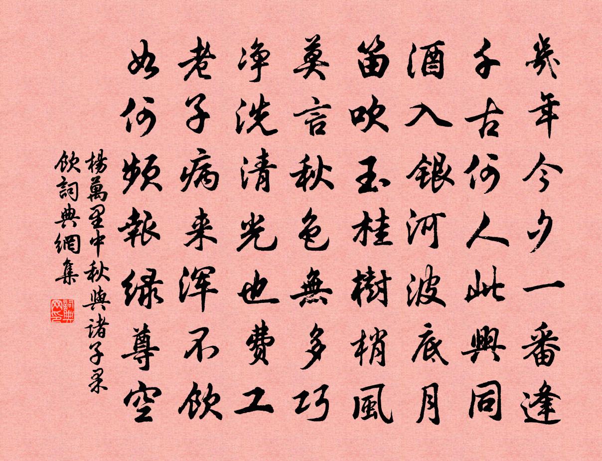 幾年今夕一番逢,千古何人此興同?酒入銀河波底月,笛吹玉桂樹梢風。莫言秋色無多巧,淨洗清光也費工。