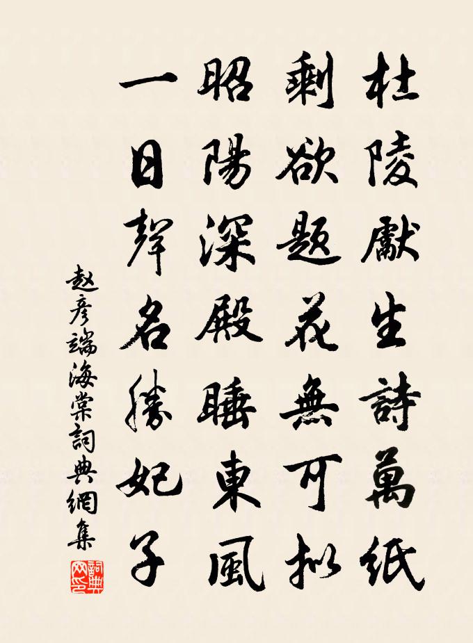 詩詞名句歷史字典書法欣賞書法字典國語詞典說文解字康熙字典古漢語字典標 題 作 者 詩 句 海棠作者:趙彥端 朝代:宋代海棠原文杜陵先生詩萬紙,剩欲題花無可擬。昭陽深殿睡東風,一日聲名勝妃子。詩詞問答問:海棠的作者是誰?答:趙彥端問:海棠寫於哪個朝代?答:宋代趙彥端海棠書法欣賞海棠書法作品詩詞推薦詠史下慕容垂陳普〔宋代〕國亡家破此心全,氐與鮮卑兩付天。王猛開心似諸葛,風雲無望白頭年。次韻李著作送行二首項安世〔宋代〕群居未信相從樂,要識相從是別離。芸閣掩關當宿夜,江船吹火未眠時。無人見雁同持酒,有客看猿自賦詩。詩墨送莫贛州趙蕃〔宋代〕赤縣權宜非昔時,近聞誰復古人為。向來聲烈有如此,今日飛騰已似遲。雁序相仍盡詞掖,虎城寧獨待瓜期。歸哉甲辰閏月初伏快雨涼風晝眠初覺庭前小欄花木蔡襄〔宋代〕閏夏天地熱焰烘,崇朝快雨隨清風。晝軒夢覺開前櫳,畫欄花草意氣雄。側枕遙問數異同,如子微物煩化工。盍各兩雁陸游〔宋代〕兩雁東西來,合群以南翔。鏡湖接天台,海闊天茫茫。冥飛遠矰弋,長路諳冰霜。君看此氣象,豈復謀稻粱。正爾錢侯寺丘葵〔宋代〕福唐錢氏子,爵命古諸侯。老樹護靈鎮,神鴉迎客舟。晨昏兩潮汐,尸祝幾春秋。參佐憑風景,輕囂走不休。觀採茶作歌乾隆〔清代〕前日餅采餅我不喜,率緣供覽官經理;今日采餅我愛觀,吳民生計勤自然。雲棲取近跋山路,都非吏備清蹕處,無賦得失群鶴呂溫〔唐代〕杳杳沖天鶴,風排勢暫違。有心長自負,無伴可相依。萬里寧辭遠,三山詎憶歸。但令毛羽在,何處不翻飛。春日書懷寇準〔宋代〕曾讀前書笑古今,恥隨流俗信浮沉。終期直道扶元化,敢為虛名役片心。默坐野禽啼晝景,閉門官柳長春陰。世間留題水北楊郎中園亭二首邵雍〔宋代〕買宅從來重見山,見山今直幾何錢。奇峰環列遠隔水,喬木俯臨微帶煙。行路客疑驚洞府,憑欄人恐是神仙。長憂庵中夜興陸游〔宋代〕示疾維摩無侍者,夜闌自掩草庵門。有情梅影半窗月,相應雞聲十里村。紙帳擁裘尋斷夢,地爐撥火暖殘樽。扶衰水仙子佚名〔宋代〕浮家泛宅生涯好。聚米堆鹽多積寶。煙波得趣樂江湖,宜乘興,尋安道。不負軒轅當日造。初度喜逢維夏早。孔釋送張逸人二首夏竦〔宋代〕上公詩筆千金重,逋客歸裝一棹輕。莫向青山更招隱,且留賢哲濟蒼生。書上元夜遊蘇軾〔宋代〕 己卯上元,予在儋州,有老書生數人來過,曰:“良月嘉夜,先生能一出乎?”予欣然從之。步城西,入僧舍【越調】天淨沙_書懷二首香張可久〔元代〕書懷二首香奩名滿青樓,羽衣人在黃州,羅帕春寒素手。壯懷依舊,水聲淘盡詩愁。白頭多病維摩,青大孤影姮娥和所盤端午韻丘葵〔宋代〕槐夏陰中鬢已秋,天風吹夢墮江頭。水應難洗湘纍恨,山豈能為柳子囚。塵世不知幾端午,人生大抵一虛舟。愁來林和靖孤山舊隱釋文珦〔宋代〕抱璞肯自剖,藏之在深櫝。嗟彼荊山人,不能衛其足。生先有良貴,那愛分□祿。閒居五十年,祗著山人服。華袞次韻范少才在峽中寄李季允二首魏了翁〔宋代〕大明臨照職方州,漢沔江淮澹若油。剪薙荊榛開蹕路,護持杞梓聳岑樓。朝綱人為諸公喜,國體誰知志士愁。讜議送王震給事知蔡州蘇轍〔宋代〕朝廷入忘返,冠蓋如雲屯。賢哉貴公子,獨以民社言。西台出命書,落筆波濤翻。東台典封駁,坐惜日月奔。試劇武昌感事陸游〔宋代〕百萬呼盧事已空,新寒擁褐一衰翁。但悲鬢色成枯草,不恨生涯似斷蓬。煙雨淒迷雲夢澤,山川蕭瑟武昌宮。西遊名句推薦人生不可安閒,有恆業,才足收放心王永彬《圍爐夜話·第八三則》 醉里挑燈看劍,夢回吹角連營。辛棄疾《破陣子·為陳同甫賦壯詞以寄之》 貌言華也,至言實也,苦言藥也,甘言疾也。司馬遷《史記·七十列傳·商君列傳》 田舍清明日,家家出火遲。王建《寒食》 山光悅鳥性,潭影空人心。常建《題破山寺後禪院》 要問相思,天涯猶自短。晏幾道《清商怨·庭花香信尚淺》 幽人歸獨臥,滯慮洗孤清。張九齡《感遇十二首》 且趁閒身未老,盡放我、些子疏狂。蘇軾《滿庭芳·蝸角虛名》 黃鶯也愛新涼好,飛過青山影里啼。徐璣《新涼》 喜怒無蹤,慎思及遠,人所難圖焉。來俊臣《羅織經·固榮卷第六》
