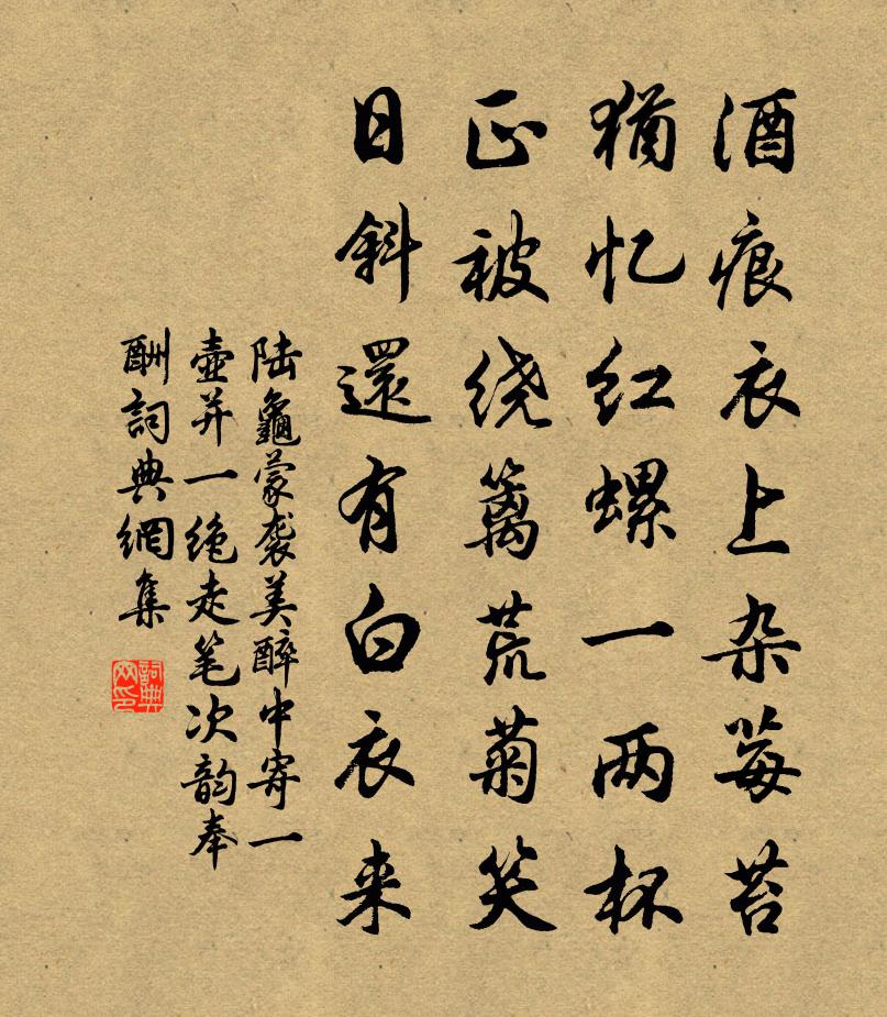 詩詞名句歷史字典書法欣賞書法字典國語詞典說文解字康熙字典古漢語字典標 題 作 者 詩 句 襲美醉中寄一壺並一絕,走筆次韻奉酬作者:陸龜蒙 朝代:唐代原文酒痕衣上雜莓苔,猶憶紅螺一兩杯。正被繞籬荒菊笑,日斜還有白衣來。詩詞問答問:《襲美醉中寄一壺並一絕,走筆次韻奉酬》的作者是誰?答:陸龜蒙問:該詩寫於哪個朝代?答:唐代問:陸龜蒙的名句有哪些?答:陸龜蒙名句大全書法欣賞襲美醉中寄一壺並一絕,走筆次韻奉酬書法作品注釋全唐詩:卷628-30詩詞推薦好事近佚名〔宋代〕春色醉荼縻,晝永篆煙初絕。臨水楊花千樹,盡一時飛雪。穿簾度竹弄輕盈,東風老猶劣。睡起憑闌無緒,聽幾聲永遇樂·舟中感舊徐燦〔清代〕無恙桃花,依然燕子,春景多別。前度劉郎,重來江令,往事何堪說。逝水殘陽,龍歸劍杳,多少英雄淚血。千古芭蕉胡仲弓〔宋代〕為愛芭蕉綠葉濃,栽時傍竹引清風。近來怕聽愁人雨,斫盡檐前三四叢。酒肆行韋應物〔唐代〕豪家沽酒長安陌,一旦起樓高百尺。碧疏玲瓏含春風,銀題彩幟邀上客。回瞻丹鳳闕,直視樂游苑。四方稱賞名已十一月十日酒散已二鼓與千里步月因至水堂葛立方〔宋代〕雪後泥方凍,酒闌寒少威。傍雲生夜月,喚客出柴扉。籬敗犬聲合,街閒人影稀。石欄山幾尺,暝靄只依依。自判此生非醉殺則睡殺耳未知天公肯見容否作蘇泂〔宋代〕採石江邊踏鯉魚,華山縣裡自騎驢。世間非醉亦非睡,白墮黃粱莫笑渠。墨梅家鉉翁〔宋代〕非香之香,非色之色。伴我孤吟,風清月白。送唐中丞開淘西湖夏日游泛因書示郡人朱慶餘〔唐代〕萍岸新淘見碧霄,中流相去忽成遙。空餘孤嶼來詩景,無復橫槎礙柳條。紅旆路幽山翠濕,錦帆風起浪花飄。共知冊上公太常奏雅樂佚名〔宋代〕司樂陳金石,逶迤引上公。奏音人語絕,清韻佩聲通。應律煙雲改,來儀鳥獸同。得賢因舉頌,修禮便觀風。聖壽頌古三十一首釋梵琮〔宋代〕乞兒無縷又無襤,餿飯殘羹勿處檐。拈起多年破蓆袋,人前更不懼羞慚。臨江仙 目貽王哲〔元代〕為甚風狂偏愛酒,非乾愚意多輕。此般道眼最分明。頂門三路顯,得伴道人行。三教幽玄深遠好,仍將妙理經營。次韻子云盱眙道中三首韓元吉〔宋代〕江南淮北市初通,人語忻忻作好風。抱耒只思耕隴底,買船誰復渡遼東。向來熊耳真投甲,此去天山擬掛弓。上策送方叔姜特立〔宋代〕九日相攜上翠微,安仁悼內不勝悲。琴中只弄無弦曲,歌里聊陳鼓缶辭。來歲須為湯{外麥內並}約,今朝空過菊踏莎行徐俯〔宋代〕素景將闌,黃花初笑。登高一望秋天杳。邀賓攜妓數能來,醉中贏得閒多少。佳氣氤氳,飛雲縹緲。竹林更著清江游茅山五首儲光羲〔唐代〕十年別鄉縣,西雲入皇州。此意在觀國,不言空遠遊。九衢平若水,利往無輕舟。北洛反初路,東江還故丘。春山寄黃希聲利登〔宋代〕相會不幾日,相別又經時。居然感我懷,何以寫所思。舉目皆我友,我心知者誰。知心而久離,此情悲不悲。玉蕊花劉克莊〔宋代〕竹院過僧話,山門掃地迎。英雄猶有跡,般若太無情。玉蕊春陰密,琅玕晚暑清。半生來往屢,也合送人行。題鄂王墓葉紹翁〔宋代〕萬古知心只老天,英雄堪恨復堪憐。如公更緩須臾死,此虜安能八十年。漠漠凝塵空偃月,堂堂遺像在凌煙。早知奉和嚴司空重陽日同崔常侍崔郎及諸公登龍山落帽台佳宴令狐楚〔唐代〕謝公秋思渺天涯,蠟屐登高為菊花。貴重近臣光綺席,笑憐從事落烏紗。萸房暗綻紅珠朵,茗碗寒供白露芽。詠碎句佚名〔宋代〕一色樓台三十里,不知何處覓孤山。名句推薦昔在零陵厭,神器若無依。何遜《行經孫氏陵》 此際閒愁郎不共,月移窗罅春寒重。王士禎《蝶戀花·和漱玉詞》 放眼暮江千頃,中有離愁萬斛,無處落征鴻。楊炎正《水調歌頭·把酒對斜日》 遍身羅綺者,不是養蠶人張俞《蠶婦》 故人何在,煙水茫茫。柳永《玉蝴蝶·望處雨收雲斷》 寒夜客來茶當酒,竹爐湯沸火初紅。杜耒《寒夜》 江皋樓觀前朝寺,秋色入秦淮。徐再思《人月圓·甘露懷古》 此身如傳舍,何處是吾鄉。蘇軾《臨江仙·送王緘》 無求到處人情好,不飲任他酒價高。佚名《增廣賢文·上集》 洞庭之東江水西,簾旌不動夕陽遲。陳與義《登岳陽樓》
