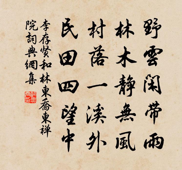 詩詞名句歷史字典書法欣賞書法字典國語詞典說文解字康熙字典古漢語字典標 題 作 者 詩 句 和林東喬東禪院作者:李存賢 朝代:宋代和林東喬東禪院原文野雲閒帶雨,林木靜無風。村落一溪外,民田四望中。詩詞問答問:和林東喬東禪院的作者是誰?答:李存賢問:和林東喬東禪院寫於哪個朝代?答:宋代李存賢和林東喬東禪院書法欣賞和林東喬東禪院書法作品詩詞推薦次韻明孺見遺之什李處權〔宋代〕世家傳子又傳孫,豈較前身與後身。知足已如倉庾民,忘懷真是葛天民。騎鯨又見詩無敵,射虎何須武絕倫。白屋題採蓮美人圖孟淑卿〔宋代〕綠槐蟬靜日偏長,懶爇金爐百和香。莫摘池中蓮子看,箇中多半是空房。觀海潮王義山〔宋代〕憑誰撼得海門開,疑是神兵著力推。霎地起來銀一線,駕山捲起雪千堆。列江畫舫浮天去,幾片紅旗逐浪回。畢竟南園李賀〔唐代〕方領蕙帶折角巾,杜若已老蘭苕春。南山削秀藍玉合,小雨歸去飛涼雲。熟杏暖香梨葉老,草梢竹柵鎖池痕。鄭公夜聞雪聲鄭剛中〔宋代〕怒號中夜忽收聲,枯葉寒梢細細鳴。曉起一杯檐外立,滿階無處認梅英。贈友人何應龍〔宋代〕我向詩中為活計,君於酒里作生涯。世間樂事惟詩酒,各自風流占一家。秧馬蘇軾〔宋代〕春雲蒙蒙雨淒淒,春秧欲老翠剡齊。嗟我婦子行水泥,朝分一壟暮千畦。腰如箜篌首啄雞,筋煩骨殆聲酸嘶。我有馬周疏引俚語佚名〔唐代〕貧不學儉,富不學奢。嘉禾百詠嘉禾墩張堯同〔宋代〕寂寞黃龍後,紛然壠土碑。廢興與處問,空詠草離離。偈頌四十二首釋祖先〔宋代〕一切數句非數句,與吾靈覺何交涉。字義炳然,當陽一決。燈夕解嘲和同官二首陳杰〔宋代〕同上南樓看月去,莫嫌官舍冷如僧。一株西北平安火,萬里東南無盡燈。失調名 促段功歸 堯山堂外紀卷七十四高氏〔元代〕風捲殘雲,九霄冉冉逐。龍池無偶,水雲一片綠。寂寞倚屏幃,春雨紛紛促。蜀錦半床閒,鴛鴦獨自宿。好語我將登第一山袁說友〔宋代〕極目俄登最上岩,秋風衰草塞雲閒。漫遊江浙幾千里,今識東南第一山。志士逢時寧恨晚,壯懷有淚不須潸。興亡會昌號湘江岸有小峴亭癸卯六月與瑞金吳丞飲曾豐〔宋代〕湘水欠湘竹,峴亭非峴山。休論真勝假,且幸冗偷閒。眼底方塵外,欄乾更樹間。哢禽如語我,劇暑未能還。秦川吟二首邵雍〔宋代〕當時馬上過秦川,倐忽於今二十年。因見夫君話家住,依稀記得舊風煙。木筆花董嗣杲〔宋代〕始開已落謾芳菲,暗寫東皇幾夕暉。傍樹誰矜火焰異,對花自感壯年非。紅脂含蒂長枝勁,紫粉粘蕤老葉肥。名占同文潛送況之諫議十四丈守潞過成季作晁補之〔宋代〕午投李同年,下馬汗如洗。城南迫送客,雖懶聊爾耳。出門繚陂陼,白鳥起深葦。佛宮橫晚霽,窈窕間一水。借問四明山中十絕韓采岩戴表元〔宋代〕洞深煙樹碧氤氳,只採靈苗不採薪。聞著蹤由多懶說,相逢莫有姓韓人。同徐文淵登永州高山寺徐照〔宋代〕畫圖舊識高山寺,今在高山寺里行。千古險峰長自直,一春瀟水未曾清。孤城吹角寒猿應,破屋尋碑野鼠驚。天遣氐州第一方千里〔宋代〕朝日融怡,天氣艷冶,桃英杏萼猶小。燕壘初營,蜂衙乍散,池面煙光縹緲。芳草如薰,更瀲灩、波光相照。錦繡名句推薦感之欲嘆息,對酒還自傾。李白《春日醉起言志》 楚水辭魚窟,燕山到雁家裴說《塞上曲》 花明玉關雪,葉暖金窗煙。李白《折楊柳》 自古明王聖帝,猶須勤學,況凡庶乎!顏之推《顏氏家訓·勉學篇》 春未來時,酒攜不到千岩路。吳文英《點絳唇·越山見梅》 北國風光,千里冰封,萬里雪飄。 * 《沁園春·雪》 無聊成獨臥,彈指韶光過。納蘭性德《菩薩蠻·新寒中酒敲窗雨》 傷心千里江南,怨曲重招,斷魂在否?吳文英《鶯啼序·春晚感懷》 綠葉陰濃,遍池亭水閣,偏趁涼多。元好問《驟雨打新荷》 重重蕊葉相憐,似青帔艷妝神仙侶。曹勛《夾竹桃花·詠題》