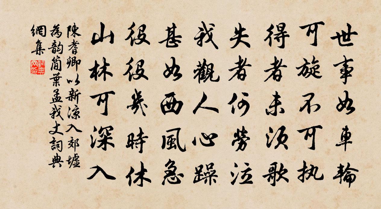 詩詞名句歷史字典書法欣賞書法字典國語詞典說文解字康熙字典古漢語字典標 題 作 者 詩 句 以新涼入郊墟為韻簡葉孟我丈作者:陳耆卿 朝代:宋代原文世事如車輪,可旋不可執。得者未須歌,失者何勞泣。我觀人心躁,甚如西風急。役役幾時休,山林可深入。詩詞問答問:《以新涼入郊墟為韻簡葉孟我丈》的作者是誰?答:陳耆卿問:該詩寫於哪個朝代?答:宋代書法欣賞以新涼入郊墟為韻簡葉孟我丈書法作品詩詞推薦演雅十章張至龍〔宋代〕江鱗行比目,沙鴛睡交頸。不知山兔寒,清夜雇蟾影。晚眺 其二王冕〔元代〕雲騰山欲重,雨過樹如新。細路多行虎,荒村不見人。遊絲懸落日,小草亂青春。何處論知己?過從白鳥親。歲暮書事十二首張耒〔宋代〕陳葉不肯墮,凍醪凝未融。寒林晴有影,霜日冷無風。許國片心壯,勞生雙鬢蓬。功名任愚智,萬事古今同。年老逢春十三首邵雍〔宋代〕年老逢春認破春,破春不用苦傷神。身心自有安存地,草木焉能媚惑人。此日榮為佗日瘁,今年陳是去年新。世間鷓鴣天朱熹〔宋代〕脫卻儒冠著羽衣。青山綠水浩然歸。看成鼎內真龍虎,管甚人間閒與非。生羽翼,上煙霏。回頭祗見冢累累。未尋題東虎丘寺六韻白居易〔唐代〕香剎看非遠,祗園入始深。龍蟠松矯矯,玉立竹森森。怪石千僧坐,靈池一劍沉。海當亭兩面,山在寺中心。酒熟絕句三首龐謙孺〔宋代〕大別寺前春草深,鳳棲山下漢江清。空村野隴誰為主,賴有流移旅客耕。入建平界二首楊萬里〔宋代〕一歲昇平在一收,今年田父又無愁。接天稻穗黃嬌日,照水蓼花紅滴秋。風有炎涼才頃刻,雨無朝暮政滂流。浪言去婦詞 ( 一作顧況詩 )李白〔唐代〕古來有棄婦,棄婦有歸處。今日妾辭君,辭君遣何去。本家零落盡,慟哭來時路。憶昔未嫁君,聞君卻周旋。綺羅寄王用之判府監簿楊萬里〔宋代〕寅清堂上初相識,君如玉樹逢春碧。滕王閣下重相從,君如天驥追秋風。九州四海王魯公,有人不減漢八龍。君才送吉判官還京赴崔尹幕皎然〔唐代〕江南梅雨天,別思極春前。長路飛鳴鶴,離帆聚散煙。清晨趨九陌,秋色望三邊。見說王都尹,山陽辟一賢。書破琴詩後蘇軾〔宋代〕此身何物不堪為,逆旅浮雲自不知。偶見一張閒故紙,便疑身是永禪師。寄會稽刁景純學士張伯玉〔宋代〕雨後稽山紫翠毫,使君千騎壓雲鰲。樓台日暖花木麗,河漢夜涼絲竹高。瀛館久淹騏驥足,越人今識鳳凰毛。江南太母魏氏半徑題石陳元光〔唐代〕喬嶽標仙跡,玄扃妥壽姬。烏號非嶺海,鶴仰向京師。系牒公侯裔,懸弧將相兒。清貞蜚簡籍,規範肅門楣。萬里送宋君輔迎母往總所戴栩〔宋代〕步合趨台閣,人於此去疑。定應中路召,早是十年遲。草奏懷邊略,開緘得賀詩。從親登賞處,花發小春枝。送曹蘊清歸廬山曹勛〔宋代〕吾宗出西蜀,托跡廬阜岑。恭禮清虛尊,相與道義深。別時白日長。忽茲秋雲陰。永懷一笑粲,水雲勞我心。奉答聖俞宿直見寄之作歐陽修〔宋代〕寒夜分曹直,嚴城隔幾層。予慚批鳳詔,君嘆守螢燈。病骨羸漳浦,官書蠹羽陵。無嫌學舍冷,文字比清冰。括蒼山行呂聲之〔宋代〕微風吹雨濕欄乾,薄霧籠晴事淺寒。一樹紅梅牆外發,誰家美麗倩人看。紅頭額賈似道〔宋代〕紅頭雖然似花枝,早秋雖勝未為奇。再來得勝亦不可,勝少輸多何必疑。駕月橋曾幾〔宋代〕伐木樑清淺,扶藤日幾回。嫦娥與牛女,昔日度橋來。名句推薦故鄉歸去千里,佳處輒遲留。蘇軾《水調歌頭·安石在東海》 江春不肯留歸客,草色青青送馬蹄。劉長卿《送李判官之潤州行營》 青山隱隱水迢迢,秋盡江南草未凋。杜牧《寄揚州韓綽判官》 獨抱影兒眠,背看燈花落。汪懋麟《誤佳期·閨怨》 梅似雪,柳如絲。試聽別語慰相思。辛棄疾《鷓鴣天·送歐陽國瑞入吳中》 雲淡風高葉亂飛,小庭寒雨綠苔微,深閨人靜掩屏帷。顧敻《浣溪沙·雲淡風高葉亂飛》 家家乞巧望秋月,穿盡紅絲幾萬條。林傑《乞巧》 春未來時,酒攜不到千岩路。吳文英《點絳唇·越山見梅》 凡流言、流說、流事、流謀、流譽、流愬,不官而衡至者,君子慎之荀子《荀子·致士》 尊前只恐傷郎意,閣淚汪汪不敢垂。夏竦《鷓鴣天·鎮日無心掃黛眉》