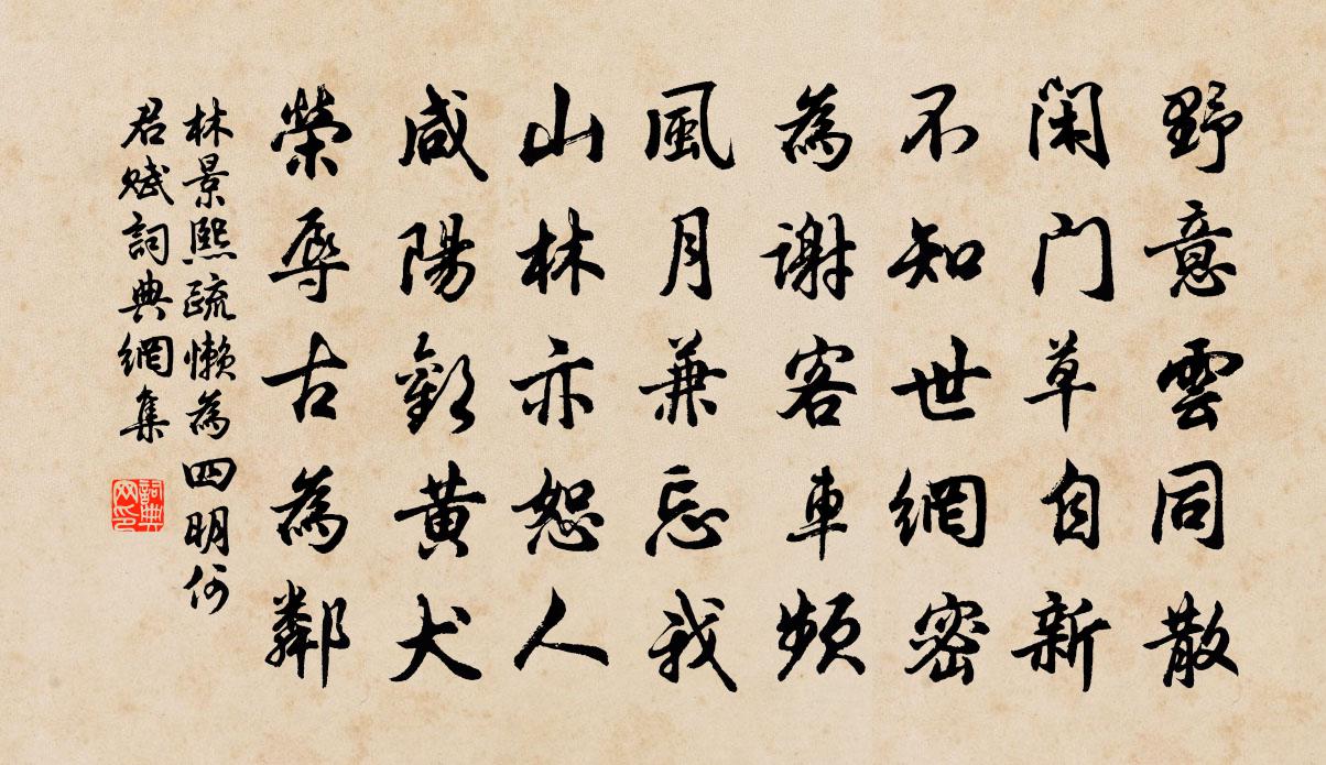 詩詞名句歷史字典書法欣賞書法字典國語詞典說文解字康熙字典古漢語字典標 題 作 者 詩 句 疏懶為四明何君賦作者:林景熙 朝代:宋代疏懶為四明何君賦原文野意雲同散,閒門草自新。不知世網密,為謝客車頻。風月兼忘我,山林亦恕人。鹹陽歡黃犬,榮辱古為鄰。詩詞問答問:疏懶為四明何君賦的作者是誰?答:林景熙問:疏懶為四明何君賦寫於哪個朝代?答:宋代林景熙疏懶為四明何君賦書法欣賞疏懶為四明何君賦書法作品詩詞推薦山中之樂三章送徐明叟胡直內蘇德翁歸嚴瀨並方回〔宋代〕山中之樂兮樂可忘老,匪鹽匪酪兮養梨棗。曾高雲仍兮動閱數世,手樹成棟兮鬢猶未槁。一屈肘兮代謝,一寤寐兮題曲水閣林概〔宋代〕勝絕千岩地,清涵一水濱。石泉寒繞澗,山木翠和春。秀人壺中望,幽凝物外身。賢侯足真賞,王謝有芳塵。夏夜二首張耒〔宋代〕受暑若作釜,付之無如何。豈陰陽知爭,變起一剎那。西風卷屋茅,澍雨如江河。振衣欲露坐,濯此寒滂沱。烹魚折桂寺戴復古〔宋代〕擁鼻行吟上下廊,今宵又宿贊公房。松搖夜半風聲壯,桂染中秋月色香。白石清泉喧笑語,深山大澤出文章。當年玉照東西兩軒有紅梅及千葉緗梅未經題詠倒用張鎡〔宋代〕方諸台聳日邊雲,望拜青童上相君。侍女百千皆絳服,恰如檐外樹紛紛。謝東園主人惠竹石以紫石盆貯之陳宓〔宋代〕幽人巧琢紫璠璵,中貯琅玕一尺餘。怪石嵌岩苔蘚古,坐移衡霍入吾廬。蘇幕遮王哲〔元代〕性為真,身是假。認取圓成,可可頻占惹。自是康強惺復灑。靜里搜閒,急刀投嬰奼。說良因,談道話。開廓靈明送周知監韓繹〔宋代〕蜀土風景信不好,君之所治兼蠻夷。山高地仄江水惡,刀耕火利黎民疲。緣識宋太宗〔宋代〕清潔恭虔煙上帝,郊儀大設康哉世。人心肯悅化來同,禮樂鹹修依古制。景福照明何舉措,千官儼雅登雲路。一陽壽凌元春宗伯六十郭仲敬〔宋代〕舊是瑤階玉筍班,早乘白鹿出人間。朝依漢殿參玄典,夕護仙爐煉大還。三月崆峒傳帝錄,千年姑射駐童顏。馬家觀潮周密〔宋代〕浙江之潮,天下之偉觀也。自既望以至十八日為最盛。方其遠出海門,僅如銀線;既而漸近,則玉城雪嶺際天而來陸羽泉周弼〔宋代〕擬酌松根泉,先酹松下土。甌犧副都籃,拾薪自煎煮。一杯復一杯,並酌連四五。寄謝山中人,腹痛不累汝。龍花寺主家小尼(郭代公愛姬薛氏幼嘗為尼小名仙人子)白居易〔唐代〕頭青眉眼細,十四女沙彌。夜靜雙林怕,春深一食飢。步慵行道困,起晚誦經遲。應似仙人子,花宮未嫁時。送張和叔兼簡魯直秦觀〔宋代〕汝南如一器,百千聚飛蚊。終然鼓狂鬧,啾啾竟誰聞。議郎盛德後,清修繼先芬。未試霹靂手,低回從此君。學官黃花王安石〔宋代〕四月揚州芍藥多,先時為別苦風波。還家忽忽驚秋色,獨見黃花出短莎。送趙資政曾鞏〔宋代〕鎮撫西南眾望傾,玉書天上輟持衡。春風不覺岷山遠,和氣還從錦水生。學舍卻尋余教在,棠郊應喜舊陰成。歸來秋夕池上宋祁〔宋代〕楚江楓老樹無煙,池上悲秋一惘然。素蚌虧盈長伴月,戲思南北各依蓮。風驅野燐寒爭出,露警皋禽怨不眠。伏檻隆中蘇軾〔宋代〕諸葛來西國,千年愛未衰。今朝游故里,蜀客不勝悲。誰言襄陽野,生此萬乘師。山中有遺貌,矯矯龍之姿。龍蟠中峰亭朱景玄〔唐代〕中峰上翠微,窗曉早霞飛。幾引登山屐,春風踏雪歸。句嚴陵士人〔宋代〕大柄如歸手,蚊虻莫浪飛。名句推薦歲暮遠為客,邊隅還用兵。杜甫《歲暮》 守節自誓,親誨之學。歐陽修《畫地學書》 早歲那知世事艱,中原北望氣如山。陸游《書憤五首·其一》 爭奈醒來,愁恨又依然朱淑真《江城子·賞春》 山氣日夕佳,飛鳥相與還。陶淵明《飲酒·其五》 故君子力事日強,願欲日逾,設壯日盛。墨子《墨子·02章 修身》 料峭春寒中酒,交加曉夢啼鶯。吳文英《風入松·聽風聽雨過清明》 父耕原上田,子劚山下荒。聶夷中《田家》 凝恨對殘暉,憶君君不知。韋莊《菩薩蠻》 象龍喚不應,竹龍起行雨張孝祥《湖湘以竹車激水粳稻如雲書此能仁院壁》