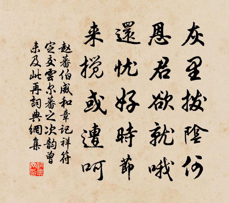 詩詞名句歷史字典書法欣賞書法字典國語詞典說文解字康熙字典古漢語字典標 題 作 者 詩 句 伯威和章記祥符定交云爾蕃之次韻曾未及此再作者:趙蕃 朝代:宋代原文灰里撥陰何,恩君欲就喔。還憂好時節,來攪或遭呵。詩詞問答問:《伯威和章記祥符定交云爾蕃之次韻曾未及此再》的作者是誰?答:趙蕃問:該詩寫於哪個朝代?答:宋代書法欣賞伯威和章記祥符定交云爾蕃之次韻曾未及此再書法作品詩詞推薦古意二首崔國輔〔唐代〕玉籠薰繡裳,著罷眠洞房。不能春風裡,吹卻蘭麝香。種棘遮蘼蕪,畏人來采殺。比至狂夫還,看看幾花發。句鄭文寶〔宋代〕滿帆西日催行客,一夜東風落楚梅。頌古十五首釋慧遠〔宋代〕電卷星飛,珠回玉轉。打破麵皮,赤心片片。東郊韓維〔宋代〕東郊絲雨破浮埃,繡騎尋芳兩兩來。十畝霜陰青翳目,一篙溪色碧於苔。林花泛日鶯求友,壠麥含風雉應媒。綠柳八聲甘州(揚州)李好古〔宋代〕壯東南、飛觀切雲高,峻堞繚波長。望蔽空樓櫓,重關警柝,跨水飛梁。百萬貔貅夜築,形勝隱金湯。坐落諸蕃膽普滿題潞州佛舍佚名〔唐代〕此水連涇水,雙珠血滿川。青牛將赤虎,還號太平年。寒夜文宴得驚字陸龜蒙〔唐代〕各將寒調觸詩情,旋見微澌入硯生。霜月滿庭人暫起,汀洲半夜雁初驚。三秋每為仙題想,一日多因累句傾。千里句薛紹彭〔宋代〕寒臨重閣迥,影帶亂山流。秋行二首徐璣〔宋代〕紅葉枯梨一兩株,修然秋思滿山居。詩懷自歡多塵土,不似秋來木葉疏。挽傅安道郎中詞二首韓元吉〔宋代〕蚤負凌雲氣,長懷流水音。詞場俱白首,世路只丹心。妙語空成誦,歡盟詎可尋。泉山幾千里,涕淚俱沾襟。詠史上武帝陳普〔宋代〕文帝端能殺少翁,景皇不解斬常融。正心數語深加意,位在三皇五帝中。和中書侍郎院壁畫雲李收〔唐代〕粉壁畫雲成,如能上太清。影從霄漢發,光照掖垣明。映筱多幽趣,臨軒得野情。獨思作霖雨,流潤及生靈。偈頌一百五十首釋心月〔宋代〕密密綿綿細著工,從來此室不通風。庭前三尺齊腰雪,身在靄然和氣中。閔雨鄭獬〔宋代〕潭底乖龍喚不譍,驕陽似欲敗西成。虛堂永夜耿無寐,起聽四郊車水聲。隗囂陳造〔宋代〕諸父論情是至親,若為見賣苟全身。發崔冤魄旋無憾,眼見君侯殺伯春。富陽道中姚勉〔宋代〕翠駕凋零盡,芒鞋響葉聲。晴江湖後綠,寒日竹間清。曝背翁微睡,挑包僧自行。離京才一日,便覺愜幽情。新燕憶女弟京娘張玉孃〔宋代〕三月江南綠正肥,陰陰深院燕初歸。亂術飛絮營新疊,產逐花香避繡幃。欲笑秋風紅縷在,獨憐舊事玉京非。蘭閨感皇恩(旅思)陸蘊〔宋代〕殘角兩三聲,催登古道。遠水長山又重到。水聲山色,看盡輪蹄昏曉。風頭日腳下,人空老。匹馬舊時,西征談笑送僧歸豫章省親釋正覺〔宋代〕賓繭風枝夢不寧,夜堂思對老人星。一心歸去事萱草,千里相求鳴鶺鴒。樹樹丹楓金墮葉,叢叢黃葉雪浮汀。西山安樂窩中看雪邵雍〔宋代〕滿目是瑤琚,貧家遂富如。許觀非許賣,宜慘不宜舒。醇釀裝醺後,重衾造暖餘。肯於人世上,造險較錙銖。名句推薦君王遊樂萬機輕,一曲霓裳四海兵。李約《過華清宮》 萬里歸來顏愈少,微笑,笑時猶帶嶺梅香。蘇軾《定風波·南海歸贈王定國侍人寓娘》 輕汗微微透碧紈,明朝端午浴芳蘭。蘇軾《浣溪沙·端午》 故人宿茅宇,夕鳥栖楊園。李白《之廣陵宿常二南郭幽居》 臥看滿天雲不動,不知雲與我俱東。陳與義《襄邑道中》 不知何處吹蘆管,一夜征人盡望鄉。李益《夜上受降城聞笛》 無常安之國,無宜治之民戴聖《大戴禮記·保傅第四十八》 占得杏梁安穩處,體輕唯有主人憐,堪羨好因緣。牛嶠《憶江南·銜泥燕》 謙謙君子,卑以自牧佚名《易傳·象傳上·謙》 信使可覆,器欲難量。周興嗣《千字文·全文》