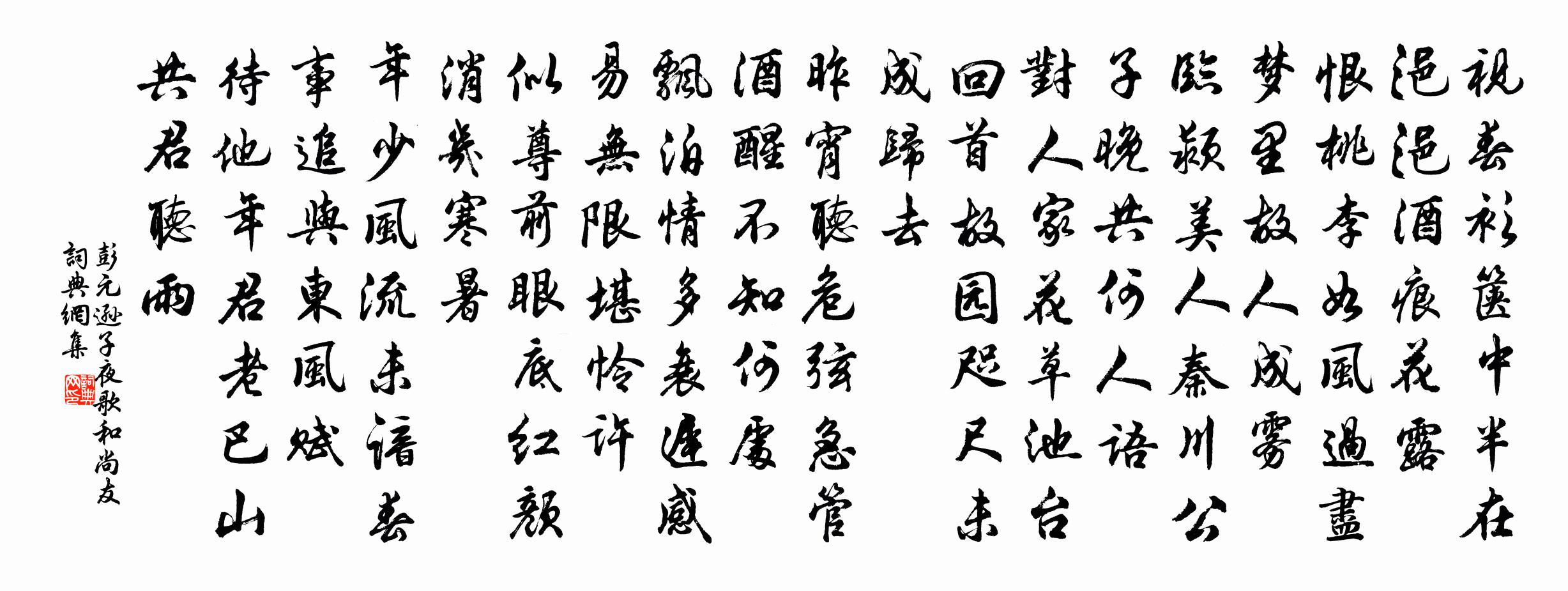 詩詞名句歷史字典書法欣賞書法字典國語詞典說文解字康熙字典古漢語字典標 題 作 者 詩 句 子夜歌(和尚友)作者:彭元遜 朝代:宋代子夜歌(和尚友)原文視春衫、篋中半在,浥浥酒痕花露。恨桃李、如風過盡,夢裡故人成霧。臨潁美人,秦川公子,晚共何人語。對人家、花草池台,回首故園咫尺,未成歸去。昨宵聽、危弦急管,酒醒不知何處。飄泊情多,衰遲感易,無限堪憐許。似尊前眼底,紅顏消幾寒暑。年少風流,未諳春事,追與東風賦。待他年、君老巴山,共君聽雨。詩詞問答問:子夜歌(和尚友)的作者是誰?答:彭元遜問:子夜歌(和尚友)寫於哪個朝代?答:宋代問:子夜歌(和尚友)是什麼體裁?答:詞彭元遜子夜歌(和尚友)書法欣賞子夜歌(和尚友)書法作品詩詞推薦答潘司理林逋〔宋代〕庭柯雪壓已如春,乘興山陰亦少人。岑寂園廬何所對,酒中賢聖藥君臣。大堤曲劉禹錫〔宋代〕酒旗相望大堤頭,堤下連檣堤下樓。日暮行人爭渡急,槳聲幽軋滿中流。和劉彥沖日發胡寅〔宋代〕避炎掃淨室,臥看浮爐煙。讀君五字詩,鶴髮驚臞仙。緬懷少壯日,意氯橫無邊。春風郁雙鬢,綠草爭芳妍。酒豪丈亭道者乾緣求頌釋紹曇〔宋代〕破钁頭邊用得親,入廛不撥萬機塵。牢關劄斷三江口,要被隨波逐浪人。送畢郎中提點淮南茶場梅堯臣〔宋代〕汴中春絮亂,淮上鮆魚時。順水疾奔馬,出都猶脫羈。拜親將已近,食膾不言遲。到日問茶事,遍山開幾旗。次韻劉耘廬趙文〔宋代〕江南有故事,極熱介秋夏。空齋得幽景,眾綠天所畫。對景愜余情。談文及茲暇。山風吹池月,不似城中夜。百年和韋承慶過義陽公主山池五首杜審言〔唐代〕野興城中發,朝英物外求。情懸朱紱望,契動赤泉游。海燕巢書閣,山雞舞畫樓。雨余清晚夏,共坐北岩幽。徑轉賦林景參梅嶼陳允平〔宋代〕結廬分得雁山雲,嶼上梅花是四鄰。水月一天薌世界,冰霜千古玉精神。短檠夜雨西窗夢,長鋏秋風北塞塵。我亦和秀實答仲嘉王洋〔宋代〕未春先以約春期,載酒如何卻負時。遙想醉狂喔舴艋,也知歸客趁酴醾。阿瞞氣懾周瑜陳,樊素心貪白傳詩。橫槊拙稿呈許侯楊公遠〔宋代〕拙稿攜將謁使君,區區那敢冀知聞。編成功卷如終卷,賦就三分誦七分。妄意僭乾修月斧,刪蕪端藉運風斤。一經無題楊億〔宋代〕巫陽歸夢隔千峰,辟惡香銷翠被空。桂魄漸虧愁曉月,蕉心不展怨春風。遙山黯黯眉長斂,一水盈盈語未通。漫托家園即事十三首鄭清之〔宋代〕書帶環生繚岸青,葉間蟲篆學陽冰。墨池文冢非難化,芝菌從教子厚蒸。書李公擇白石山房蘇軾〔宋代〕偶尋流水上崔嵬,五老蒼顏一笑開。若見謫仙煩寄語,康山頭白早歸來。寄龔漕六首吳芾〔宋代〕聞公新有帥垣除,一路逢人盡賀予。瓜代得賢人尚喜,予心歡喜更何如。答安陽叔兩絕李復〔宋代〕兩人對酌山花開,青天露坐始此回。嗟我與君皆老矣,且盡尊前有限杯。試後自題因送從弟敬之赴省陳藻〔宋代〕銀袍二萬縱人多,筆誤無如鬼魅何。只恐有司長莽鹵,那知昏病自蹉跎。交遊解散文因怪,門戶誰興鬢欲皤。賴有別袁席之二首敖陶孫〔宋代〕漏盡書有行客,書袁侯挽不書來。掉頭緇塵中,胡為此徘徊。何處非詩具,螺江如潑醅。公子亦豈痴,索笑西湖梅久雨三首曹勛〔宋代〕一旬連夜雨,人物困泥中。竹樹侵書暗,橫流趁路通。灶煙薪更濕,檐溜耳難聰。潤逼衣襟重,何時日照東。離居劉子翬〔宋代〕馬嘶何隴暮,有意念離居。去路經秋雨,行裝一擔書。窮知身計拙,病覺世緣疏。曉枕殘歸夢,翻然憶舊廬。過瓜洲衛宗武〔宋代〕偉哉千里萬里流,袞袞其來自巴蜀。奔騰澎湃入尾閭,勢雄何啻吞百穀。金焦對峙兩鰲浮,千頃玻瓈浸其足。光生名句推薦金河秋半虜弦開,雲外驚飛四散哀。杜牧《早雁》 井中之無大魚也,新林之無長木也。呂不韋《呂氏春秋·覽·有始覽》 舟覆乃見善游,馬奔乃見良御。劉安及其門客《淮南子·說林訓》 夜吟敲落霜紅,船傍楓橋系。吳文英《荔枝香近·送人游南徐》 若得山花插滿頭,莫問奴歸處。嚴蕊《卜運算元·不是愛風塵》 憶昔西池池上飲,年年多少歡娛。晁沖之《臨江仙·憶昔西池池上飲》 野曠天低樹,江清月近人。孟浩然《宿建德江》 獨在異鄉為異客,每逢佳節倍思親。王維《九月九日憶山東兄弟 / 九月九憶山東兄弟》 江涵秋影雁初飛,與客攜壺上翠微。杜牧《九日齊山登高》 尺蠖之屈,以求信也;龍蛇之蟄,以存身也。佚名《易傳·繫辭傳下·第五章》
