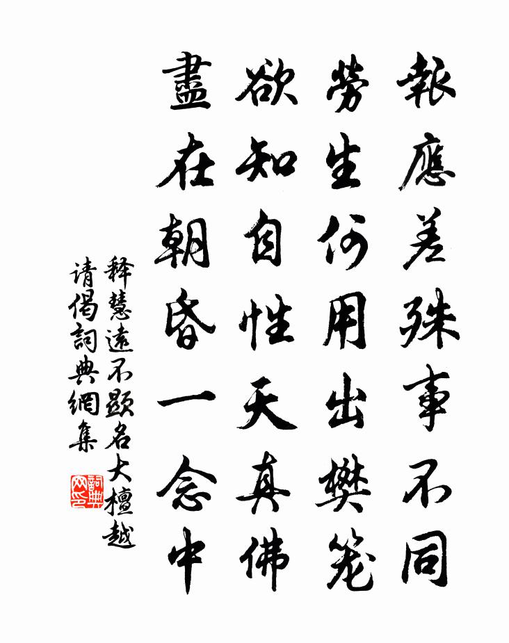 詩詞名句歷史字典書法欣賞書法字典國語詞典說文解字康熙字典古漢語字典標 題 作 者 詩 句 不顯名大檀越請偈作者:釋慧遠 朝代:宋代不顯名大檀越請偈原文報應差殊事不同,勞生何用出樊籠。欲知自性天真佛,盡在朝昏一念中。詩詞問答問:不顯名大檀越請偈的作者是誰?答:釋慧遠問:不顯名大檀越請偈寫於哪個朝代?答:宋代釋慧遠不顯名大檀越請偈書法欣賞不顯名大檀越請偈書法作品詩詞推薦生日子聿作五字詩十首為壽追懷先親泣然有作陸游〔宋代〕我生尚及宣和末,頒歷頻驚歲月移。負米養親無復日,蓼莪廢講豈勝悲!渡江百口今誰在?抱恨終身秪自知。文字首尾吟邵雍〔宋代〕堯夫非是愛吟詩,詩是堯夫鑒誡時。意淺不知多則惑,心靈須識動之微。行兇既有人誅戮,心善豈無天保持。讀易上冢還過方橋項安世〔宋代〕一番新火試新茶,又向方橋記歲華。草色前頭見江樹,桑林多處是人家。拓開白鳥天邊眼,背盡紅塵腳底沙。臨老雲端文天祥〔宋代〕半空夭矯起層台,傳道劉安車馬來。山上自晴山下雨,倚闌平立看風雷。送恭叔赴海門尉端叔約同過湘西酌別四首趙蕃〔宋代〕入自芝蘭室,重之珠玉淵。一官從草草,萬卷本便便。對鏡平多壘,閒郊辟廢田。尉曹應事少,賓友定誰延。和前人韻辛棄疾〔宋代〕茶瓜不作片時留,又向悠然作勝游。花徑似經新掃酒,竹林喚起舊風流。天教有象皆楷寫,世已無書可校讐。長日醉中紀事題辰州淨因寺廖行之〔宋代〕山城春半時,底事風作惡。小隱杜書帷,暗想花蕭索。命駕訪林藪,尋芳到叢薄。漫山粲百英,隨分有餘樂。縈迴三月三日懷微之白居易〔唐代〕良時光景長虛擲,壯歲風情已暗銷。忽憶同為校書日,每年同醉是今朝。九日戴復古〔宋代〕醉來風帽半欹斜,風度他鄉對菊花。最苦酒徒星散後,見人兒女倍思家。石淙武則天〔唐代〕三山十洞光玄籙,壓嶠金巒鎮紫微。均露均霜標勝壤,交風交雨列皇畿。萬仞高岩藏日色,千尋幽澗浴雲衣。且駐自和前詩鄰舟皆鹽商戴復古〔宋代〕總被利名役,機心欲算沙。舟行阻風色,客夢負年華。洲渚四五曲,漁樵 * 家。江村無限好,滿眼是蘆花。懷寄寇元弼王文舉十首之七局中歸賀鑄〔宋代〕不見西街客,歸來即閉門。胡床面南樹,鳥鵲啅黃昏。梅花余觀復〔宋代〕自是孤芳集大成,紅紅白白漫爭名。天邊差有雪堪亞,世上更無花敢清。筆到花光空幻想,句如和靖藹遺聲。一枝新營別墅寄家兄竇鞏〔唐代〕懶性如今成野人,行藏由興不由身。莫驚此度歸來晚,買得西山正值春。和文與可洋川園池三十首 冰池蘇軾〔宋代〕不嫌冰雪繞池看,誰似詩人巧耐寒。記取羲之洗硯處,碧琉璃下黑蛟蟠。丁酉元日陳深〔宋代〕夜中不成寐,臥覺風剡剡。殘寒賣餘勇,飛雪獨萬慘。黎明卷新霽,旭日光晻晱。窮陰得陽和,春氣已先感。負暝誦詩陳杰〔宋代〕盛氣劘騷壘,長歌歷杜藩。二南四字始,萬古一解難。三岡湖觀月魏叔介〔宋代〕波月互吐吞,清光忽下土。風來山影開,空水相磨盪。煙樹映交加,碎入漁家網。仿佛華子岡,吟詩獨來往。新沼竹軒梅堯臣〔宋代〕作軒仍見竹,瀟灑排青幢。斜烏與落月,靜影晝寒窗。光沒影亦沒,激水自淙淙。夜深猶讀易,誰更憶清江。游龍門詩十二首廣化寺韓維〔宋代〕日照香剎端,風生石門下。精誠或有禱,嘉況如可把。安得飛片雲,坐看靈澤灑。名句推薦此已被私慾隔斷,不是知行的本體了。王陽明《傳習錄·卷上·徐愛錄》 聞風聲鶴唳,皆以為王師已至房玄齡《晉書·列傳·第四十九章》 夫妻反目,不能正室也。佚名《易傳·象傳上·小畜》 流水落花春去也,天上人間。李煜《浪淘沙令·簾外雨潺潺》 脈脈花疏天淡,雲來去、數枝雪。范成大《霜天曉角·梅》 月落烏啼霜滿天,江楓漁火對愁眠。張繼《楓橋夜泊 / 夜泊楓江》 寒色孤村幕,悲風四野聞。洪升《雪望》 雲外好呼南去雁,系書先為報江鄉。齊之鸞《九日登清水營城》 原濁者,流不清;行不信者,名必耗。墨子《墨子·02章 修身》 燕子欲歸時節,高樓昨夜西風。晏殊《破陣子·燕子欲歸時節》