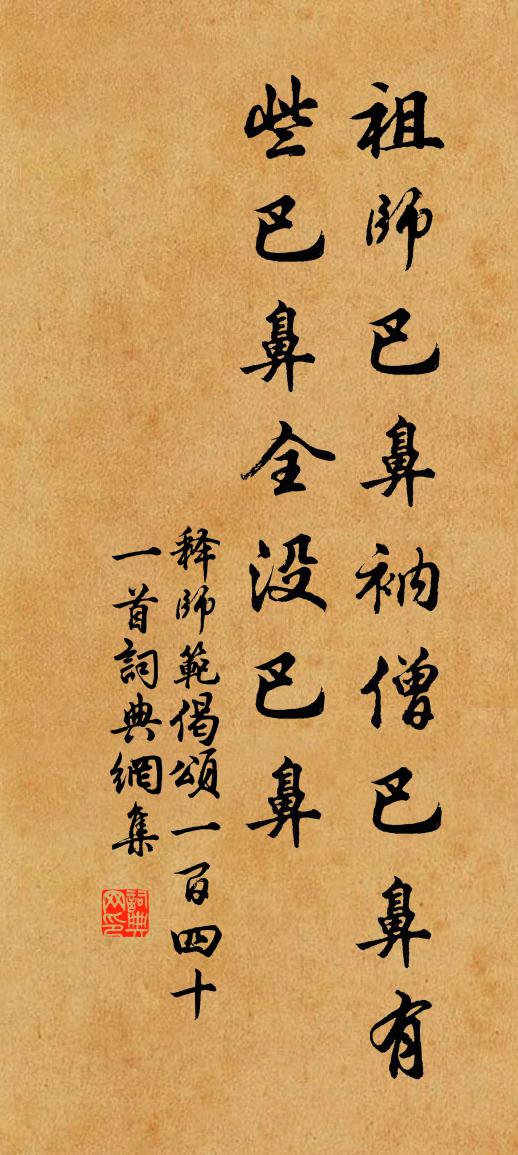 詩詞名句歷史字典書法欣賞書法字典國語詞典說文解字康熙字典古漢語字典標 題 作 者 詩 句 偈頌一百四十一首作者:釋師範 朝代:宋代偈頌一百四十一首原文祖師巴鼻,衲僧巴鼻。有些巴鼻,全沒巴鼻。詩詞問答問:偈頌一百四十一首的作者是誰?答:釋師範問:偈頌一百四十一首寫於哪個朝代?答:宋代釋師範偈頌一百四十一首書法欣賞偈頌一百四十一首書法作品詩詞推薦飲袁提學林亭方回〔宋代〕古淡林縈沼,清輝日漏雲。百梅先世植,一鶴舊侯分。天引吟懷遠,春供飲意醺。徐卿二雛者,已解聽論文。去冬因元鎮有見懷詩草草用韻錄上並謝錄妙藥陳長方〔宋代〕南來仙驥一迴翔,古墨丹砂並送將。從此微軀常得健,學君揮翰詎能忘。霜寒碧澗行蹤少,月落青林去夢長。相見皇雅十首《西師》六章尹洙〔宋代〕帝曰孟侯,受封於楚。淑旂琱戈,備物異數。俾爾族姻,及乃文武。服在王庭,靡不有序。寄吳鈐乾高似孫〔宋代〕有偉千人傑,能為萬里游。掛帆春北雁,問驛夜驚鷗。道路空留滯,文章莫暗投。九疑生雨遍,三峽帶寒流。採藥再次韻賦飛雪數片方回〔宋代〕雨收霰止絕纖埃,壓瘴迎豐光已開。欲積忍將靴踏去,初飄喜著袖盛來。微微糝體尋生粟,稍稍粘枝輒亂梅。不解山中陳普〔宋代〕便是人間一洞天,墮樵煮茗書騰煙。深春筍蕨千鍾祿,落日漁樵三島仙。一脈甘泉生白石,數竿修竹對青氈。天關台州郡治十二詩太守尤延之命賦雙岩堂林憲〔宋代〕兩崖玉巉然,秀色真可餐。嵐煙落窗幾,慘澹雲水閒。幽人美清夜,和月憑欄乾。天空山影直,八表生晴寒。題崇因院信上人宿雲軒王之道〔宋代〕秋聲入高梧,暝色上疏竹。南山攏青螺,過已淨如沐。悠然孤飛雲,窈窕轉休麓。自疑歸去晚,意欲窗下宿。道人偶題晁說之〔宋代〕一室蕭然懶傍書,角巾孤嘯問何如。夕陽能使山遠近,秋色巧隨人慘舒。苔漬碧花行不到,香殘篆字睡應余。自憐離宿州後寄兄弟張耒〔宋代〕落日村橋涕泫然,東風匹馬去翩翩。兩行綠樹當隋岸,一片春雲限楚天。妄意致身常許國,強顏得祿廢求田。幅巾臨江仙(傳丈生日)洪适〔宋代〕乾呂青雲垂寶露,結鄰恰掛初弦。瑞光騰踴雜非煙。騎箕瞻鼻祖,孕昴控胎仙。勳業子卿全漢節,壯懷久寄林泉。延平范子登同侄祖年見訪惠詩次韻陳宓〔宋代〕森森九桂植岩幽,所謂伊人在一洲。別後道尊君可慕,病餘學廢我堪羞。雪驚新白傳佳詠,雲□殘黃會晚秋。多謝送蔣穎叔帥熙河二首秦觀〔宋代〕侍臣不合出都門,為有威名蕃漢尊。戶部左曹回妙手,匈奴右臂落清樽。揮毫珠璧生談笑,轉盼龍鸞在夢魂。瀚海十一月十日酒散已二鼓與千里步月因至水堂葛立方〔宋代〕杖策踏霜月,滿空煙霧浮。蒼顏酡蚊酒,黑帝避貂裘。太液池台晚,廣寒宮殿秋。歸來清耿耿,未省喘吳牛。皇太子誕慶宋祁〔宋代〕軒袥深叢佑,文支此挺生。重輪當月滿,一索應乾成。瑞瓞昌綿緒,天弧仗左檠。海雖分幼潤,星已慶前名。緩帶為牟德范題石湖遺墨意有未盡復賦五首方回〔宋代〕青春日月羈塵鞅,朱夏乾坤熾暑爐。略對風檐紬古卷,閒愁吹得一星無。牡丹韓琮〔唐代〕桃時杏日不爭濃,葉帳陰成始放紅。曉艷遠分金掌露,暮香深惹玉堂風。名移蘭杜千年後,貴擅笙歌百醉中。如夢毛國鎮生日二絕蘇轍〔宋代〕生日元同小趙公,里閭相接往還通。怪公日夜歸心切,欲寄此生丹灶中。〈世謂叔平大趙參政、閱道小趙參政趙公魚蘇軾〔宋代〕湖上移魚子,初生不畏人。自從識鉤餌,欲見更無因。別茂直鄭剛中〔宋代〕故人官江濱,藹藹起清望。因漂似木偶,千里遠相向。窮達懷異趣,雅故恐遺忘。暨我即門牆,公喜不可狀。握手名句推薦不在其位,不謀其政。孔子弟子《論語·泰伯篇》 人患志之不立,亦何憂令名不彰邪?劉義慶《世說新語·自新》 盡信書,則不如無書。孟子《孟子·盡心章句下·第三節》 王濬樓船下益州,金陵王氣黯然收。劉禹錫《西塞山懷古》 又似賈客蜀道間,千鐸萬磬鳴空山牛殳《琵琶行》 百歲落半途,前期浩漫漫。李白《登敬亭山南望懷古贈竇主簿》 法之不行,自於貴戚。司馬遷《史記·秦本紀》 稚子金盆脫曉冰,彩絲穿取當銀鉦。楊萬里《稚子弄冰》 帶長劍兮挾秦弓,首身離兮心不懲。屈原《國殤》 小舟橫截春江,臥看翠壁紅樓起。蘇軾《水龍吟·閭丘大夫孝終公顯嘗守黃州》