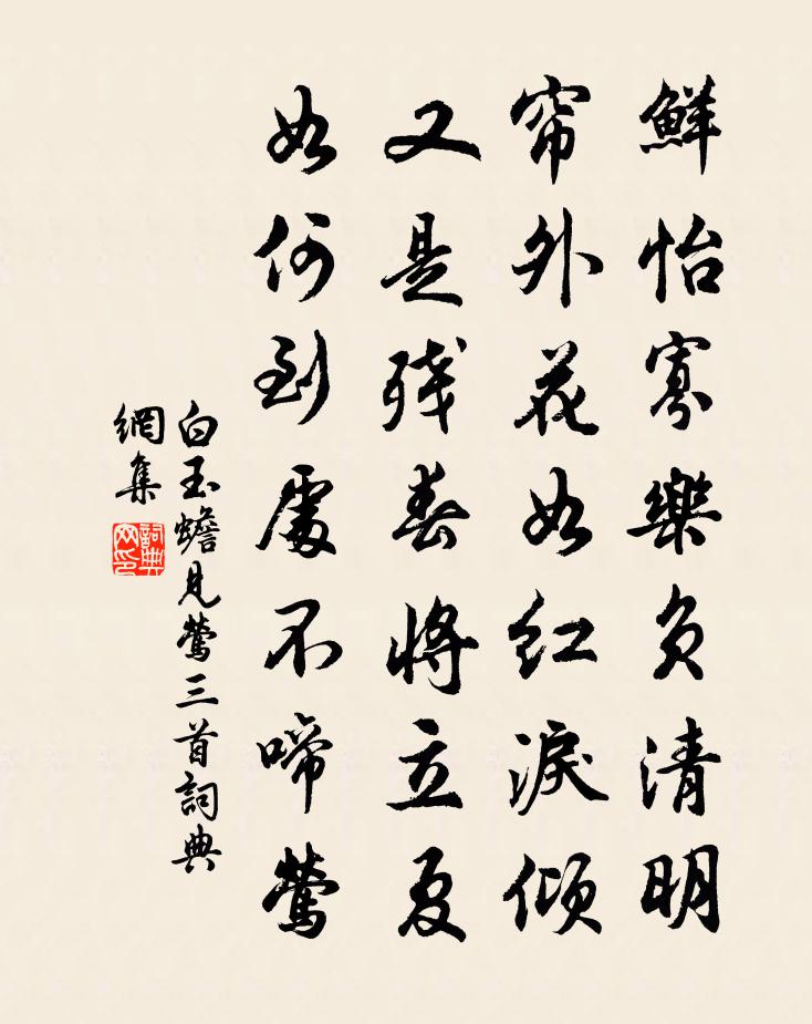 詩詞名句歷史字典書法欣賞書法字典國語詞典說文解字康熙字典古漢語字典標 題 作 者 詩 句 見鶯三首作者:白玉蟾 朝代:宋代見鶯三首原文鮮怡寡樂負清明,簾外花如紅淚傾。又是殘春將立夏,如何到處不啼鶯。詩詞問答問:見鶯三首的作者是誰?答:白玉蟾問:見鶯三首寫於哪個朝代?答:宋代問:見鶯三首是什麼體裁?答:七絕白玉蟾見鶯三首書法欣賞見鶯三首書法作品詩詞推薦君山石祖文〔宋代〕遠邇朝宗勢拱辰,名高豈特為春申。孤峰堆阜無多地,一水仙凡隔幾塵。簪履三千誰念楚,山河百二漫夸秦。雲煙分水嶺葛紹體〔宋代〕岐路東西分,閩浙自茲異。平波翼藂筱,荒丘帶深隧。漸聞新蠻音,不見舊朋類。悽然獨含情,誰與話幽意。滿空本農張詠〔宋代〕奢競苦不息,生民只有冤。誰搜元化窟,鑿斷麗華根。使絕侵奪苦,著為明聖恩。何煩重師古,即此是羲軒。張昌宗徐鈞〔宋代〕乘鶴吹笙想俊游,醜聞宮掖擅風流。身膏斧躓終塵土,若比蓮花花亦羞。玉燭新·花穿簾隙透吳文英〔宋代〕花穿簾隙透。向夢裡銷春,酒中延晝。嫩篁細掐,想思字、墮粉輕黏D139袖。章台別後,展繡絡、紅蔫香舊。江橫暮景蒲壽宬〔宋代〕獨倚闌乾對落霞,垂楊古渡欲棲鴉。漁翁何處煙藏浦,白鷺成群月浸沙。淚落西風叫黃鵠,酒闌深夜聽琵琶。誰人龍泉陳造〔宋代〕神龍媚此清淺居,欻然騰陵行太虛。越已倚賴龍沾濡,頻年歲事勝三吳。到仁一視無戚疎,置彼此及心缺如。嗟龍乙未春初解漕幕兼職訪秋壑西湖探韻得柳字趙孟堅〔宋代〕浮生恍流萍,聚難別易久。經年稀會面,感嘆兩執手。競夸摛錦文,雄騁翻河口。主人金叵羅,頗費黃封酒。環坐四休居士詩三首黃庭堅〔宋代〕富貴何時潤髑髏,守錢奴與拘官囚。太醫診得人間病,安樂延年萬事休。至濟南李公擇以詩相迎次其韻二首蘇軾〔宋代〕敝裘羸馬古河濱,野闊天低糝玉塵。自笑餐氈典屬國,來看換酒謫仙人。宦遊到處身如寄,農事何時手自親。剩作偈頌七十六首釋子益〔宋代〕二千年前,通身是垢。二千年後,滿面埃塵。直饒九曲黃河水,洗到驢年也不清。贈沈生還江州張昱〔元代〕鄉心正爾怯高樓,況復樓中賦遠遊。客里登臨俱是感,人間送別不宜秋。風前落葉隨車滿,日下浮雲共水流。知汝鰲頂峰王逵〔宋代〕眼看滄海近,身與白雲高。回影連三島,盤根壓六鰲。訪雲母山僧護國〔唐代〕森然古岩里,淨行一番僧。松下濾寒水,佛前挑夜燈。蓮花國土異,貝葉梵書能。想到空王境,無心問愛憎。贈郭駙馬(郭令公子曖尚昇平公主令於席上成此詩)李端〔唐代〕青春都尉最風流,二十功成便拜侯。金距鬥雞過上苑,玉鞭騎馬出長楸。薰香荀令偏憐少,傅粉何郎不解愁。日暮蘇幕遮高道寬〔元代〕玉爐中,燒丹藥。鍛鍊三成,最上真箇妙。海底龜蛇勤收捉。納在壺中,煉就圓明覺。照無邊,光灼灼。順手拈來王更令王哲〔元代〕五更終,鼓聲閒,被那人,擂動做成顛倒。金盤內、托出神珠,放霞光萬道。窈窈冥冥真箇好。從此復通他,當初菩薩蠻(佳人)陳師道〔宋代〕曉來誤入桃源洞。恰見佳人春睡重。玉腕枕香腮。荷花藕上開。一扇俄驚起。斂黛凝秋水。笑倩整金衣。問郎來幾圓機和邵大及予二詩可謂壓倒五更枕上誦嘆不晁說之〔宋代〕去歲巢乾燕子歸,生涯辛苦問何時。門前似覺酒徒散,坐上何嘗筆力衰。郡印故人能若若,田廬晚友亦差差。莫嫌漁父詞宋高宗〔宋代〕魚信還催花信開,花風得得為誰來。舒柳眼,落梅腮,浪暖桃花夜轉雷。名句推薦我自中宵成轉側,忍聽湘弦重理。納蘭性德《金縷曲·亡婦忌日有感》 已過才追問,相看是故人。吳偉業《遇舊友》 大樹無枝向北風,十年遺恨泣英雄。高啟《吊岳王墓》 傷情燕足留紅線,惱人鸞影閒團扇。張可久《塞鴻秋·春情》 淒涼寶劍篇,羈泊欲窮年。李商隱《風雨》 高築牆,廣積糧張廷玉《明史·列傳·卷二十四》 今夜送歸燈火冷,河塘,墮淚羊公卻姓楊。蘇軾《南鄉子·和楊元素時移守密州》 埋骨何須桑梓地,人生無處不青山。 * 《七絕·改西鄉隆盛詩贈父親》 三杯吐然諾,五嶽倒為輕。李白《俠客行》 男兒少為客,不辨是他鄉。李流芳《黃河夜泊》