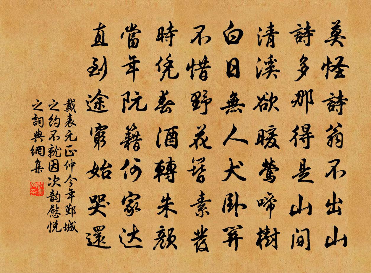 詩詞名句歷史字典書法欣賞書法字典國語詞典說文解字康熙字典古漢語字典標 題 作 者 詩 句 正仲今年鄞城之約不就因次韻慰悅之作者:戴表元 朝代:宋代原文莫怪詩翁不出山,詩多那得是山間。清溪欲暖鶯啼樹,白日無人犬臥關。不惜野花簪素髮,時憑春酒轉朱顏。當年阮籍何家達,直到途窮始哭還。詩詞問答問:《正仲今年鄞城之約不就因次韻慰悅之》的作者是誰?答:戴表元問:該詩寫於哪個朝代?答:宋代書法欣賞正仲今年鄞城之約不就因次韻慰悅之書法作品詩詞推薦與冢婦朱柔則紫靜儀〔清代〕深閨白日靜,薰香垂羅幬。病起罷膏沐,淡若明河秋。 自汝入家門,操作苦不休。萍藻既鮮潔,牖戶還綢繆。丈偈頌一百一十七首釋紹曇〔宋代〕忠清千古燦奎文,蓋世功名富貴生。旌佩擁云何處去,毗盧樓閣款經行。頌古十六首釋道寧〔宋代〕春去復春來,桃花依舊開。東風浩浩曾無間,剛地靈雲道不猜。五方帝佚名〔宋代〕水官修職,星昂居方。執權含寮,萬物伏藏。大明昌祚,臨下皇皇。日寒時若,神降之康。元豐己未三院東閣作元豐戊午夏予尹京治陳蘇頌〔宋代〕秋杪拘留冬欲闌,一旬參對累旬間。適逢御史俱厘務,更值中朝久絕班。壁觀無言休問祖,坐忘遺照且晞顏。是非冬日放言二十一首張耒〔宋代〕卯飲終日醉,萬事付悠悠。醺然據榻瞑,檐雨方颼颼。吾事幸無急,不醉欲何求。顧謂婦與子,酒盡為我謀。過竹村張鎡〔宋代〕再宿離城邑,全無世俗氣。僧包輕濺水,漁灶冷炊雲。酒好休教盡,詩慳卻自欣。晝閒貪睡穩,獨被不須重。與同寮游甘泉苦竹二寺孔武仲〔宋代〕兩寺藏山曲,登臨恨阻修。平時極目處,今日探春遊。苦竹經霜老,甘泉帶雪流。醇醪暖肌骨,歸路卸輕裘。途中寄徐錄事(比以王書見贈)高適〔唐代〕落日風雨至,秋天鴻雁初。離憂不堪比,旅館復何如。君又幾時去,我知音信疏。空多篋中贈,長見右軍書。【不知宮調】時新樂周文質〔元代〕千里獨行關大王,私下三關楊六郎,張飛忒煞強,諸葛軍師賽張良。暗想,這場,張飛莽撞,大鬧臥龍岡,大鬧臥謝豈庵餉澄粉圓子張鎡〔宋代〕老蚌嘗聞生合浦,射彩飛芒互吞吐。都緣晝夜兩跳丸,縈繞須彌照寰宇。金鴉遠逐銀蟾蜍,傳孕億萬皆成珠。荒寒題平等院薛能〔唐代〕十里城中一院僧,各持巾缽事南能。還應笑我功名客,未解嫌官學大乘。百字令(壽虞守·正月十二)陳潛心〔宋代〕梅峰孕秀,太仙翁、咫尺元宵三夕。盛德溫溫如玉粹,多少殊勛嘉績。兩擁朱幡,獨清節,高誼真難屈。景疏堂下和李員外與舍人詠玫瑰花寄徐侍郎司空曙〔唐代〕仙吏紫薇郎,奇花共玩芳。攢星排綠蒂,照眼發紅光。暗妒翻階藥,遙連直署香。游枝蜂繞易,礙刺鳥銜妨。露濕滿江紅華岳〔宋代〕自古麻稱稀,須麻信道、人麻生七十。當七月、慶生佳節,更逢七夕。丹鼎 * 多兩轉,蟠麻王母無雙實。更竹林送曹秀才陳師道〔宋代〕甲第衣冠後,東遷歲月侵。情親期一諾,急病闕千金。孰並還家樂,毋忘在莒心。時能記衰疾,聲跡到雲林。周鄭交質左丘明〔先秦〕鄭武公、莊公為平王卿士。王貳於虢,鄭伯怨王。王曰:“無之。”故周鄭交質。王子狐為質於鄭,鄭公子忽為質石?熊邦彥〔宋代〕萬壑雲霾凝不消,橫空突起老龍腰。虛皇未放拿雲去,留與金仙作石橋。游龍門香山寺蔡襄〔宋代〕彩閣縈林轉,蒼崖隔水開。龕明千像日,波起一灘雷。綠淺春前草,香余臘後梅。背人驚鷺去,將雨好風來。風氣贈江西詩客吳晦之〔宋代〕五言詩作七寶塔,四壁惟餘八尺床。一月二十九日醉,百年三萬六千場。名句推薦雙飛燕子幾時回?夾岸桃花蘸水開。徐俯《春遊湖》 實無有法佛得阿耨多羅三藐三菩提。鳩摩羅什譯《金剛經·究竟無我》 面譽者不忠,飾貌者不情戴聖《大戴禮記·文王官人第七十二》 繡袂捧琴兮,登君子堂。貫休《善哉行·傷古曲無知音》 白雲依靜渚,春草閉閒門。劉長卿《尋南溪常山道人隱居 / 尋南溪常道士》 隰桑有阿,其葉有幽。佚名《隰桑》 謙尊而光,卑而不可逾,君子之終也。佚名《易傳·彖傳上·謙》 亂雲低薄暮,急雪舞迴風。杜甫《對雪》 圓荷浮小葉,細麥落輕花。杜甫《為農》 晚來風起花如雪,飛入宮牆不見人。劉禹錫《楊柳枝詞九首》