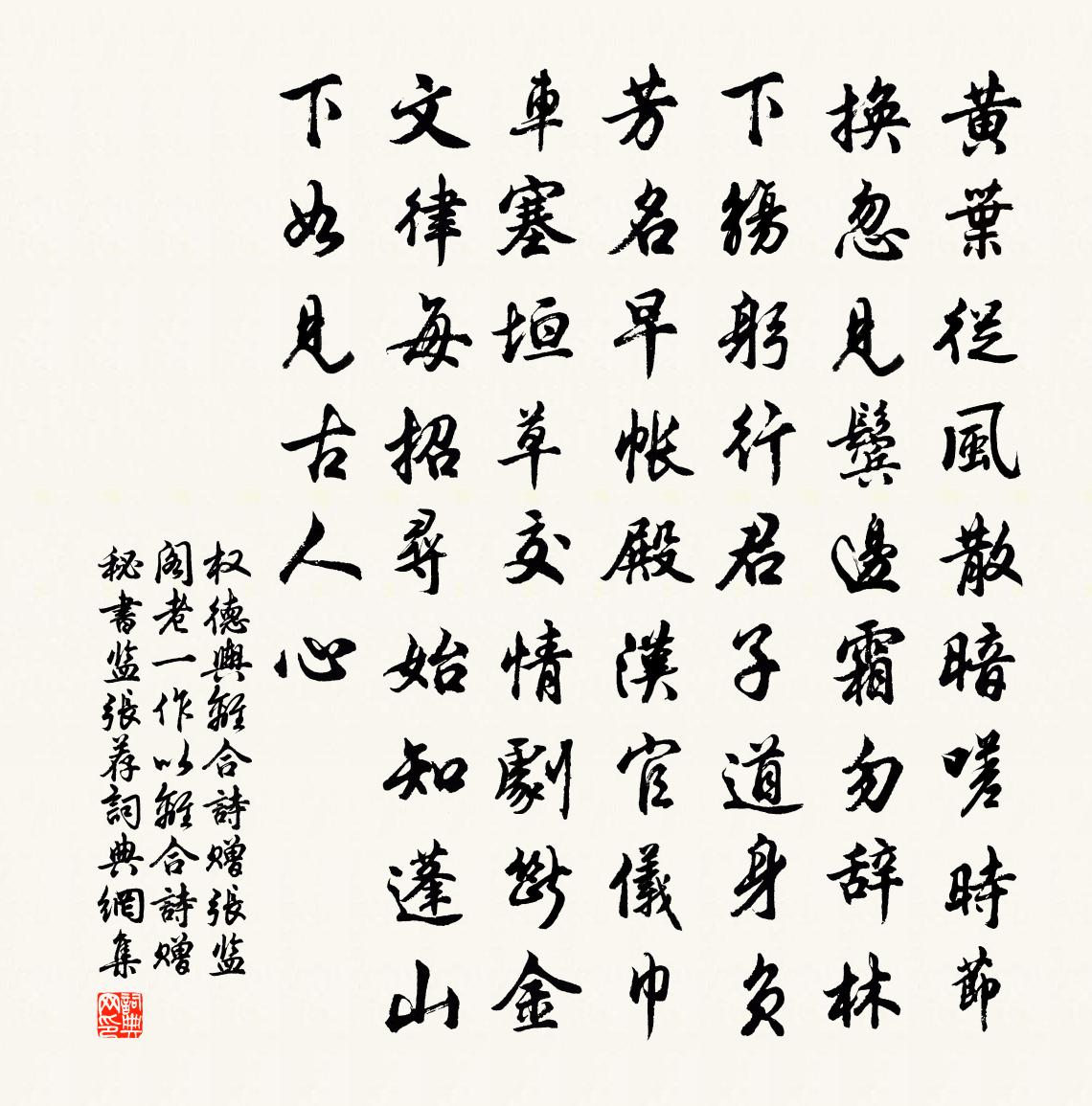 詩詞名句歷史字典書法欣賞書法字典國語詞典說文解字康熙字典古漢語字典標 題 作 者 詩 句 離合詩贈張監閣老(一作以離合詩贈秘書監張薦)作者:權德輿 朝代:唐代原文黃葉從風散,暗嗟時節換。忽見鬢邊霜,勿辭林下觴。躬行君子道,身負芳名早。帳殿漢官儀,巾車塞垣草。交情劇斷金,文律每招尋。始知蓬山下,如見古人心。詩詞問答問:《離合詩贈張監閣老(一作以離合詩贈秘書監張薦)》的作者是誰?答:權德輿問:該詩寫於哪個朝代?答:唐代問:該詩是什麼體裁?答:五古書法欣賞離合詩贈張監閣老(一作以離合詩贈秘書監張薦)書法作品注釋全唐詩:卷327-17詩詞推薦初致仕後戲酬留守牛相公 並呈分司諸寮友。白居易〔唐代〕南北東西無所羈,掛冠目在勝分司。探花嘗酒多先到,拜表行香盡不知。炮筍烹魚飽餐後,擁袍枕臂醉眠時。報君佳人醉(元宵上太守)劉弇〔宋代〕月到樓台第幾。十里金蟲成綴。裊琅玕、爭罥絳球起。試新妝、嬉春粉黛,盈盈暗香,接誰家穠李。擁緹騎。簫鼓孟子天爵陳普〔宋代〕利名物外奚必用,至貴無虧備自身。舍已從人徒取賤,到頭還自喪其真。採桑子(孫仲益集於西齋,題侍兒作第一流,因以詞謝之)蔡伸〔宋代〕奇花不比尋常艷,獨步南州。往事悠悠。遼鶴重來憶夢遊。仙翁不改青青眼,一醉遲留。妙墨銀鉤。題作人間第一歲晚次韻答李在明戴表元〔宋代〕墨鄉守墨不作惡,歲晚左就醉鄉公。何人吾伊驚夜半,大雪北窗歌國風。題方乾舊隱李若谷〔宋代〕奇峰重複疊,宅在翠屏間。僧到偏憐靜,雲留自共閒。岩前樵徑接,門外釣舟還。老約為鄰並,須求一畝山。奉和裴令公新成午橋莊綠野堂即事白居易〔唐代〕舊徑開桃李,新池鑿鳳凰。只添丞相閣,不改午橋莊。遠處塵埃少,閒中日月長。青山為外屏,綠野是前堂。引水恩忝西掖垣宋庠〔宋代〕賢路塵消篋謗殘,蕭蕭衰鬢得生還。久叨鴟尾三重閣,卻趁蛾眉五日班。傷翼再來仍繞樹,行云何處不思山。坐揮黃山中用省齋韻見寄次韻謝二首楊公遠〔宋代〕話別匆匆二月天,回眸兩見月虧圓。數聲乾鵲才聞後,一幅鸞箋忽墮前。風雨對床何日遂,雁魚傳信幾時還。每逢中秋大風雨五絕劉克莊〔宋代〕□□□□□,冰輪□□□。□□□□妒,不管素娥愁。雨霖鈴長筌子〔元代〕清晨凝佇。見風雲濟,及作時雨。陰陽協順空中,為甘露、山澤敷布。點點如膏利益,洗滅妖氛,四海澄素。造化寄葉應之朱翌〔宋代〕人老江湖外,官拘簿領緣。劇談嘗共夜,好句得先傳。行李無他阻,朝廷有闕員。相逢一笑喜,已種玉為田。送廣師謁竹溪中書五言二首劉克莊〔宋代〕五十有三個,問法向誰邊。村老小顛爾,竹溪翁大顛。清平樂 題桐花道人吳國良卷石岩〔元代〕吳郎豐度。邂逅春城暮。暖日晴雲花滿樹。恰似故人詩句。坐中翔鳳飛霞。來尋弄玉仙家。說與江州司馬。淚痕只清龍寺早夏白居易〔唐代〕塵埃經小雨,地高倚長坡。日西寺門外,景氣含清和。閒有老僧立,靜無凡客過。殘蔦意思盡,新葉陰涼多。春去幽蘭鮑照〔南北朝〕眇眇蛸掛網。漠漠蠶弄絲。空慚不自信。怯與君畫期。題濟勝七物一拄杖陳造〔宋代〕驚蛇卻犬破莓苔,筇竹隨公幾往回。龍化葛陂應未忍,為扶衰病作陳雷。梅花二首陳與義〔宋代〕鐵面蒼髯洛陽客,玉顏紅領會稽仙。街頭相見如相識,恨滿東風意不傳。長相思石孝友〔宋代〕樹槎牙。冰交加。冷艷疏疏瘦影斜。幾枝梅花放。天一涯。語三叉。已是情多怨物華。那堪更憶家。失調名佚名〔宋代〕明年此□,□知誰健,且盡黃花酒。名句推薦鴻雁不堪愁里聽,雲山況是客中過。李頎《送魏萬之京》 聽君一席話,勝讀十年書。佚名《增廣賢文·上集》 欲剪箱中一尺天,吳娥莫道吳刀澀李賀《羅浮山父與葛篇》 玲瓏骰子安紅豆,入骨相思知不知。溫庭筠《南歌子詞二首 / 新添聲楊柳枝詞》 父母之年,不可不知也。一則以喜,一則以懼。孔子弟子《論語·里仁篇》 閣雪雲低,卷沙風急,驚雁失序。吳文英《永遇樂·探梅次時齋韻》 為政不難,不得罪於巨室。孟子《孟子·離婁章句上·第六節》 池塘生春草,園柳變鳴禽。謝靈運《登池上樓》 君在天一涯,妾身長別離。江淹《古離別》 典盡客衣三尺雪,煉精詩句一頭霜。王建《維揚冬末寄幕中二從事》