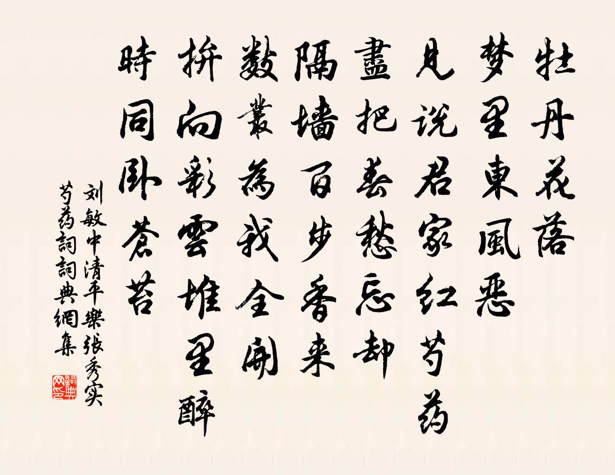 詩詞名句歷史字典書法欣賞書法字典國語詞典說文解字康熙字典古漢語字典標 題 作 者 詩 句 清平樂 張秀實芍藥詞作者:劉敏中 朝代:元代清平樂 張秀實芍藥詞原文牡丹花落。夢裡東風惡。見說君家紅芍藥。盡把春愁忘卻。隔牆百步香來。數叢為我全開。拚向彩雲堆里,醉時同臥蒼苔。詩詞問答問:清平樂 張秀實芍藥詞的作者是誰?答:劉敏中問:清平樂 張秀實芍藥詞寫於哪個朝代?答:元代問:清平樂 張秀實芍藥詞是什麼體裁?答:詞劉敏中清平樂 張秀實芍藥詞書法欣賞清平樂 張秀實芍藥詞書法作品詩詞推薦沁園春(單景山雪中以學佛自誇,因次韻戲抑之)陳著〔宋代〕瀟灑書齋,香清縷直,燈冷暈圓。忽驚窗鳴瓦,霰如篩下,裁冰翦玉,片似花鮮。深怕妨梅,也愁折竹,才作還休過含山郵亭和子厚弟壁間韻三首王之道〔宋代〕透雲斜日影朦朧,樹杪依微少女風。景物重來正無恙,為君收拾向詩中。夢中作陸游〔宋代〕野鶴翩僊啄粒微,碧桃縹緲著花稀。海山又見春風到,丹灶苔封人未歸。富谷館王珪〔唐代〕萬雀噪山館,重來一扣扉。去年寒夢在,今日遠書違。殘雪留春橐,疏星掛曉衣。帝鄉不可望,心與白雲飛。又和洪咨夔〔宋代〕終朝聒得耳神飛,東舍西鄰盡販機。百樣攀花無我分,慣將簾作後堂衣。和傅侍郎鹿鳴宴韻二首劉宰〔宋代〕先生讜論在延英,早歲金甌已覆名。自古正人羞枉尺,祗今公論有持衡。九重聞道將飛韶,一水何妨緩作程。莫笑偈三首釋進英〔宋代〕報慈有一公案,諸方未曾結斷。幸遇改旦拈出,各請高著眼看。扶風歌劉琨〔魏晉〕南山石嵬嵬。松柏何離離。上枝拂青雲。中心十數圍。洛陽發中梁。松樹竊自悲。斧鋸截是松。松樹東西摧。特作山中吟釋文珦〔宋代〕山林雖寂寞,變可息塵勞。野食分猿果,寒衣補毳袍。雲蹤常散誕,松貌極孤高。賦詠隨吾意,無心更擬騷。櫻桃煎楊萬里〔宋代〕含桃丹更圜,輕質觸必碎。外看千粒珠,中藏半泓水。何人弄好手?萬顆搗虛脆。印成花鈿薄,染作水澌紫。北果頌古一百首釋智愚〔宋代〕拔樹鳴條浩浩風,雨雲翻覆在其中。千波萬浪驚天地,到海方知信不通。郴江百詠並序尊勝寺阮閱〔宋代〕老僧不復識叢林,只說幽棲是息心。可惜一溪東去水,更無軒石稱登臨。壽范漕吳泳〔宋代〕伏波老子縛長虬,典護蘭闈更兩秋。學問只從苗脈看,辭章不響語言求。俱稱腳跡門生好,無復顏行執事羞。夾袋晦日同苗員外游曲江李端〔唐代〕晦日同攜手,臨流一望春。可憐楊柳陌,愁殺故鄉人。重和元少尹白居易〔唐代〕鳳閣舍人京亞尹,白頭俱未著緋衫。南宮起請無訊息,朝散何時得入銜?池陽四詠周必大〔宋代〕天遣江山助牧之,謝材猶及杜筠兒。向來稍喜唐風集,今信樊川是父師。偈頌一百二十三首釋普度〔宋代〕春風卷春雨,春樹生春煙。作家相見不談禪。天寒燒榾柮,雲外煮清泉。更有一般風味在,從來附子出西川。南楚杜甫〔唐代〕南楚青春異,暄寒早早分。無名江上草,隨意嶺頭雲。正月蜂相見,非時鳥共聞。杖藜妨躍馬,不是故離群。子由生日蘇軾〔宋代〕上天不難知,好惡與我一。方其未定間,人力破陰騭。少忍待其定,報應真可必。季氏生而仁,觀過見其實。端如皇帝上平上皇帝壽樂曲公卿入門用禮安之曲崔敦詩〔宋代〕端闈肅啟,金奏和聲。有來濟濟,燁其華纓。度中規矩,步協英莖。一人達孝,百辟丕承。名句推薦功名萬里外,心事一杯中。高適《送李侍御赴安西》 樂者,聖王之所樂也,而可以善民心,其感人深,其移風易俗。故先王導之以禮樂,而民和睦。荀子《荀子·樂論》 一寸相思千萬緒。人間沒個安排處。李冠《蝶戀花·春暮》 雪霜凌厲而見殺,來歲不改其性也黃庭堅《書幽芳亭記》 獻賦十年猶未遇,羞將白髮對華簪。錢起《贈闕下裴舍人》 山高月小,水落石出。蘇軾《後赤壁賦》 雖然不如延年妹,亦是當時絕世人。李白《中山孺子妾歌》 病骨支離紗帽寬,孤臣萬里客江乾。陸游《病起書懷》 故鄉今夜思千里,霜鬢明朝又一年。高適《除夜作》 夜長爭得薄情知,春初早被相思染。姜夔《踏莎行·自沔東來》