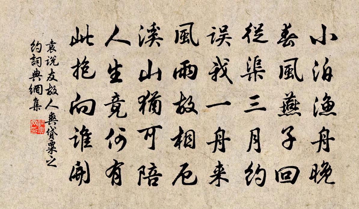 詩詞名句歷史字典書法欣賞書法字典國語詞典說文解字康熙字典古漢語字典標 題 作 者 詩 句 故人爽貸粟之約作者:袁說友 朝代:宋代故人爽貸粟之約原文小泊漁舟晚,春風燕子回。從渠三月約,誤我一舟來。風雨故相厄,溪山猶可陪。人生竟何有,此抱向誰開。詩詞問答問:故人爽貸粟之約的作者是誰?答:袁說友問:故人爽貸粟之約寫於哪個朝代?答:宋代袁說友故人爽貸粟之約書法欣賞故人爽貸粟之約書法作品詩詞推薦送曾仲錫通判如京師蘇軾〔宋代〕邊城歲暮多風雪,強壓春醪與君別。玉帳夜談霜月苦,鐵騎曉出冰河裂。斷蓬飛葉卷黃沙,只有千林{髟蒙}松花楊柳枝·桃源仙子不須夸司空圖〔唐代〕桃源仙子不須夸,聞道惟裁一片段預告。何似浣紗溪畔住,綠陰相間兩三家。和韋相公見示閒臥貫休〔唐代〕刻形求得相,事事未嘗眠。霖雨方為雨,非煙豈是煙。童收庭樹果,風曳案頭箋。仲虺專為誥,何充雅愛禪。靜嫌浣溪沙晏幾道〔宋代〕莫問逢春能幾回。能歌能笑是多才。露花猶有好枝開。綠鬢舊人皆老大,紅梁新燕又歸來。盡須珍重掌中杯。上冊寶十三首真宗〔宋代〕[大呂角二奏]吉蠲惟時,禮備既備。奉璋峨峨,群公在位。神之格思,永錫爾類。展彼令德,於焉來暨。紹興釋奠武成王七首佚名〔宋代〕赫赫尚父,時維鷹揚。神潛韓略,襟抱帝王。談笑致主,竹帛流芳。國有嚴祀,載稽典常。宿雲夢館歐陽修〔宋代〕北鴈來時歲欲昏,私書歸夢杳難分。井桐葉落池荷盡,一夜西窗雨不聞。虞美人王安石〔宋代〕虞美人,態濃意遠淑且真。同輦隨君侍君側,六宮粉黛無顏色。楚歌四面起,形勢反蒼黃。夜聞馬嘶曉無跡,蛾眉武宗輓歌詞二首顧非熊〔唐代〕睿略皇威遠,英風帝業開。竹林方受位,薤露忽興哀。靜塞妖星落,和戎貴主回。龍髯不可附,空見望仙台。蒼生子寶東歸以嚶其鳴矣求友聲為韻作古詩七章寬孫應時〔宋代〕弱齡抱微尚,實恥為身謀。頗依夷惠間,不擇趙魏優。意行忘坎穽,失腳復何尤。但存斗升養,過此今無求。橫吹曲辭洛陽道鄭嚴〔唐代〕客亭門外路東西,多少喧騰事不齊。楊柳惹鞭公子醉,紵麻掩淚魯人迷。通宵塵土飛山月,是處經營夾御堤。頃刻瑞香花范成大〔宋代〕萬粒叢芳破雪殘,曲房深院閉春寒。紫紫青青雲錦被,百疊薰籠晚不翻。酒惡休拈花蕊嗅,花氣醉人醲勝酒。大將江月亭會飲次袁主管韻惱吳鈐轄項安世〔宋代〕日西移幕看澄江,夜久回屏護燭光。暗裡微吟認漁火,醉中時醒為荷香。狂翻鸚鵡杯心綠,怒索蒲萄架底涼。苦恨慈烏行鄭獬〔宋代〕鴉鴉林中雛,日晚猶未棲。口銜山櫻來,獨向林中啼。林中有鴉父,昔生六七兒。一朝棄之去,空此群雛悲。意謂自勉陸游〔宋代〕自信直如弦,殘年偶得全。老猶嗤佞佛,貧亦諱言錢。旦暮勤鞭策,麈埃痛洗湔。仍須語兒子,此事要家傳。除日送龍涎香與宋評事二首曾豐〔宋代〕除夕風霜節,家人錦綺筵。舌頭余鳳髓,鼻觀欠龍涎。玉餅聊分餉,金爐試一燃。更將國香匹,何似海南煙。次韻奉送李季言四首張元乾〔宋代〕我輩避讒過避賊,此行能飽即須歸。山川久有真訊息,世上從渠閒是非。送梅臞三山胡仲弓〔宋代〕曾共梅花約,論心到歲寒。如何傾別酒,獨自上吟鞍。藥裹留余劉,詩囊有近刊。懷人眇雲際,頻展墨龍看。小園春日林逋〔宋代〕草煙橫碧露華微,乘興春園懶欲歸。聚散有情輸蛺蝶,淺深無色比薔薇。浮名莫惜千鍾貴,急景須防百歲稀。一事薄倖仇遠〔宋代〕眼波橫秀。乍睡起、茸窗倦繡。甚脈脈、闌乾憑曉,一握亂絲如柳。最惱人、微雨慳晴,飛紅滿地春風驟。記帕折名句推薦遙憐小兒女,未解憶長安。杜甫《月夜》 神女生涯原是夢,小姑居處本無郎。李商隱《無題·重幃深下莫愁堂》 亂花漸欲迷人眼,淺草才能沒馬蹄。白居易《錢塘湖春行》 柳徑無人,墮絮飛無影。張先《翦牡丹(舟中聞雙琵琶·般涉調)》 疾雷不及塞耳,疾霆不暇掩目。劉安及其門客《淮南子·兵略訓》 桃花落後蠶齊浴,竹筍抽時燕便來。朱彝尊《鴛鴦湖棹歌·一百首選二》 君去滄江望澄碧,鯨鯢唐突留餘跡。李白《赤壁歌送別》 清江一曲抱村流,長夏江村事事幽。杜甫《江村》 白鳥一雙臨水立,見人驚起入蘆花。戴復古《江村晚眺》 韶華不為少年留,恨悠悠,幾時休?秦觀《江城子·西城楊柳弄春柔》