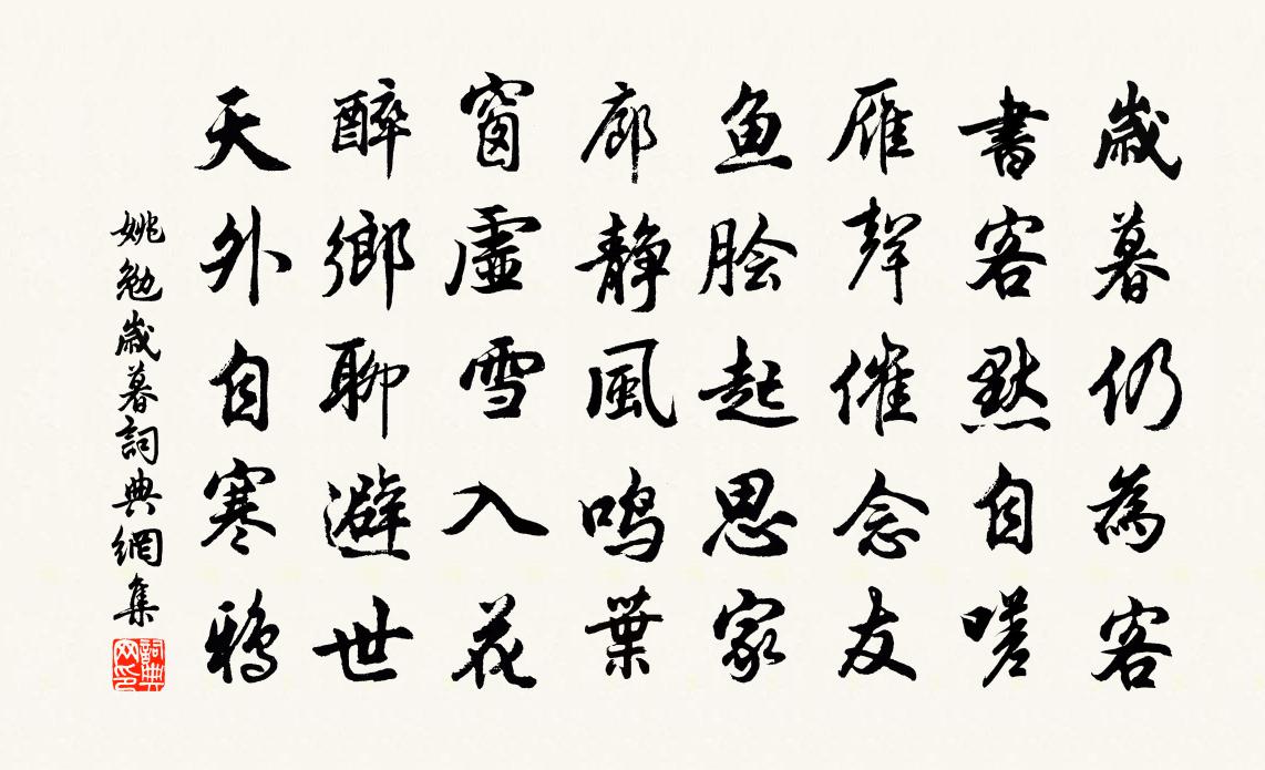 詩詞名句歷史字典書法欣賞書法字典國語詞典說文解字康熙字典古漢語字典標 題 作 者 詩 句 歲暮作者:姚勉 朝代:宋代歲暮原文歲暮仍為客,書客默自嗟。雁聲催念友,魚膾起思家。廊靜風鳴葉,窗虛雪入花。醉鄉聊避世,天外自寒鴉。詩詞問答問:歲暮的作者是誰?答:姚勉問:歲暮寫於哪個朝代?答:宋代姚勉歲暮書法欣賞歲暮書法作品詩詞推薦偈五首釋志璇〔宋代〕不是風動,不是幡動,衲僧失卻鼻孔。是風動,是幡動,分明是個漆桶。兩段不同,眼暗耳聾。澗水如藍碧,山花和宋太博服除還朝簡諸朋舊王安石〔宋代〕呼門初起外廷臣,秀氣稜稜動搢紳。談論坐來能慰我,篇章傳出亦驚人。生芻一束他年闕,伐木相求此地新。便欲次沈節推韻杜范〔宋代〕春工剪水巧先呈,不夜寒光滿地瓊。獨捻冰須搜雪句,此時誰解與同盟。報恩寺朱松〔宋代〕道人足跡掃塵寰,坐看筇枝上蘚斑。豢得籜龍千就就,卻教行水繞空山。留侯廟下作梅堯臣〔宋代〕貌如女子心如鐵,五世相韓韓已滅。家童三百不足使,倉海君初去相結。秦皇東從博浪過,力士袖椎同決烈。曉入次韻周公謹見寄馬廷鸞〔宋代〕涪翁雪堂仙,分誼故不疎。投之孤芳篇,投之孤芳篇,托根豈雲虛。報以蟠桃實,一嘗千載余。洗髓囁閬苑,臨江仙姬翼〔元代〕舉世紛紛爭富貴,道人獨占清貧。清貧柔弱得安身。心閒無事過,隨分樂天真。一點浩然如古鏡,圓明不受微塵。別永嘉使君趙致軒柴望〔宋代〕一番出處計何如,流泊中川不為漁。落日淒涼秋老矣,西風浩蕩客歸歟。吟成白髮逢知己,費盡黃金買古書。明發明發陳公徑過摩舍那灘石峰下十首楊萬里〔宋代〕地迥人絕影,山僻虎留跡。下有無底潭,上有欲落石。是間一逕橫,來以萬松直。樹從何時有,陳公所手植。陳公圓機用墨淡甚輒以上色三丸為好晁說之〔宋代〕淡墨書名二十年,從軍未許勒燕然。只疑淡墨為君累,故遣陳玄去草玄。宜男草范成大〔宋代〕籬菊灘蘆被霜後。裊長風、萬重高柳。天為誰、展盡湖光渺渺,應為我、扁舟入手。橘中曾醉洞庭酒。輾雲濤、掛乘成台觀雪憶子上兄周必大〔宋代〕南雪霏微積便晞,兒童只慣管中窺。誰知今歲望不斷,天與一台成此奇。苔護屐痕氈疊疊,松垂談麈玉枝枝。團欒改作池亭子安弟賦二絕因和韻程公許〔宋代〕凌波微步玉亭亭,華艷深遮萬蓋青。能使官曹饒野趣,小煩月斧敞風欞。和薛公叔留都城韻袁說友〔宋代〕年來更覺一身難,卻掃應須早閉關。老矣壯懷空歲月,歸歟活計只溪山。未堪鵾化搖而上,肯類蠅營去復還。白璧嚴相公宅牡丹徐鉉〔唐代〕但是豪家重牡丹,爭如丞相閣前看。鳳樓日暖開偏早,雞樹陰濃謝更難。數朵已應迷國艷,一枝何幸上塵冠。不知吳佑徐鈞〔宋代〕觀過知仁民不欺,多因德化匪刑齊。片言一懺權臣意,拂袖歸來自灌畦。贈日本僧智藏劉禹錫〔唐代〕浮杯萬里過滄溟,遍禮名山適性靈。深夜降龍潭水黑,新秋放鶴野田青。身無彼我那懷土,心會真如不讀經。為問欲往湖州,見孫莘老,別公輔、希元、彥遠、蘇軾〔宋代〕秋來欲見紫髯翁,待得梅花細萼紅。記取上元燈火夜,道人猶在水晶宮。四月朔旦過黃山哭刑部百求弟道中五首陳著〔宋代〕河流曲折二十里,過了黃山始直礴。今日卸船須得早,鄮峰已在眼花中。郡圃觀白蓮王同祖〔宋代〕翠蓋亭亭映玉裳,臨風{棹左換彳}彴暗飄香。六郎正被繁華困,不愛濃妝愛淡妝。名句推薦荊山長號泣血人,忠臣死為刖足鬼李白《鞠歌行》 一尺深紅勝麴塵,天生舊物不如新。溫庭筠《南歌子詞二首 / 新添聲楊柳枝詞》 人迷洞庭水,雁度瀟湘煙。李白《郢門秋懷》 勾引東風,也知芳思難禁。韓疁《高陽台·除夜》 放眼暮江千頃,中有離愁萬斛,無處落征鴻。楊炎正《水調歌頭·把酒對斜日》 日出扶桑一丈高,人間萬事細如毛。劉叉《偶書》 言之易,行之難呂不韋《呂氏春秋·論·不苟論》 見楊柳飛綿滾滾,對桃花醉臉醺醺。王實甫《十二月過堯民歌·別情》 竹樹無聲或有聲,霏霏漠漠散還凝。杜荀鶴《春日山中對雪有作》 奇外無奇更出奇,一波才動萬波隨。元好問《論詩三十首·二十二》
