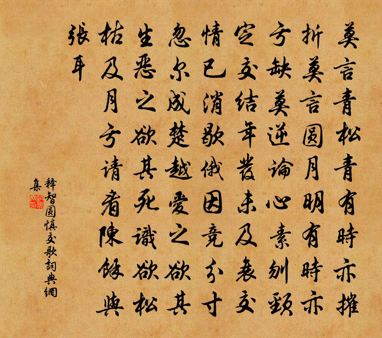 詩詞名句歷史字典書法欣賞書法字典國語詞典說文解字康熙字典古漢語字典標 題 作 者 詩 句 慎交歌作者:釋智圓 朝代:宋代慎交歌原文莫言青松青,有時亦摧折。莫言圓月明,有時亦虧缺。莫逆論心素,刎頸定交結。年發未及衰,交情已消歇。俄因競分寸,忽爾成楚越。愛之欲其生,惡之欲其死。識欲松枯及月虧,請看陳餘與張耳。詩詞問答問:慎交歌的作者是誰?答:釋智圓問:慎交歌寫於哪個朝代?答:宋代釋智圓慎交歌書法欣賞慎交歌書法作品詩詞推薦家園示弟槱鄭樵〔宋代〕學儉誠佳事,慳名豈足居。寫多崇厚論,讀廢絕交書。結客饒傾產,破貧累賣車。前人家訓在,孫孔未全疏。青門飲秦觀〔宋代〕風起雲間,雁橫天末,嚴城畫角,梅花三奏。塞草西風,凍雲籠月,窗外曉寒輕透。人去香猶在,孤衾長閒餘繡。村舍雜書陸游〔宋代〕折蓮釀作醯,采豆治作醬。閉歷揆日時,汲井滌瓮盎。上奉時祭須,下給春耕餉。咨爾後之人,歲事不可曠。和章七出守湖州二首蘇軾〔宋代〕絳闕雲台總有名,應須極貴又長生。鼎中龍虎黃金賤,松下龜蛇綠骨輕。霅水未渾纓可濯,弁峰初見眼應明。兩卮玉樓春謝逸〔宋代〕弄晴數點梨梢雨。門外畫橋寒食路。杜鵑飛破草間煙,蛺蝶惹殘花底露。東君著意憐樊素。一段韶華都付與。妝成友人惠酒殊佳用清光滑辣四字為韻以謝馮時行〔宋代〕六府萃百感,攻愁須酒兵。故人如我知,侵月走雙甖。手裂絳泥封,瓦盆貯瑤瓊。我生百世後,見此聖之清。一飲送仲晦黃銖〔宋代〕靡靡歲時晏,亂山紅葉稀。端居已無悰,況與親故違。駕言臨廣路,惜此須臾期。祖燕未雲洽,雞鳴促再馳。晨裝偶興四首韓元吉〔宋代〕江南菊少開金色,只有霜葩雜御黃。乞得黃花真愛惜,明年賸種壓群芳。龜堂獨酌陸游〔宋代〕幅巾蕭散餞余齡,江左諸賢可乞靈。護枕小屏圖紫閣,映窗矮卷寫黃庭。曠懷與世元難合,幽句何人可遣聽?一酌餞用晦侄南安令趙汝騰〔宋代〕作邑無他法,精神在拊摩。吏肥民必瘦,酒少飯宜多。寧拙催科考,須知於為歌。莫將還債看,好事易蹉跎。春晴曾幾〔宋代〕青春挽留渠不住,白髮拋去吾安能。東風送汝一杯酒,從此閉戶真同僧。酴醿芍藥待判斷,腰鼓橫笛當施行。奈何中秋夜八絕蘇轍〔宋代〕看久須扶立,行貪遂失歸。誰能終不睡,爛醉羽觴飛。寄侯博士羅隱〔唐代〕規諫揚雄賦,邅回賈誼官。久貧還往少,孤立轉遷難。清鏡流年急,高槐旅舍寒。侏儒亦何有,飽食向長安。孟子善信美大陳普〔宋代〕善得於心皆實有,本根植立已無虧。美而且大並神聖,熟後工夫出不期。樂語王義山〔宋代〕端的長春春不老。玉頰微紅,酒暈精神好。多謝天工相懊惱。花間不問春遲早。風外新篁搖翠葆。長樂宮邊,綠陰癸未至節以病晚起走筆戲書紀事排悶十首方回〔宋代〕此老誰能畫,蒙頭一破巾。有杯常設客,無局不饒人。仆醉鄰翁怒,兒啼乳媼嗔。佯聾付一笑,莫漫耗精神。題李君亮義概堂葉適〔宋代〕分飧人所能,多至逾萬億。一朝可趣具,寒暑三十易。古之轑釜者,其始蓋未惜。懷哉西方士,義重見寡特。招呼寄題終守園池梅堯臣〔宋代〕老柏麝不食,古色侵青冥。淺沼龍不入,秋水生浮萍。屋屢圬堊幾太守,壁上彪蔚遺丹青。黑石鐫辭澀如棘,今昔山居雜詩九十首曹勛〔宋代〕朅去天台居,邑有萬戶酒。一出嘗十家,已覺醉屢肘。留連多好事,方圓煩飣斗。約趁黃昏歸,不知月掛柳。和蓬萊閣賞雪賦詩許安世〔宋代〕南國宮收藏晚宮,{左上宮昔下八右今}天凜烈興。日行黃道市,神御坎宮乘。元化初施種,窮陰乍喪朋。氣隨鈞名句推薦今宵樓上一尊同。雲濕紗窗。辛棄疾《一剪梅·中秋元月》 一涓春水點黃昏,便沒頓、相思處。史達祖《留春令·詠梅花》 似醉煙景凝,如愁月露泫。崔護《五月水邊柳》 翹思慕遠人,願欲托遺音。曹植《雜詩六首·其一》 春朝秋夜思君甚,愁見繡屏孤枕。魏承班《滿宮花·雪霏霏》 綠葉翠莖,冒霜停雪。左思《三都賦》 東風不與周郎便,銅雀春深鎖二喬。杜牧《赤壁》 罪不自招,密而舉之則顯。來俊臣《羅織經·問罪卷第十》 繞池閒步看魚游,正值兒童弄釣舟。白居易《觀游魚》 鴻雁不堪愁里聽,雲山況是客中過。李頎《送魏萬之京》