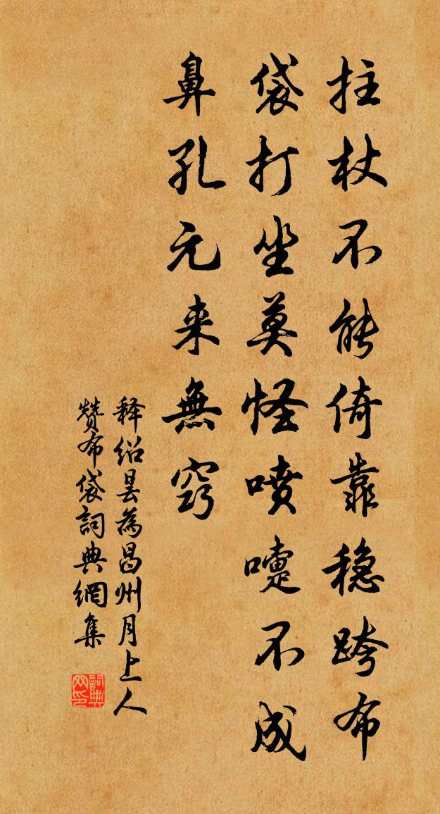 詩詞名句歷史字典書法欣賞書法字典國語詞典說文解字康熙字典古漢語字典標 題 作 者 詩 句 為昌州月上人贊布袋作者:釋紹曇 朝代:宋代為昌州月上人贊布袋原文拄杖不能倚靠,穩跨布袋打坐。莫怪噴嚏不成,鼻孔元來無竅。詩詞問答問:為昌州月上人贊布袋的作者是誰?答:釋紹曇問:為昌州月上人贊布袋寫於哪個朝代?答:宋代釋紹曇為昌州月上人贊布袋書法欣賞為昌州月上人贊布袋書法作品詩詞推薦碧落堂暮景轆轤體楊萬里〔宋代〕碧落堂中夕眺余,一聲哀角裂晴虛。滿城煙靄忽然合,隔水人家恰似無。坐看荷山沉半脊,急歸道院了殘書。意行初秋玩月楊萬里〔宋代〕月華只是尋常月,如何入秋頓清絕。潑在中庭滿地冰,飛上寒窗一堂雪。今霄無雨風亦無,涼氣卻如風雨余。九州和徐舍人九月十一日見寄徐鉉〔唐代〕衡門寂寂逢迎少,不見仙郎向五旬。莫問龍山前日事,菊花開卻為閒人。挽刑邦用孫應時〔宋代〕平生事業始分毫,楩梓終須百丈高。正擬他時好梁棟,忍看摧折山蓬蒿。臨江仙(席上次韻韓文若)葉夢得〔宋代〕聞道安車來過我,百花未敢飄零。疾催弦管送杯行。五朝瞻舊老,揮麈聽風生。鳳詔遠從天上落,高堂燕喜初醒。冬夜示敏巢(時在東都宅)白居易〔唐代〕爐火欲銷燈欲盡,夜長相對百憂生。他時諸處重相見,莫忘今宵燈下情。御筵送李宣徽知真定府司馬光〔宋代〕秋風蕭瑟引華旌,祖宴高張出斗城。玉饌芳菲羅百鐵,繡衣照耀擁千兵。驪歌未闋長楊苑,騎吹先臨細柳營。雨露送刁景純學士使北梅堯臣〔宋代〕嘗聞朔北寒尤甚,已見黃河可過車。驛騎駸駸持漢節,邊風慘慘聽胡笳。朝供酪粥冰生碗,夜臥氊廬月照沙。侍女和郭六玉律上巳宴罷見寄宋祁〔宋代〕式燕靈琨睠蕙時,祓蘭浮棗惜春暉。回驂並躍都門道,誰識顏王曲水歸。題張處士山庭落葉趙湘〔唐代〕搖落拂殘棋,蕭騷傍菊籬。硯浮窗外影,人拾樹中詩。掃綠粘苔冷,燒紅煮茗遲。巢烏還有意,猶在月明枝。江南農事圖唐寅〔明代〕四月江南農事興,漚麻浸谷有常程。莫言嬌細全無事,一夜嬠車響到明。失調名佚名〔宋代〕這愁緒、仗他誰。北山移文孔稚珪〔南北朝〕鐘山之英,草堂之靈,馳煙驛路,勒移山庭: 夫以耿介拔俗之標,蕭灑出塵之想,度白雪以方潔,乾青雲而直蝶羅隱〔唐代〕漢王刀筆精,寫爾逼天生。舞巧何妨急,飛高所恨輕。野田黃雀慮,山館主人情。此物那堪作,莊周夢不成。求參議輓詞樓鑰〔宋代〕玉立期清貴,龐眉望壽齡。父兄嗟奄忽,姑姊亦凋零。厚德今誰在,佳城慘欲扃。孫曾聞競爽,蘭玉在階庭。浣溪沙趙可〔元代〕火冷熏爐香漸消。更闌撥火更重燒。愁心心字兩俱焦。半世清狂無限事,一窗風月可憐宵。燈殘花落夢無聊。聞延平水沴陳宓〔宋代〕鸛鳴早合遷崖際,漁唱先教集岸隈。見說高樓如小舫,呼號聲雜怒濤豗。醉夢迷/採桑子賀鑄〔宋代〕深坊別館蘭閨小,障掩金泥,燈映玻璃。一枕濃香醉夢迷。醒來擬作清晨散,草草分攜。柳巷鴉啼。又是明朝日向次韻楊蟠〔宋代〕零落東山老佛師,古來獨往似君稀。雪邊氣候春將破,林下神情句欲飛。後日當尋慧遠社,何人更贈大顛衣。一篇七夕戲成二絕吳芾〔宋代〕寄語天河牛女星,人人乞巧望聰明。老夫養拙生憎巧,只要冥心度此生。名句推薦昨夜西風凋碧樹,獨上高樓,望盡天涯路。晏殊《蝶戀花·檻菊愁煙蘭泣露》 香醪欲醉茱萸節,壯志還為出塞歌。石茂華《九月九日登長城關》 照花前後鏡,花面交相映。溫庭筠《菩薩蠻·小山重疊金明滅》 酷憐嬌易散,燕子學偎紅。納蘭性德《臨江仙·絲雨如塵雲著水》 料因循誤了,殘氈擁雪,故人心眼。張炎《解連環·孤雁》 佳節又重陽,玉枕紗廚,半夜涼初透。李清照《醉花陰·薄霧濃雲愁永晝》 何當共剪西窗燭,卻話巴山夜雨時。李商隱《夜雨寄北》 古人今人若流水,共看明月皆如此。李白《把酒問月·故人賈淳令予問之》 志,氣之帥也。孟子《孟子·公孫丑章句上·第二節》 施惠勿念,受恩莫忘。朱柏廬《朱子家訓·全文》