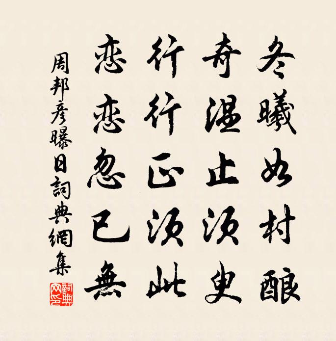 詩詞名句歷史字典書法欣賞書法字典國語詞典說文解字康熙字典古漢語字典標 題 作 者 詩 句 曝日作者:周邦彥 朝代:宋代曝日原文冬曦如村釀,奇溫止須臾。行行正須此,戀戀忽已無。詩詞問答問:曝日的作者是誰?答:周邦彥問:曝日寫於哪個朝代?答:宋代問:周邦彥的名句有哪些?答:周邦彥名句大全周邦彥曝日書法欣賞曝日書法作品詩詞推薦次韻和李殿院詠雪魏野〔宋代〕瑞雪祥雲見盛時,功輕苦雨謾霏霏。墜來雖作天花瘦,消去偏滋壠麥肥。太守登樓飄繡袂,幽人出戶混 * 。鄰封自鉛山歸上饒途中感與陳文蔚〔宋代〕來時積雪歸途熟,暗中流換驚時節。所幸康寧九十親,依然堂上垂華發。隨意何當足甘旨,斑衣日戲慈顏悅。丈夫頌古十首釋雲岫〔宋代〕有意三回遭點額,無心一躍過龍門。歸來冷地思量著,痛處難忘不是恩。次韻答吳長文內翰遺石器八十八件梅堯臣〔宋代〕山工日斲器,殊匪事樵牧。掘地取雲根,剖堅如剖玉。食具與果具,待賓良有勖。亦將茶具並,飽啜時出俗。公何千秋歲歐陽修〔宋代〕畫堂人靜,翡翠簾前月。鸞帷鳳枕虛鋪設。風流難管束,一去音書歇。到而今,高梧冷落西風切。未語先垂淚,滴三月初一日晴色甚快人意晚宿撮石嶺陳氏書院虞儔〔宋代〕昨晚雨不止,今朝天假晴。路乾里堠縮,人健板輿輕。父老驚相顧,親朋漸出迎。端知華表鶴,珍重故鄉情。漓之水曾豐〔宋代〕逮固罔功,不逮寧罔罪。誰謂匪詿,又誰謂無悔。離哉離哉,固雲{爻下換心}哉,寧固雲憝哉。離哉離哉,固雲游雪竇杖錫七首飛雪亭陳著〔宋代〕雪瀑翻崖直下深,自從開闢到如今。天寒水澀山風急,不斷朝宗一派心。重寄絕句(一作寄唐州楊八)劉禹錫〔唐代〕淮西既是平安地,鴉路今無羽檄飛。聞道唐州最清靜,戰場耕盡野花稀。東菑朱繼芳〔宋代〕東菑足時雨,離離半青黃。田家不待獲,小摘炊新香。緣識宋太宗〔宋代〕黃昏初入夜,漏促九天春。各自隨緣意,悲歡舊亦新。觀拔河俗戲李隆基〔唐代〕壯徒恆賈勇,拔拒抵長河。欲練英雄志,須明勝負多。噪齊山岌嶪,氣作水騰波。預期年歲稔,先此樂時和。江上汪元量〔宋代〕太學諸齋揀秀才,出門何處是金台。楝花風緊子規急,楊柳煙昏黃鳥哀。潮落潮生天外去,人歌人哭水邊來。推篷九罭佚名〔先秦〕九罭之魚,鱒魴。我覯之子,袞衣繡裳。鴻飛遵渚,公歸無所,於女信處。鴻飛遵陸,公歸不復,於女信宿。是以徐大正閒軒蘇軾〔宋代〕冰蠶不知寒,火鼠不知暑。知閒見閒地,已覺非閒侶。君看東坡翁,懶散誰比數。形骸墮醉夢,生事委塵土。早眠送高善時赴官孔武仲〔宋代〕王國方登俊,清才尚折腰。萱堂余愴在,癉海此行遙。宴語無疏闊,離懷但黯銷。紅塵一羈旅,風馭羨飄飄。依韻和陸丈瑞香花強至〔宋代〕花下詩翁已富情,愛花相詠句還成。才開秀格能殊眾,到老清香不負名。世上流芳歸幾處,江南傳價入中京。乾坤文宗元聖昭獻孝皇帝輓歌三首劉禹錫〔唐代〕繼體三才理,承顏九族親。禹功留海內,殷歷付天倫。調露曲常在,秋風詞尚新。本支方百代,先讓棣華春。月落上黃端明壽詩以竚期三入後一品見玄孫為韻李呂〔宋代〕賤子甘藏拙,無心學草玄。自然多坎壈,不是樂盤旋。惜餘春慢/選冠子陳德武〔宋代〕不語佳人,多才名友,天遣伴吾幽獨。令姿潘岳,太素何郎,爭似一叢紅玉。誰為織雲錦裳,天孫巧處,暗空機軸名句推薦茶性儉,不宜廣,廣則其味黯澹。陸羽《茶經·五之煮》 知一切法無我。得成於忍。鳩摩羅什譯《金剛經·不受不貪》 山不厭高,海不厭深曹操《短歌行》 七夕今宵看碧霄,牽牛織女渡河橋。林傑《乞巧》 歸雲一去無蹤跡,何處是前期?柳永《少年游·長安古道馬遲遲》 蘭有秀兮菊有芳,懷佳人兮不能忘。劉徹《秋風辭》 春透水波明,寒峭花枝瘦。秦湛《卜運算元·春情》 不是花中偏愛菊,此花開盡更無花。元稹《菊花》 楊柳乍如絲,故園春盡時。納蘭性德《菩薩蠻·問君何事輕離別》 正雁水夜清,臥虹平帖。吳文英《暗香·送魏句濱宰吳縣解組分韻得闔字》