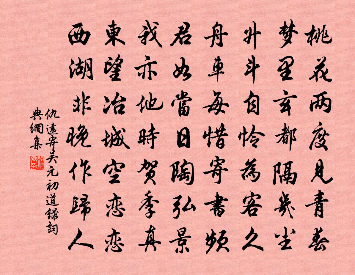 詩詞名句歷史字典書法欣賞書法字典國語詞典說文解字康熙字典古漢語字典標 題 作 者 詩 句 寄吳元初道錄作者:仇遠 朝代:宋代寄吳元初道錄原文桃花兩度見青春,夢裡玄都隔幾塵。升斗自憐為客久,舟車每惜寄書頻。君如當日陶弘景,我亦他時賀季真。東望冶城空戀戀,西湖非晚作歸人。詩詞問答問:寄吳元初道錄的作者是誰?答:仇遠問:寄吳元初道錄寫於哪個朝代?答:宋代仇遠寄吳元初道錄書法欣賞寄吳元初道錄書法作品詩詞推薦次韻高守無隱苦熱王之道〔宋代〕鬱蒸還起砲車雲,旱氣方隆雨未能。應念開幬來白鳥,故成灑酒聚青蠅。南皮痛飲君當繼,北牖高眠我獨醒。人仰還三嵎先寄舍弟李新〔宋代〕客宦乘流同木偶,入村隨俗自猴冠。鴒飛原上正相應,豆泣釜中當少寬。貂闕長憂狗尾續,客來應借鳳毛看。隴西江西試罷還故里八月二十九日過飛猿嶺連日遇林亦之〔宋代〕萬里崎嶇愁不禁,飛猿更聽雨淋淋。剩將暑藥涼無用,未著秋衣寒已深。刻鵠雕蟲成底事,牧羊餧鴨負初心。還家山行雍陶〔唐代〕野花幽鳥幾千般,頭白山僧遍識難。世上遊人無復見,一生唯向畫圖看。銅雀曲楊維楨〔元代〕帳中歌吹作,玉座翠簾曛。西陵迷望眼,日暮起浮雲。險竿行柳曾〔唐代〕山險驚摧輈,水險能覆舟。奈何平地不肯立,走上百尺高竿頭。我不知爾是人耶復猱耶,使我為爾長嘆嗟。我聞孝馬當洑阻風,居人云︰非五日或七日風不止,范成大〔宋代〕拍岸回流逆上磯,枯楊折葦靜相依。趁墟漁子晨爭渡,賽廟商人晚醉歸。重九信來風未恐,大千行行昨俱非。羈愁擬古意於濆〔唐代〕白玉若無玷,花顏須及時。國色久在室,良媒亦生疑。鴉鬟未成髻,鸞鏡徒相知。翻慚效顰者,卻笑從人遲。游山陸游〔宋代〕四序雖悉佳,莫若新秋時;已脫烹煮厄,未興搖落悲。鷺集水落渚,鵲爭風墮枝。煙村烏臼丹,晚日望最奇。豈無承天寶禪師贊黃庭堅〔宋代〕靈山會上,得個訊息。達安城中,不落裷(上雨下佰)。黃撫路口,雪裡開花。九江渡頭,無風起浪。題金華宮徐氏〔唐代〕再到金華頂,玄都訪道回。雲披分景象,黛鎖顯樓台。雨滌前山淨,風吹去路開。翠屏夾流水,何必羨蓬萊。次韻和謝江陵楊縣丞投贈四首項安世〔宋代〕徑苔鋪翠葉堆黃,生怕人來便踏傷。病久養成心性懶,閒多衍得歲年長。已拚故我忘俱盡,忽話當年喜欲狂。蓮盪上浙西張帥十首廖行之〔宋代〕先世精忠百世尊,重扶日月正乾坤。歲寒最見喬松節,凜凜清規在子孫。出其東門佚名〔先秦〕出其東門,有女如雲。雖則如雲,匪我思存。縞衣綦巾,聊樂我員。出其闉闍,有女如荼。雖則如荼,匪我思且。上丞相壽戴栩〔宋代〕翔鸞闕下謝恩初,玉印前頭鹵簿車。每日請來金鳳紙,修成幾卷太平書。次公滿秩來歸,偶上已、寒食同日,父子小酌楊萬里〔宋代〕又是一年修禊時,何須曲水泛金卮。遍嘗眾酒少亦醉,坐到三更眠未遲。上已巧當寒食日,春風慳放牡丹枝。白頭七里灘張伯玉〔宋代〕漱玉鳴珠七里灘,到今猶照客星寒。盧奴有水徒千頃。未得高賢一瞬看。贊歷代天師第二十四代諱正隨字寶神白玉蟾〔宋代〕人在犂鋤煙水鄉,結茅高臥小松崗。敕封真靜先生號,一卷仙經一炷香。廣德官舍二松喻鳧〔唐代〕楊公休簿領,二木日堅牢。直甚彰吾節,清終庇爾曹。幽陰月里細,冷樹雪中高。誰見乾霄後,枝飄白鶴毛。城上吟子蘭〔唐代〕古冢密於草,新墳侵官道。城外無閒地,城中人又老。名句推薦報答春光知有處,應須美酒送生涯。杜甫《江畔獨步尋花七絕句》 柳梢聽得黃鸝語,此是春來第一聲。楊載《到京師》 御羅屏底翻歌扇,憶西湖、臨水開窗。吳文英《風入松·桂》 虎踞龍蟠何處是,只有興亡滿目。辛棄疾《念奴嬌·登建康賞心亭呈史致道留守》 三月三日天氣新,長安水邊多麗人。杜甫《麗人行》 鶯啼燕語報新年,馬邑龍堆路幾千。皇甫冉《春思》 冉冉年時暮,迢迢天路征。陸機《梁甫吟》 一樹斜陽蟬更咽,曾綰灞陵離別納蘭性德《淡黃柳·詠柳》 粉骨碎身全不怕,要留清白在人間。于謙《石灰吟》 雪似梅花,梅花似雪。似和不似都奇絕。呂本中《踏莎行·雪似梅花》