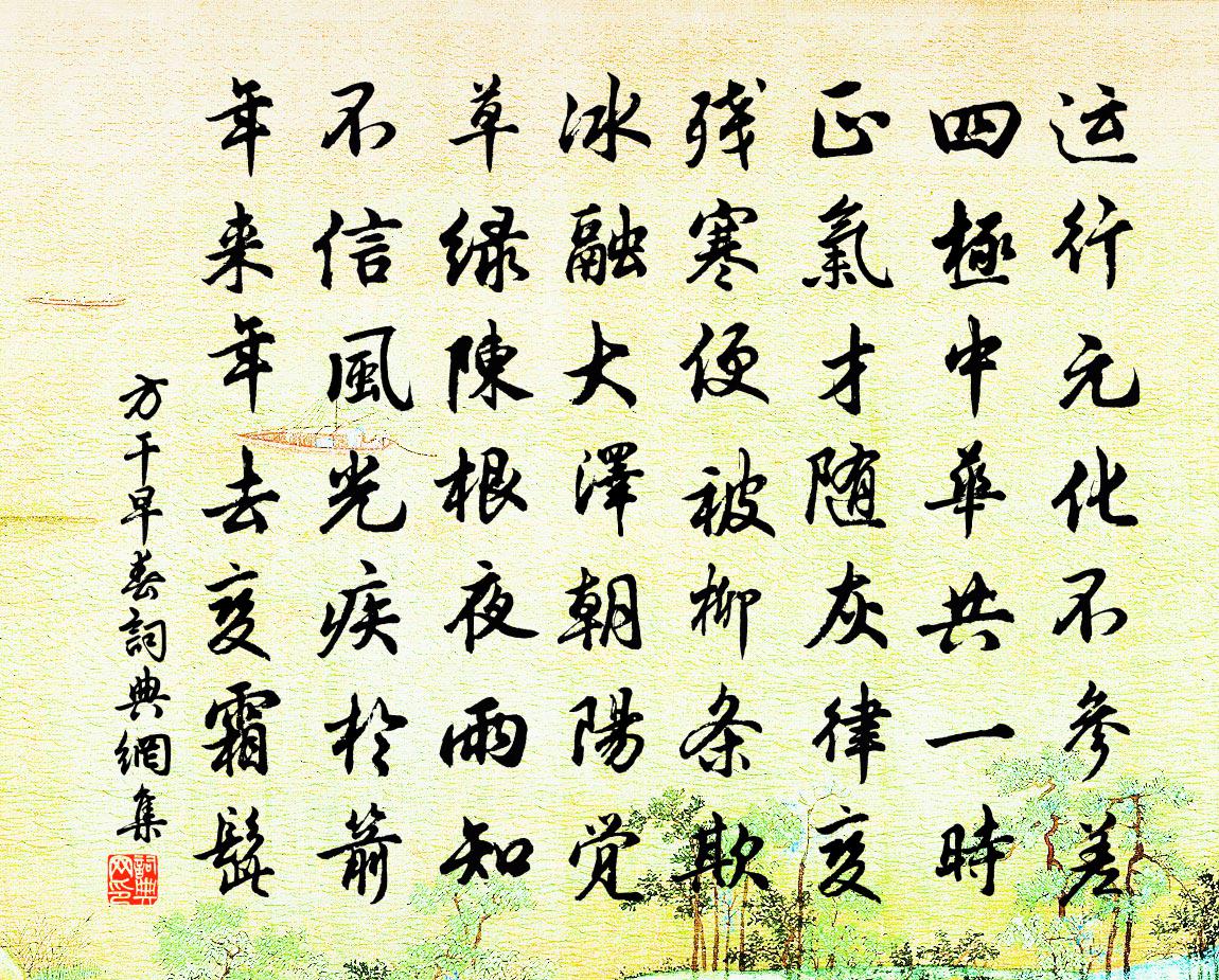 詩詞名句歷史字典書法欣賞書法字典國語詞典說文解字康熙字典古漢語字典標 題 作 者 詩 句 早春作者:方乾 朝代:唐代早春原文運行元化不參差,四極中華共一時。正氣才隨灰律變,殘寒便被柳條欺。冰融大澤朝陽覺,草綠陳根夜雨知。不信風光疾於箭,年來年去變霜髭。詩詞問答問:早春的作者是誰?答:方乾問:早春寫於哪個朝代?答:唐代問:早春是什麼體裁?答:七律方乾早春書法欣賞早春書法作品注釋全唐詩:卷652-59詩詞推薦端午詞內廷晏殊〔宋代〕一一雕盤分楚粽,重重團扇畫秦娥。宮闈百福逢嘉序,萬戶千門喜氣多。送人謁柳開釋正緣〔宋代〕柳牆高於花,怒飛方可至。奇哉游夏徒,吐辭作雄翅。長相思(五之五)陸游〔宋代〕悟浮生。厭浮名。回視千鍾一發輕。從今心太平。愛松聲。愛泉聲。寫向孤桐誰解聽。空江秋月明。送盧郎中赴河東裴令公幕白居易〔唐代〕別時暮雨洛橋岸,到日涼風汾水波。荀令見君應問我,為言秋草閉門多。送鮑中丞赴太原盧綸〔唐代〕分路引鳴騶,喧喧似隴頭。暫移西掖望,全解北門憂。專幕臨都護,分曹制督郵。積冰營不下,盛雪獵方休。白草對酒李白〔唐代〕勸君莫拒杯,春風笑人來。桃李如舊識,傾花向我開。流鶯啼碧樹,明月窺金罍。昨日朱顏子,今日白髮催。棘生春日郊行釋紹嵩〔宋代〕城外春風滿酒旗,吟懷長恨負芳時。東林夫子知予意,載我而今唱和詩。風琴貫休〔唐代〕至境心為造化功,一枝青竹四弦風。寥寥雙耳更深後,如在緱山明月中。訪山庵衛宗武〔宋代〕彌月住山家,晴天物色奢。鶯遷對人語,蜂眾報僧衙。筍老欲成竹,蕙香開遍花。清吟無個事,冉冉送春華。水龍吟 翟端甫壽日十月一日 為孫歌男在李俊明〔魏晉〕勝游漫說山陰,算來不及山陽好。七賢林下,一時人物,何如安道。況有奇才,縱橫筆陣,千軍獨掃。向碧油幢底次韻李久善近詩四首郭印〔宋代〕高人來折節,不免稻粱謀。排悶唯詩卷,消愁只茗甌。此時同幕府,何日共仙舟。氣味難相得,逢君寫我憂。寄題張令陽翟希隱堂梅堯臣〔宋代〕每讀陶潛詩,令人忘世慮。潛本太尉孫,心遠跡亦去。不希五斗粟,自種五株樹。曠然箕山情,復起濠上趣。今時秋波媚/眼兒媚陸游〔宋代〕曾散天花蕊珠宮。一念墮塵中。鉛華洗盡,珠璣不御,道骨仙風。東遊我醉騎鯨去,君駕素鸞從。垂虹看月,天台拜嚴方范祠趙蕃〔宋代〕東都重風節,先生實啟之。有士蓋如此,不拯家國危。乃知大廈傾,未易一木支。我讀黨錮傳,涕流每交頤。往來句趙師秀〔宋代〕病與西湖絕半年。詠史 九年十一月作。白居易〔唐代〕秦磨利刀斬李斯,齊燒沸鼎烹酈其。可憐黃綺入商洛,閒臥白雲歌紫芝。彼為菹醢機上盡,此作鸞凰天外飛。去者喚渡陳起〔宋代〕一帆又是過西陵,天正寒時雨欲冰。心地自平潮自險,回瞻絳闕認觚稜。詠史下高堂隆陳普〔宋代〕負土衣冠亂滿園,不知曹德是軒轅。土山白盡忠臣發,何似初來莫妄言。秋日懷松溪趙宰經父章粲〔宋代〕晴窗靜繙書,凝塵掩行跡。花影晝簾閒,苔痕秋徑寂。憑高招遠風,緣流弄寒碧。緘情寄天涯,杳杳江閩隔。偶成丘葵〔宋代〕風雨三間屋,乾坤一腐儒。營生妻笑拙,學古客言迂。坐久燈花落,吟成硯水枯。方書俱遍覽,無藥可醫愚。名句推薦春生、夏長、秋收、冬藏,天之正也王詡《鬼谷子·持樞》 逢人且說三分話,未可全拋一片心。佚名《增廣賢文·上集》 風回小院庭蕪綠,柳眼春相續。李煜《虞美人·風回小院庭蕪綠》 幾度東風吹世換,千年往事隨潮去。戴復古《滿江紅·赤壁懷古》 霜威出塞早,雲色渡河秋。李白《太原早秋》 記得綠羅裙,處處憐芳草。賀鑄《綠羅裙·東風柳陌長》 集中什九從軍樂,亘古男兒一放翁。梁啓超《讀陸放翁集》 地中有山,謙;君子以裒多益寡,稱物平施。佚名《易傳·象傳上·謙》 種豆南山下,草盛豆苗稀。陶淵明《歸園田居·其三》 愛子心無盡,歸家喜及辰。蔣士銓《歲暮到家》