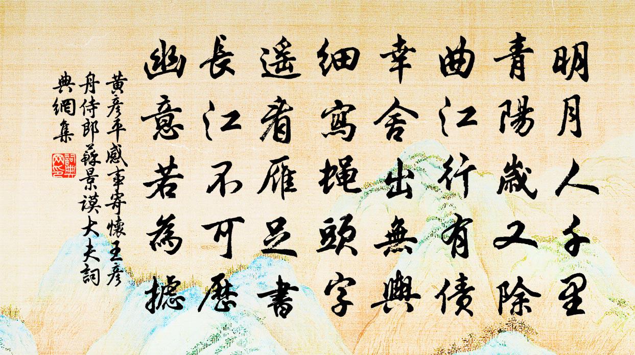 詩詞名句歷史字典書法欣賞書法字典國語詞典說文解字康熙字典古漢語字典標 題 作 者 詩 句 感事寄懷王彥舟侍郎蘇景謨大夫作者:黃彥平 朝代:宋代原文明月人千里,青陽歲又除。曲江行有債,幸捨出無輿。細寫蠅頭字,遙看雁足書。長江不可歷,幽意若為攄。詩詞問答問:《感事寄懷王彥舟侍郎蘇景謨大夫》的作者是誰?答:黃彥平問:該詩寫於哪個朝代?答:宋代書法欣賞感事寄懷王彥舟侍郎蘇景謨大夫書法作品詩詞推薦折山道中六言寄涌翠道人朱槔〔宋代〕折山有路可上,他日雲藏萬家。用處何曾觸石,一禪指頂天涯。次韻茂恭元日大雪喻良能〔宋代〕逗曉褰幃著彩衣,忽驚庭戶有光輝。緩將柏葉隨觴舉,細看梅花伴雪飛。阿堵無心來潤屋,詩仙有句到柴扉。酒酣宮詞三十三首曹勛〔宋代〕法書點畫久非真,上聖傳真妙入神。鳳翥龍盤時降出,二王應望屬車塵。古廟王令〔宋代〕古廟隆隆敞庭扉,風雨剝壁黦柱榱。我來安知神所依,穹堂窸窣風旛旗。神君龐軀突鬚眉,視我睨睚坐倨箕。惕爍詠蛙楊收〔唐代〕兔邊分玉樹,龍底耀銅儀。會當同鼓吹,不復問官私。蝶戀花·京口得鄉書蘇軾〔宋代〕雨後春容清更麗。只有離人,幽恨終難洗。北固山前三面水。碧瓊梳擁青螺髻。一紙鄉書來萬里。問我何年,真箇太常樂章三十首其二十皇帝飲福酒奏禧安之曲楊億〔宋代〕祀帝圜丘,九州獻力。禮行於郊,百神受職。靈祇格思,享我明德。天鑒孔昭,玄祉昭錫。簡張子溫運使喻良能〔宋代〕少陵子厚妙爐錘,力不能追心自期。杯水平時猶不直,試求印可老宗師。釋老六言十首劉克莊〔宋代〕應真渡揭厲水,個個皆以杖扶。長江千里天塹,詎能踏一枝蘆。頌古二十四首釋宗演〔宋代〕摩尼珠,人不識,如來藏里親收得。收者易,見者難。見者易,用則難。見得用得,二無兩般。閒把一枝歸去笛,菩薩蠻(送祐之弟歸浮梁)辛棄疾〔宋代〕無情最是江頭柳。長條折盡還依舊。木葉下平湖。雁來書有無。雁無書尚可。妙語憑誰和。風雨斷腸時。小山生桂偈頌一百五十首釋心月〔宋代〕鱗皴柱杖子,非長亦非短。東行西行處十分著力,歸家穩坐時一味不管。著力處是我同流,不管時吾之道伴。且道靜居寺上方南入一徑有釣台氣象甚古而俗傳謬黃庭堅〔宋代〕避世一丘壑,似漁非世漁。獨吟嘉橘頌,不遺子公書。筍蕨園林晚,絲緡歲月除。安知冶容子,紅袖泣前魚。【越調】霜角張可久〔元代〕新安八景花屏春曉初日滄涼,海霞搖曙光。幾招好山如畫,晴藹藹,郁蒼蒼。眾芳,雲景香,道人眠石床。喚起南游翟園三首楊萬里〔宋代〕柔風軟日斬新晴,釅白嬌紅鼎盛春。借問主人何處去?春光分付守園人。點絳唇朱敦儒〔宋代〕緣徑朱闌,暖煙晴日春來早。自家亭沼。不問人尋討。攜酒提籃,兒女相隨到。風光好。醉敧紗帽。索共梅花笑。絕句六十四首張伯端〔宋代〕火生於木本藏鋒,不會鑽研莫強攻。禍發只因斯害己,要須制伏覓金翁。和答胡用之孫應時〔宋代〕浪喜功名少壯時,發今種種更奚為。窮通信我心如鐵,謗譽從渠口勝碑。息駕便應追靖節,弄弦寧復待鍾期。燭湖冬日遙和盧使君幼平、綦毋居士游法華寺高頂臨湖亭皎然〔唐代〕仁坊標絕境,廉守躡高蹤。天曉才分剎,風傳欲盡鍾。城中歸路遠,湖上碧山重。水照千花界,雲開七葉峰。寒芳聶耒陽以仆阻水書致酒肉療饑荒江詩得代懷…泊於方田杜甫〔唐代〕耒陽馳尺素,見訪荒江眇。義士烈女家,風流吾賢紹。昨見狄相孫,許公人倫表。前期翰林後,屈跡縣邑小。知我名句推薦亂雲低薄暮,急雪舞迴風。杜甫《對雪》 知臣莫若於君,知子莫若於父。魏徵《隋書·帝紀·卷二》 魚網之設,鴻則罹其中;螳螂之貪,雀又乘其後。洪應明《菜根譚·概論》 晨起動征鐸,客行悲故鄉。溫庭筠《商山早行》 楚水巴山江雨多,巴人能唱本鄉歌。劉禹錫《竹枝詞二首·其二》 今日聽君歌一曲,暫憑杯酒長精神。劉禹錫《酬樂天揚州初逢席上見贈》 過盡千帆皆不是,斜暉脈脈水悠悠。溫庭筠《望江南·梳洗罷》 舊相思、偏供閒晝。吳文英《夜遊宮·春語鶯迷翠柳》 君懷良不開,賤妾當何依。曹植《明月上高樓》 應無所住而生其心。鳩摩羅什譯《金剛經·莊嚴淨土》
