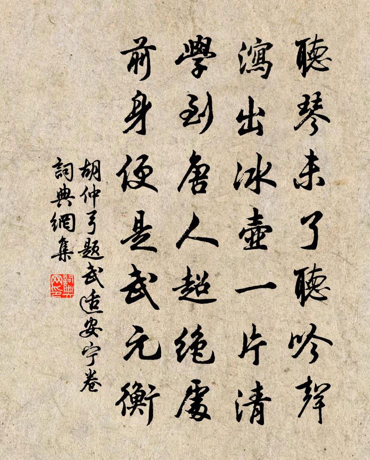 詩詞名句歷史字典書法欣賞書法字典國語詞典說文解字康熙字典古漢語字典標 題 作 者 詩 句 題武適安寧卷作者:胡仲弓 朝代:宋代題武適安寧卷原文聽琴未了聽吟聲,瀉出冰壺一片清。學到唐人超絕處,前身便是武元衡。詩詞問答問:題武適安寧卷的作者是誰?答:胡仲弓問:題武適安寧卷寫於哪個朝代?答:宋代胡仲弓題武適安寧卷書法欣賞題武適安寧卷書法作品詩詞推薦道林寺趙汝譡〔宋代〕伐鼓發東津,弭楫游西林。渺看汀渚隔,回入煙雲深。修廡潤風涼,古殿山氣陰。晨彩發穉竹,夏音轉幽禽。寥寥次韻高守無隱苦熱王之道〔宋代〕鬱蒸還起砲車雲,旱氣方隆雨未能。應念開幬來白鳥,故成灑酒聚青蠅。南皮痛飲君當繼,北牖高眠我獨醒。人仰失調名蔡確〔宋代〕驪山宮中看乞巧,太液池邊收曝衣。偈頌一百六十首釋宗杲〔宋代〕妙喜與師兄,俱是圜悟子。妙喜移住徑山,師兄遷來在此。雖與師兄同條生,不與師兄同條死。八兩與半斤,青紅賦婺州之錄參廳明遠樓為李中甫董奇卿作也姜特立〔宋代〕腳蹴南樓咫尺間,手摩八詠境全慳。東西合抱兩溪水,遠 * 分千里山。但見孤鴻渺天際,更無野馬隘人寰。一時初過白溝北望燕山蘇頌〔宋代〕青山如壁地如盤,千里耕桑一望寬。虞帝肇州疆域廣,漢家封國冊書完。因循天寶興戎易,痛惜雍熙出將難。今日哭鄭丈四首葉適〔宋代〕誰謂居今世,無由見古人。事新曾閔上,游世葛懷民。德盛天為侶,慈薰物與春。清風如尚想,猶足洗囂塵。浣溪沙張元乾〔宋代〕雲氣吞江卷夕陽。白頭波上電飛忙。奔雷驚雨濺胡床。玉節故人同壯觀,錦囊公子更平章。榕陰歸夢十分涼。句劉蕭仲〔宋代〕招客飲治聾,聊復盡餘杯。寄孫正之二首曾鞏〔宋代〕兩人懷抱喜相投,初得青山一日游。已聽高文吟太古,更開昏眼洗清流。共尋素壁題皆遍,欲去紅橋釣始休。回首虞美人張元乾〔宋代〕廣寒蟾影開雲路。目斷愁來處。菊花輕泛玉杯空。醉後不知星斗、亂西東。今宵入夢陽台雨。誰忍先歸去。酒醒長題沈弟所作短軸趙蕃〔宋代〕作詩政欲江山助,老矣東西南北人。弟卻把詩摹作畫,東西南北是知津。念奴嬌蔡伸〔宋代〕歲華晼晚,念羈懷多感,佳會難卜。草草杯盤聊話舊,同剪西窗寒燭。翠袖籠香,雙蛾斂恨,低按新翻曲。無情風送王秀才往松滋夏課齊己〔唐代〕松滋聞古縣,明府是詩家。靜理餘無事,歌眠盡落花。江光搖夕照,柳影帶殘霞。君去應相與,乘船泛月華。雲門大師贊釋智遇〔宋代〕掉發睦州,脫賺靈樹。赤體露金風,清波無透路。阿師腳跛不能行,休對乾峰南嶽去。送朱屯田赴辟成都蘇頌〔宋代〕贊條初罷浙江回,辟命還從蜀道來。朱紱聊光新幕府,烏星重照舊行台。秋登危棧煙霄界,曉望通闤錦繡堆。樂職臂痛謁告,作三絕句示四君子蘇軾〔宋代〕小閣低窗臥宴溫,瞭然非默亦非言。維摩示病吾真病,誰識東坡不二門。別齊太守於鵠〔唐代〕花里南樓春夜寒,還如王屋上天壇。歸山不道無明月,誰共相從到曉看。挽俞君任通判詩虞儔〔宋代〕鄉評月旦尚依然,旁郡人稱別駕賢。邂逅宦途同晚歲,游從太學記當年。誰憐冷落堪為地,我欲吹噓送上天。薦墨鷓鴣天元好問〔金代〕裊裊香風響佩環。廣寒仙子跨青鸞。誰教瑞世儀周國,天賦多才繼小山。鈴閣靜,畫堂閒。袞衣象服□團圓。年年名句推薦落梅庭榭香,芳草池塘綠。晏幾道《生查子·落梅庭榭香》 菡萏香銷翠葉殘,西風愁起綠波間。李璟《攤破浣溪沙·菡萏香銷翠葉殘》 昨夜醉眠西浦月。今宵獨釣南溪雪。洪适《漁家傲引·子月水寒風又烈》 不學自知,不問自曉,古今行事,未之有也。王充《論衡·卷二十六·實知篇》 花漸凋疏不耐風,畫簾垂地晚重工,墮階縈蘚舞愁紅孫光憲《浣溪沙·花漸凋疏不耐風》 不知江月待何人,但見長江送流水。張若虛《春江花月夜》 學不可以已。荀子《荀子·勸學》 當家才知鹽米貴,養子方知父母恩。佚名《增廣賢文·上集》 春風爾來為阿誰,蝴蝶忽然滿芳草。李白《山人勸酒》 大嫂采芙蓉,溪湖千萬重。李白《湖邊採蓮婦》