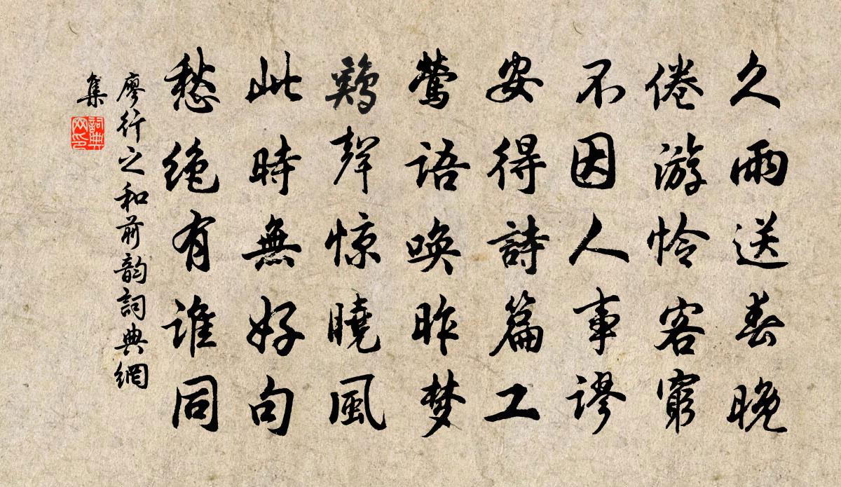 詩詞名句歷史字典書法欣賞書法字典國語詞典說文解字康熙字典古漢語字典標 題 作 者 詩 句 和前韻作者:廖行之 朝代:宋代和前韻原文久雨送春晚,倦遊憐客窮。不因人事謬,安得詩篇工。鶯語喚昨夢,雞聲驚曉風。此時無好句,愁絕有誰同。詩詞問答問:和前韻的作者是誰?答:廖行之問:和前韻寫於哪個朝代?答:宋代廖行之和前韻書法欣賞和前韻書法作品詩詞推薦暫歸桂隱雜書四首張鎡〔宋代〕詩料無窮滿目前,只須拈出見成篇。騎馬莫道隨官俗,也解爭奴曲澗船。義利吟邵雍〔宋代〕君子尚義,小人尚利。尚利則亂,尚義則治。風詠呂溫〔唐代〕微風生青蘋,習習出金塘。輕搖深林翠,靜獵幽徑芳。掩抑時未來,鴻毛亦無傷。一朝乘嚴氣,萬里號清霜。北走和姜總管喜民間種麥虞儔〔宋代〕腰鐮刈晚禾,荷鋤種新麥。田家競作苦,羔豚勞歲夕。翠浪愜初懷,黃雲期後穫。晴暖得天時,肥瘠隨地力。賸欲偈頌二十二首釋妙倫〔宋代〕煙迷岸樹,水沒汀莎。渡頭撥動釣舟,野鴨翩然飛過。王子猷返棹處王銍〔宋代〕我家住在剡溪曲,萬壑千山看不足。卻笑當年訪戴人,雪夜扁舟去何速。浣溪沙程大昌〔宋代〕翦水飛花也大奇。熬波出素料同機。會心一笑撒鹽詩。誰擁醴酏夸歲瑞,恨無堅白怨朝曦。閉門高臥有人飢。清明徐集孫〔宋代〕春風客里動經年,寂寞松楸入夢邊。斗酒誰為寒食奠,懶將楊柳插門前。答楊使君登樓見憶白居易〔唐代〕忠萬樓中南北望,南州煙水北州雲。兩州何事偏相憶?各是籠禽作使君。望楚劉子翬〔宋代〕客浦舟凝滯,憑高識楚鄉。有愁關眺覽,何地不淒涼。草木詞人怨,江山霸主亡。悠然獨搔首,暮靄一星光。聶粹寫真求贊周必大〔宋代〕三年監州再攝州,家置繪像爭借留。便當紫綬朝冕旒,念我青笠操漁舟。攜此鼠目而麞頭,歸來高閣包春秋。他年秋杪江亭有作(一作秋杪乾越亭)劉長卿〔唐代〕寂寞江亭下,江楓秋氣斑。世情何處澹,湘水向人閒。寒渚一孤雁,夕陽千萬山。扁舟如落葉,此去未知還。嘲稚子楊萬里〔宋代〕雨里船中不自由,無愁稚子亦成愁。看渠坐睡何曾醒,及至教眠卻掉頭。漁家傲引/漁家傲洪适〔宋代〕十月橘洲長鼓枻。瀟湘一片塵纓洗。斬得釣竿斑染淚。中夜裡。時聞鼓瑟湘妃至。白髮垂綸孫又子。得錢沽酒長長山間曉望姜特立〔宋代〕老來活計不堪聞,嘯月吟風自策勛。不愛黃金三萬鎰,只求清曉一山雲。吟社遞至詩卷足十四韻以答之為梅水村發也趙必象〔宋代〕無贄謁梅花,一詩我破戒。春風如打勘,具有案卷在。秋雨夜眠白居易〔唐代〕涼冷三秋夜,安閒一老翁。臥遲燈滅後,睡美雨聲中。灰宿溫瓶火,香添暖被籠。曉晴寒未起,霜葉滿階紅。慶長叔招飲一桮,未釂,雪聲璀然。即席走筆楊萬里〔宋代〕老子那知鬢腳凋,忍寒拚命看珠跳。卻嫌地暖無冰凍,恰則飛來恰則銷。菜羹二首姜特立〔宋代〕擬續冰壺傳,嘗賡玉糝詩。蒸豚貴公子,卻莫遣渠知。答招隱羅榮祖〔宋代〕蕩蕩唐堯德,乃有箕山臣。巍巍周武功,不乏採薇人。四皓自躭洛,兩龔豈避新。並介實天性,離奇非世珍。君雖名句推薦嫦娥應悔偷靈藥,碧海青天夜夜心。李商隱《嫦娥》 還始覺、留情緣眼,寬頻因春。吳文英《渡江雲三犯·西湖清明》 如今風雨西樓夜,不聽清歌也淚垂。周紫芝《鷓鴣天·一點殘紅欲盡時》 烏絲闌紙嬌紅篆,歷歷春星。納蘭性德《紅窗月·燕歸花謝》 酷暑天,葵榴發,噴鼻香十里荷花。白樸《得勝樂·夏》 菊花信待重陽久,桂子香聞上界留。慧霖《閏中秋玩月》 恨身翻不作車塵,萬里得隨君。歐陽炯《巫山一段雲·春去秋來也》 風摧寒棕響,月入霜閨悲。李白《獨不見》 清香隨風發,落日好鳥歸。李白《詠鄰女東窗海石榴》 玉座猶寂寞,況乃妾身輕。謝朓《同謝諮議詠銅雀台》
