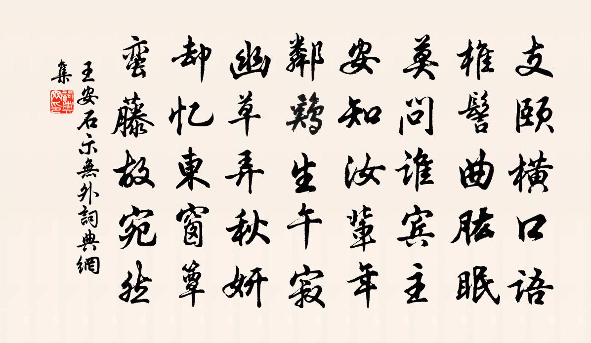 詩詞名句歷史字典書法欣賞書法字典國語詞典說文解字康熙字典古漢語字典標 題 作 者 詩 句 示無外作者:王安石 朝代:宋代示無外原文支頤橫口語,椎髻曲肱眠。莫問誰賓主,安知汝輩年。鄰雞生午寂,幽草弄秋妍。卻憶東窗簟,蠻藤故宛然。詩詞問答問:示無外的作者是誰?答:王安石問:示無外寫於哪個朝代?答:宋代問:王安石的名句有哪些?答:王安石名句大全王安石示無外書法欣賞示無外書法作品詩詞推薦夜聞風聲有感奉呈原父舍人聖俞直講歐陽修〔宋代〕夜半群動息,有風生樹端。颯然飄我衣,起坐為長嘆。苦暑君勿厭,初涼君勿歡。暑在物猶盛,涼歸歲將寒。清霜寄題趙貫道後樂亭楊時〔宋代〕業祠有狐鳴,群雛滿東州。彬彬齊魯郊,不復論軻丘。鼓刀販繒翁,袞袞封公侯。風流日凋弊,世久俗益偷。昔時苦旱六首陳造〔宋代〕枯旱歲十九,無若今歲酷。日色雖許赤,苗心尚余綠。舉觴勸睡龍,雄飛勝雌伏。作意收桑榆,前愆儻容贖。感懷孟郊〔唐代〕秋氣宮悲萬物,宮驚風振長道。登高有所思,寒雨傷百草。平生有親愛,零落不相保。五情今已傷,安得自能老。山中即事李曾伯〔宋代〕手挼岩菊嗅寒香,陡覺輕飈透薄裳。自是蒼官添老色,不因青女眩寒妝。新篘未熟啜茶去,晚稻才收種麥忙。原學書村落間事陸游〔宋代〕東巷西巷新月明,南村北村戲鼓聲。家家輸賦及時足,耕有讓畔桑無爭。一村婚娉皆鄰里,婦姑孝慈均母子。兒從次沈商卿見懷韻章甫〔宋代〕歌喉宛轉變鳴禽,載酒曾同花下吟。寒潮不應宿漁浦,挑燈還憶夜深語。十載故人誰似君,便擬卜鄰桑柘村。青錢茶中雜詠茶焙皮日休〔唐代〕鑿彼碧岩下,恰應深二尺。泥易帶雲根,燒難礙石脈。初能燥金餅,漸見乾瓊液。九里共杉林,相望在山側。詩寄雲夫處士老兄兼呈知府待制八丈司馬光〔宋代〕一鶚曾飛奏,中林下鶴書。今乘使君馬,重到逸人居。松竹過從久,閭閻惠愛余。只應棠樹影,此舊更扶疏。四睡贊釋了惠〔宋代〕無固無必,挨肩促膝。人夢不祥,虎夢大吉。世上有誰知,天台雲幕幕。宜靖三台 化丹陽 同上王哲〔元代〕有限形軀,無涯火院,剎那催促光陰。想人生、有似當風燭,整日家、晝忙夜驚。有等愚迷,千思萬想,家緣逼迫玉樓春辛棄疾〔宋代〕往年巃嵸堂前路。路上人夸通判雨。去年拄杖過瓢泉,縣吏垂頭民笑語。學窺聖處文章古。清到窮時風味苦。尊前牧丹釋智圓〔宋代〕栽培寧暇問耕桑,紅白相鮮映畫堂。淚濕濃妝含曉露,火燔寒玉照斜陽。黃金剩買心無厭,綺席閒觀興更狂。誰向木蘭花慢王惲〔元代〕憲陵台畔客,笑幾度,送人行。對一道青山,兩行官柳,去住人情。蒼生望初不*。問此身、何用絆虛名。宦味真加階薛能〔唐代〕二年中散似稽康,此日無功換寵光。唯有一般酬聖主,勝於東晉是文章。林寺丞許惠桂花袁燮〔宋代〕羨君仙隱佔龍山,愛君風度超人寰。手移仙葩第一品,布列竹籬松徑間。秋來月色轉清好,秋半花蕊方斕斑。對花長卿見過賦美人插花用其韻胡銓〔宋代〕花亦興不淺,美人頭上開。心事眼勾破,鬢香魂引來。笑春燭底影,濺淚風前杯。分韻得先字,客今誰或哉。久疾灼艾小愈晚出門外陸游〔宋代〕老境侵凌病滿軀,火攻下策得枝梧。沽來村酒初判醉,叱去山童不遣扶。霜重木凋鴉可數,溪清魚見鸛相呼。興闌管飽舒岳祥〔宋代〕為管則易,為鮑則難。相馬失瘦,相士失寒。管貧鮑富,坦然相安。於利不疚,於義期完。虞美人蔡伸〔宋代〕紅塵匹馬長安道。人與花俱老。緩垂鞭袖過平康。散盡高陽、零落少年場。朱弦重理相思調。無奈知音少。十年如名句推薦洞房昨夜停紅燭,待曉堂前拜舅姑。朱慶餘《近試上張籍水部 / 近試上張水部 / 閨意獻張水部》 數聲風笛離亭晚,君向瀟湘我向秦。鄭谷《淮上與友人別》 無情明月,有情歸夢,同到幽閨。劉基《眼兒媚·秋思》 思牽今夜腸應直,雨冷香魂吊書客。李賀《秋來》 戍鼓斷人行,邊秋一雁聲。杜甫《月夜憶舍弟》 淚眼不曾晴,眉黛愁還聚游次公《卜運算元·風雨送人來》 昨日屋頭堪炙手,今朝門外好張羅白居易《放言五首·其四》 空園白露滴,孤壁野僧鄰。馬戴《灞上秋居》 過能改,歸於無。倘掩飾,增一辜。李毓秀《弟子規·信》 紛紛暮雪下轅門,風掣紅旗凍不翻。岑參《白雪歌送武判官歸京》