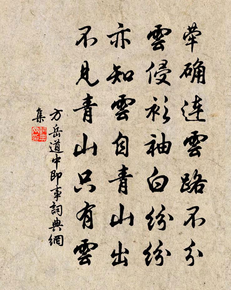 詩詞名句歷史字典書法欣賞書法字典國語詞典說文解字康熙字典古漢語字典標 題 作 者 詩 句 道中即事作者:方岳 朝代:宋代道中即事原文犖确連雲路不分,雲侵衫袖白紛紛。亦知雲自青山出,不見青山只有雲。詩詞問答問:道中即事的作者是誰?答:方岳問:道中即事寫於哪個朝代?答:宋代方岳道中即事書法欣賞道中即事書法作品詩詞推薦逍遙四章呈欽之堯夫司馬光〔宋代〕結髮讀經史,疲精非一朝。於今成滬落,所幸得逍遙。不韙狂心息,難平客氣消。巢林易為足,竊敢比鷦鷯。游峨眉十一首馮時行〔宋代〕豈但山儲秀,年多樹亦靈。華夷供靜矚,參井入危經。幽討真殊絕,神光卻渺冥。正當存不議,聊使俗迷醒。早春宴高陵滑少府(得升字)耿湋〔唐代〕且寬沈簿領,應賴酒如澠。春夜霜猶下,東城月未升。清言饒醉客,亂舞避寒燈。名字書仙籍,諸生病未能。淳化中朝會二十三首佚名〔宋代〕遺俗續陶唐,來蘇徯聖皇。布昭湯綽伐,恢復漢對疆。金鋮申斟剪,朱乾式發揚。宜哉七德頌,千搖播洋洋。句張釜〔宋代〕西湖天下勝。哭麴象(一作司空曙詩)耿湋〔唐代〕憶昨秋風起,君曾嘆逐臣。何言芳草日,自作九泉人。蝦子和尚贊釋智遇〔宋代〕清溪影寒,以蝦為目。無柄笊籬,東摝西摝。思家五首方回〔宋代〕黃山三十六峰豪,南照城樓百里高。五嶺舊坑金作硯,雙橋新釀玉為醪。浙鄉巨艦供魚鯗,淮郡駢肩致蟹螯。牛尾軍中雜歌陸游〔宋代〕匈奴莫復倚長戈,來款軍門早乞和。鐵騎如山尚可避,飛將軍來汝奈何!報寧寺蘇泂〔宋代〕為愛先生所賦詩,半生參學老猶迷。如今數卷鐘山草,步步相隨處處攜。玉樓春馮時行〔宋代〕杏花微露春猶淺。春淺愁濃愁送遠。山拖餘翠斷行蹤,細雨疏煙迷望眼。暮雲濃處輕吹散。往事時時心上見。不禁打冰詞吳偉業〔清代〕北河風高水生骨,玉壘銀橋堆幾尺。新戍雲中千騎馬,橫津直渡無行跡。下流湍悍川途開,吹笳官舫從南來。帆檣及第東歸次灞上,卻寄同年李商隱〔唐代〕芳桂當年各一枝,行期未分壓春期。江魚朔雁長相憶,秦樹嵩雲自不知。下苑經過勞想像,東門送餞又差池。灞陵次翁來借諸家易解聞已有新說以詩借觀劉子翬〔宋代〕天庭吐氣作靜紅,警邏猶煩小試中。政使著鞭無暇日,惟應讀易有清風。晝評一卦紛然異,夜夢三爻廓爾通。聞說悖拏兒舞張祜〔唐代〕春風南內百花時,道唱梁州急遍吹。揭手便拈金碗舞,上皇驚笑悖拏兒。送堯夫二章文同〔宋代〕欲與民為利,先求正所妨。紛更初下議,旁午遂交章。不爾毛安傅,其如體自傷。西南余弊在,歸為對明光。次韻郭右曹黃庭堅〔宋代〕閱世行將老斲輪,那能不朽見仍雲。歲中日月又除盡,聖處工夫無半分。秋水寒沙魚得計,南山溫霧豹成文。古心念奴嬌(詠牡丹)陳著〔宋代〕洛陽地脈,是誰人、縮到海涯天角。綠樹成陰芳霧底,得見當年台閣。園杏貴客,海棠姬侍,擁入青油幕。人間那觀梅方岳〔宋代〕臥疴半月不曾來,等膽來時漸次開。世外交情無久近,歲寒然後始知梅。鏡檻李商隱〔唐代〕鏡檻芙蓉入,香台翡翠過。撥弦驚火鳳,交扇拂天鵝。隱忍陽城笑,喧傳郢市歌。仙眉瓊作葉,佛髻鈿為螺。五里名句推薦寶馬雕車香滿路。辛棄疾《青玉案·元夕》 長記曾攜手處,千樹壓、西湖寒碧。姜夔《暗香·舊時月色》 溪上桃花無數,花上有黃鸝。黃庭堅《水調歌頭·遊覽》 海棠不惜胭脂色,獨立濛濛細雨中。陳與義《春寒》 去年燕子天涯,今年燕子誰家?張炎《清平樂·采芳人杳》 天子臨軒賜侯印,將軍佩出明光宮。王維《少年行四首》 寒食時看郭外春,野人無處不傷神。雲表《寒食詩》 與人不求備,檢身若不及佚名《尚書·商書·伊訓》 香非在蕊,香非在萼,骨中香徹。晁補之《鹽角兒·亳社觀梅》 鵬北海,鳳朝陽。辛棄疾《鷓鴣天·送廓之秋試》