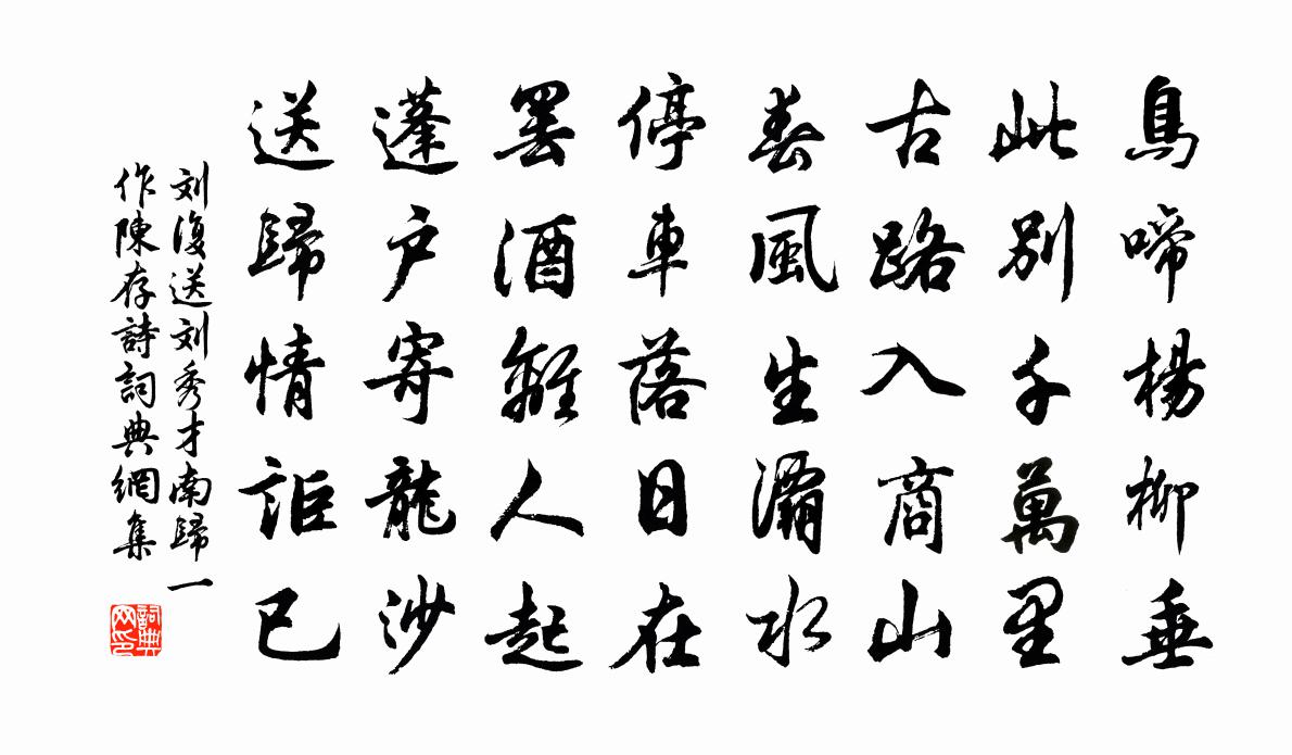 詩詞名句歷史字典書法欣賞書法字典國語詞典說文解字康熙字典古漢語字典標 題 作 者 詩 句 送劉秀才南歸(一作陳存詩)作者:劉復 朝代:唐代原文鳥啼楊柳垂,此別千萬里。古路入商山,春風生灞水。停車落日在,罷酒離人起。蓬戶寄龍沙,送歸情詎已。詩詞問答問:《送劉秀才南歸(一作陳存詩)》的作者是誰?答:劉復問:該詩寫於哪個朝代?答:唐代問:該詩是什麼體裁?答:五古書法欣賞送劉秀才南歸(一作陳存詩)書法作品注釋全唐詩:卷305-13詩詞推薦偈頌一百零一首釋慧性〔宋代〕一真含法界,大用等虛空。千祥如霧集,萬善若雲臻。用祝吾皇無量壽,天高無極地無窮。省中語佚名〔唐代〕後行祠屯,不博中行都門;中行禮部,不博前行駕庫。維那觀師以偈示余求詩為贈因成兩絕句孔武仲〔宋代〕夾路長松綠蔭繁,送君從此入幽關。銅瓶錫仗無拘系,正好窺尋瀑水源。望月婆羅門 元夕王寂〔元代〕小寒鐵料峭,一鐵番春意換鐵年芳。蛾鐵兒雪柳風光。開盡星橋鐵鎖,平地瀉銀潢。記當時行樂,年少如狂。宦遊送王大昌齡赴江寧岑參〔唐代〕對酒寂不語,悵然悲送君。明時未得用,白首徒攻文。澤國從一官,滄波幾千里。群公滿天闕,獨去過淮水。舊家雨後元稹〔唐代〕倦寢數殘更,孤燈暗又明。竹梢餘雨重,時復拂簾驚。霜角 水西煙雨張可久〔元代〕沙淺波平。孤舟長日橫。淡墨瀟湘八景,誰移向、富山城。淨名。疏磬聲。暮歸何處僧。明日披雲風頂,呼太白、孫主簿惠上黨寺壁胡霈然書墨跡一匣梅堯臣〔宋代〕上黨佛祠何可觀,開元瑞物圖高閣。又有長廊古壁上,復是名輩題丹雘。當時泥用絲作筋,意欲千載無剝落。書奇入朝曲謝朓〔南北朝〕江南佳麗地,金陵帝王州。逶迤帶綠水,迢遞起朱樓。飛甍夾馳道,垂楊蔭御溝。凝笳翼高蓋,疊鼓送華輈。獻納【越調】小桃紅_贈劉牙兒瓠喬吉〔元代〕贈劉牙兒瓠犀微露玉參差,偏稱烏金漬。斜抵春纖記前事,試尋思。風流漫惹閒唇齒,含宮泛徵,咬文嚼字,誰敢和劉後村梅花百詠方蒙仲〔宋代〕煮木石餐多藥灶,斷葷膻氣獨茶鐺。詩人自合長的瘦,底事梅花更瘦生。初到漁滄溪陳宓〔宋代〕平生不到滄漁溪,邂逅相逢如有約。遠觀已得環岫奇,俯瞰未識游魚樂。倚欄初試一銖餌,便有纖鱗最先覺。須臾壽禮部喬文昌陳起〔宋代〕璇杓西揭將指乾,商飆萬里清無邊。亭亭東峴聳蒼玉,雙溪露淨銀河鮮。天應斂此山川氣,九秋蘊作人間瑞。當年無題唐寅〔明代〕古春去也悵須臾,問爾能思幾日無。何必傷心催發白,會當動手補顏朱。妙齡勸賞雄渾語,達士恥隨迂闊夫。我醉送蘇公佐修撰知梓州蘇轍〔宋代〕乘軺舊西蜀,出鎮復東川。父老知遺愛,壺漿定滿前。江山昔年路,旄節異邦權。望重朝中舊,疆分劍外天。歲登和吳正仲觀李廷珪墨莊綽〔宋代〕賴召陳玄典籍傳,肯教邊腹擅便便。竟夸削木真餘事,卻笑磨人得永年。三友不居毛穎後,五車仍在褚生前。祗愁丹灶鄭玠〔宋代〕靈跡曾傳葛稚川,至今丹灶尚依然。誰雲碧海三山島,別是朱明一洞天。龍出玉京成往事,鶴來華表是何年,塵埃水龍吟(紹興甲子上元有懷京師)向子諲〔宋代〕華燈明月光中,綺羅弦管春風路。龍如駿馬,車如流水,軟紅成霧。太一池邊,葆真宮裡,玉樓珠樹。見飛瓊伴侶贈鶴林白玉蟾〔宋代〕骨氣秋江月,文章春苑花。片心窮萬法,半語辯千邪。朝罷雞司曉,醉酣蜂報衙。未為三島客,笑指五雲家。騎月謝真人還舊山范傳正〔唐代〕麾蓋從仙府,笙歌入舊山。水流丹灶缺,雲起草堂關。白鹿行為衛,青鸞舞自閒。種松鱗未立,移石蘚仍斑。望路名句推薦黃河水繞漢宮牆,河上秋風雁幾行。李夢陽《秋望》 江闊雲低、斷雁叫西風。蔣捷《虞美人·聽雨》 記得去年今夕,釃酒溪亭,淡月雲來去。文徵明《念奴嬌·中秋對月》 來歲長安春事早,勸杏花、斷莫相思死。龔自珍《金縷曲·癸酉秋出都述懷有賦》 火冷燈稀霜露下,昏昏雪意雲垂野。蘇軾《蝶戀花·密州上元》 不應取法。不應取非法。鳩摩羅什譯《金剛經·正信希有》 遠村秋色如畫,紅樹間疏黃。晏殊《訴衷情·芙蓉金菊斗馨香》 大嫂采芙蓉,溪湖千萬重。李白《湖邊採蓮婦》 風雨端陽生晦冥,汨羅無處吊英靈。貝瓊《已酉端午》 雖萬被戮,豈有悔哉!班固《漢書·傳·司馬遷傳》
