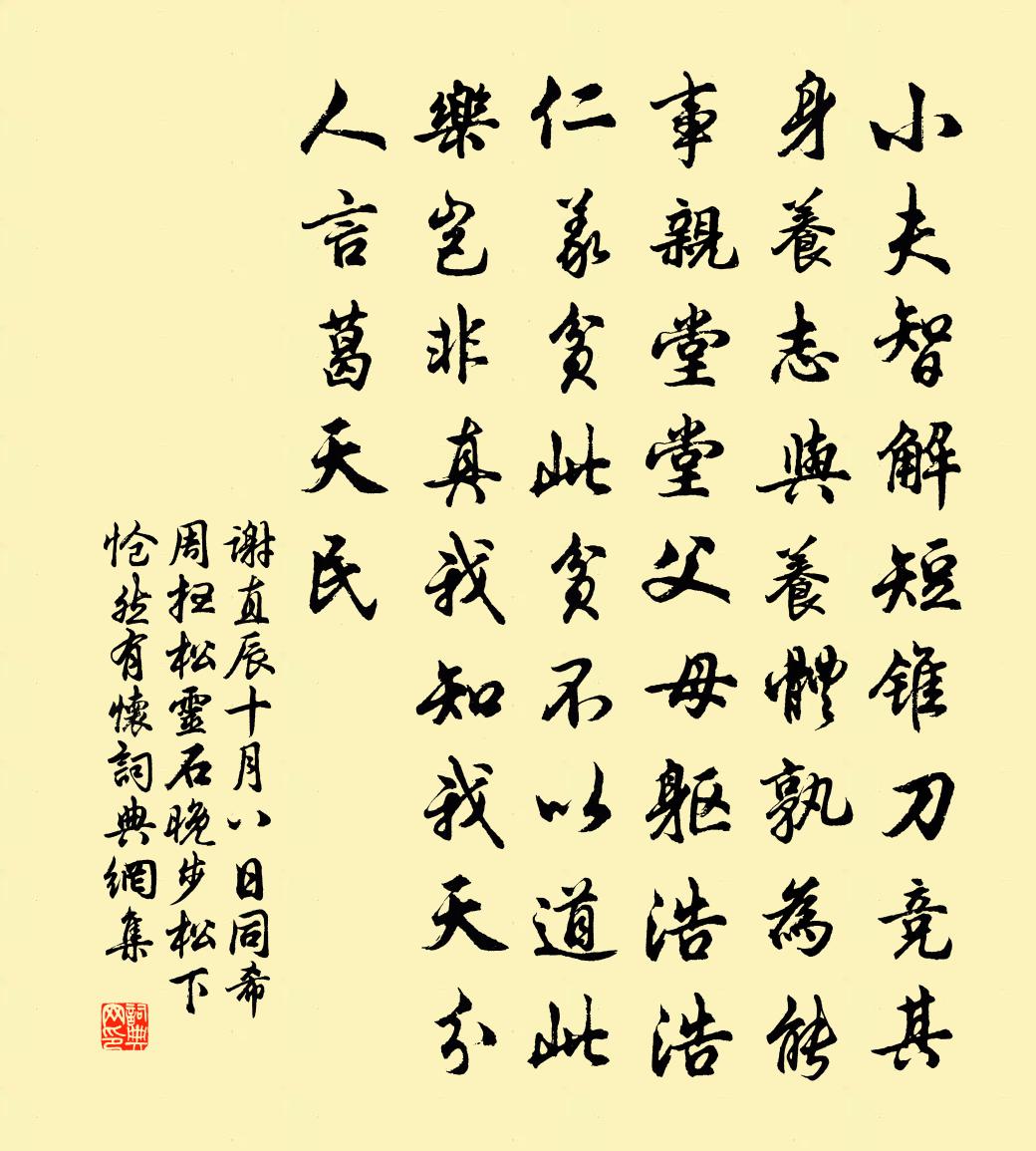 詩詞名句歷史字典書法欣賞書法字典國語詞典說文解字康熙字典古漢語字典標 題 作 者 詩 句 辰十月八日同希周掃松靈石晚步松下愴然有懷作者:謝直 朝代:宋代原文小夫智解短,錐刀競其身。養志與養體,孰為能事親。堂堂父母軀,浩浩仁義貧。此貧不以道,此樂豈非真。我知我天分,人言葛天民。詩詞問答問:《辰十月八日同希周掃松靈石晚步松下愴然有懷》的作者是誰?答:謝直問:該詩寫於哪個朝代?答:宋代書法欣賞辰十月八日同希周掃松靈石晚步松下愴然有懷書法作品詩文賞析【原題】:辰十月八日同希周掃松靈石晚步松下愴然有懷以數詩示兒侄輩邀希周同賦時阿同在新城他日當寄之詩詞推薦鷓鴣天佚名〔宋代〕風約微雲不放陰。滿天星點綴明金。燭龍銜耀烘殘雪,羯鼓催花發上林。河影轉,漏聲沈。縷衣羅薄暮雲深。更期老嘆陸游〔宋代〕人生易衰老,萬事海濤翻。但恨芳尊迮,寧悲雪鬢繁?諸儒輕古學,遺虜盜中原。有語誰能聽?毋矜舌尚存。書事二首劉克莊〔宋代〕謙之紼翣迎歸福,平甫灰釘送返莆。空累兩家營後事,僅留四壁遺諸孤。學徒誰是單傳者,史藁曾經乙覽無。貧富行父和篇頗有過情這語次韻自敘以謝李彌遜〔宋代〕家在閩山最上頭,大書高屋榜休休。按行松竹曾施屐,應接江山不運眸。漫道鶴書朝赴隴,真成蟻穴夢封侯。紫薇偈傾一百六十九首釋智朋〔宋代〕平地起堆從古有,青天霹靂避猶難。杖頭自有通方眼,風月一天非等閒。眼兒媚佚名〔宋代〕平生幾度怨長亭。不似這番深。霜收水瘦,風流帆飽,怎忍輕分。欄乾倚遍慵歸去,獨自個黃昏。荷橫釵股,柳垂二月初七日壽溪十絕劉克莊〔宋代〕□□□夜裡,折箭傳黃旗。野老心無事,聞之忽皺眉。九日諸友屏峰上方登高得登字仇遠〔宋代〕天借重陽一日晴,因過竹院遠尋僧。翠屏晚對無人共,畫棟朝飛與客登。旋摘菊花浮臘醖,待分貝葉讀秋燈。餘生宿山觀余靖〔宋代〕孤枕秋宵永,山寒夢不成。殘燈背窗影,急雨帶溪聲。未分山中老,空思日下名。區區如逆旅,此際若為情。暇日邀王天任諸公游南坡天任有詩因次韻虞儔〔宋代〕君家有西園,望我南山巔。觴詠繼曲水,花石希平泉。長溝流砌下,遠岫列楹前。春風一披拂,百卉為渠妍。迨茲奉和魯望秋日遣懷次韻皮日休〔唐代〕高蹈為時背,幽懷是事兼。神仙君可致,江海我能淹。共守庚申夜,同看乙巳占。藥囊除紫蠹,丹灶拂紅鹽。與物謝蘇州史君張子儀尚書贈衣服送酒錢楊萬里〔宋代〕香山老益窶,欲賣宅與田。荊南贈春服,侍中送酒錢。何如韋蘇州,一日兼兩賢。酒錢隨春服,並至南溪邊。寄物題李國博東園何異〔宋代〕東園吟思玉蟾清,園客開門古意生。冰硯雲燈深洞宇,春花秋草舊宮城。人藏密樹尋聲見,鷺下寒池照影驚。三十折楊柳鄭愔〔唐代〕青柳映紅顏,黃雲蔽紫關。忽聞邊使出,枝葉為君攀。舞腰愁欲斷,春心望不還。風花滾成雪,羅綺亂斑斑。甲第曹鄴〔唐代〕遊人未入門,花影出門前。將軍來此住,十里無荒田。兩同心仇遠〔宋代〕踏青歸後,小步西園。翠袖薄、新篁難倚,綠窗潤、弱絮輕粘。春風急,暮雨悽然。早聽啼鵑。憶昔幾度湖邊。款山中即目二首戴復古〔宋代〕岩路穿黃落,人家隱翠微。籠雞為鴨抱,網犬逐鶉飛。竹好堪延客,溪清欲浣衣。禪扉在何許,僧笠戴雲歸。謁陸禮部歸偶成二首張鎡〔宋代〕欲識清狂自在身,關門湖上獨經春。今朝正接黃梅雨,卻出沖泥訪故人。送簡賀州五首舒邦佐〔宋代〕曩時鹽令更,官貧如負債。而今舊法復,私販奪公賣。且莫作是想,亟欲目前快。有錢藏之民,畢竟根本在。喜趙賓暘至次韻舟行二首方回〔宋代〕別後生涯兩更微,裹糧東路是耶非。我才疋馬荒山出,公亦輕帆下水飛。市酤未成投轄飲,閒枰聊解爛柯圍。會須名句推薦以三寸之舌,彊於百萬之師。司馬遷《史記·平原君虞卿列傳》 舍其所爭,取其所棄,不亦君子乎?王通《中說·卷四·事君篇》 無一語,對芳尊。安排腸斷到黃昏。秦觀《鷓鴣天·枝上流鶯和淚聞》 奢侈者鮮有不敗李大師、李延壽《南史·列傳·卷四十五》 仙苑春濃,小桃開,枝枝已堪攀折。阮逸女《花心動·春詞》 美人結長想,對此心悽然。李白《折楊柳》 報答春光知有處,應須美酒送生涯。杜甫《江畔獨步尋花七絕句》 繁霜儘是心頭血,灑向千峰秋葉丹。戚繼光《望闕台》 致虛極;守靜篤。萬物並作,吾以觀復。老子《老子·道經·第十六章》 柳下桃蹊,亂分春色到人家。秦觀《望海潮·洛陽懷古》