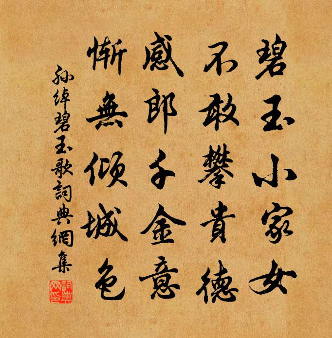 詩詞名句歷史字典書法欣賞書法字典國語詞典說文解字康熙字典古漢語字典標 題 作 者 詩 句 碧玉歌作者:孫綽 朝代:魏晉碧玉歌原文碧玉小家女,不敢攀貴德。感郎千金意,慚無傾城色。詩詞問答問:碧玉歌的作者是誰?答:孫綽問:碧玉歌寫於哪個朝代?答:魏晉孫綽碧玉歌書法欣賞碧玉歌書法作品詩詞推薦上巳訪楊廷秀賞牡丹於御書匾榜之齋其東園僅周必大〔宋代〕楊監全勝賀監家,賜湖豈比賜書華。四環自斸三三徑,頃刻常開七七花。門外有田聊伏臘,望中無處不煙霞。卻慚辛亥各口占十絕劉克莊〔宋代〕汗腳誰教上玉台,卻尋前路擊芒鞋。自嫌到了無仙分,已踏金鰲跌下來。人月圓 山中書事 北曲聊樂府前集今張可久〔元代〕興亡千古繁華夢,詩眼卷天涯。孔林喬木,吳宮蔓草,楚廟寒鴉。數間茅舍,藏書萬卷,投老村家。山中何事,松寄杜侍御王建〔唐代〕何須服藥覓升天,粉閣為郎即是仙。買宅但幽從索價,栽松取活不爭錢。退朝寺里尋荒塔,經宿城南看野泉。道氣卜運算元徐俯〔宋代〕清池過雨涼,暗有清香度。縹緲娉婷絕代歌,翠袖風中舉。忽斂雙眉去。總是關情處。一段江山一片雲,又下陽台宿九江驛董嗣杲〔宋代〕孤燈花燼糝窰台,古驛涼扉傍月開。數事支持愁外去,十年憔翠夢中來。贈山庵高士邵棠〔宋代〕山帶寒流無俗聲,通樵一徑鎖清陰。幽人飽臥西風裡,並午醒來黃葉深。懷友人趙蹈中周南〔宋代〕水宿山行可煞勞,山川應是怕才豪。詩人只好游湘水,上卻巴陵恐是騷。傾杯樂(寵慶主人壽,代作)林季仲〔宋代〕璧月初圓,彩雲輕護,散雪疊冰涼館。張眉競巧,趙瑟新成,整頓戲衫歌扇。壽酒殷勤,嬌語溫柔,只愁杯淺。正明堂慶成恭進詩文天祥〔宋代〕於皇藝祖德乘乾,聖主宣光奕葉前。運再庚申皇建極,祀同癸亥數參天。中嚴外辦三千禮,累洽重熙四十年。願贊宮詞楊皇后〔宋代〕溶溶太液碧波翻,雲外樓台日月閒。春到漢室三十六,為分和氣到人間。出鄉陳炎〔宋代〕筍輿搖兀去程賒,嶺路羊腸狹且斜。只見萬山迷眼界,正無多地看人家。當庭鋤土栽桑柘,成級開田種麥麻。可喜登丹陽北樓(一作張繼詩)郎士元〔唐代〕寒皋那可望,旅望又初還。迢遞高樓上,蕭條曠野閒。暮晴依遠水,秋興屬連山。浮客時相見,霜凋動翠顏。送紹興張耆年教授之永嘉學官曾幾〔宋代〕海內孤寒士,江頭獨冷官。胡為涉修阻,不肯近長安。蠲紙無留筆,生枝不帶酸。名山天下少,行矣雪消殘。贈鍾陵陳處士貫休〔唐代〕否極方生社稷才,唯譚帝道鄙梯媒。高吟千首精怪動,長嘯一聲天地開。湖上獨居多草木,山前頻醉過風雷。吾皇偈公六十五首釋鹹傑〔宋代〕一切數句非數句,與吾靈覺何交涉。毒蛇鑽入你鼻孔,蝦蟆咬破你眼睛。安晚先生送自贊太上感應篇帙首御題諸惡莫作陳起〔宋代〕公袞殊相念,奇書寄布衣。此心才動處,萬善要同歸。本旨詳敷衍,奎題重發揮。應憐蘧伯玉,投老始知非。純紅賈似道〔宋代〕眼如椒核遍身紅,尾項如硃腿亦同。若逢敵手君休怕,數番咬死又成功。尋春次韻樓鑰〔宋代〕曉來陌上雨斑斑,同社相將便出關。席地亦堪尋酒所,得園徑與坐花間。從教多病須行樂,任是清貧也破慳。門外【南呂】一枝花_湖上歸長天張可久〔元代〕湖上歸長天落彩霞,遠水涵秋鏡。花如人面紅,山似佛頭青。生色圍屏,翠冷勝雲徑,嫣然後黛橫。但攜將旖旎濃名句推薦欲持一瓢酒,遠慰風雨夕。韋應物《寄全椒山中道士》 寒山吹笛喚春歸,遷客相看淚滿衣。李益《春夜聞笛》 天涯倦客,山中歸路,望斷故園心眼。蘇軾《永遇樂·彭城夜宿燕子樓》 金陵津渡小山樓,一宿行人自可愁。張祜《題金陵渡》 紅臉青腰,舊識凌波女。晏幾道《蝶戀花·笑艷秋蓮生綠浦》 幽音變調忽飄灑,長風吹林雨墮瓦李頎《聽董大彈胡笳聲兼寄語弄房給事》 人無善志,雖勇必傷。劉安及其門客《淮南子·主術訓》 九日登高處,群山入望賒。趙時春《原州九日》 出其東門,有女如雲。佚名《出其東門》 舊遊無處不堪尋。無尋處,惟有少年心。章良能《小重山·柳暗花明春事深》