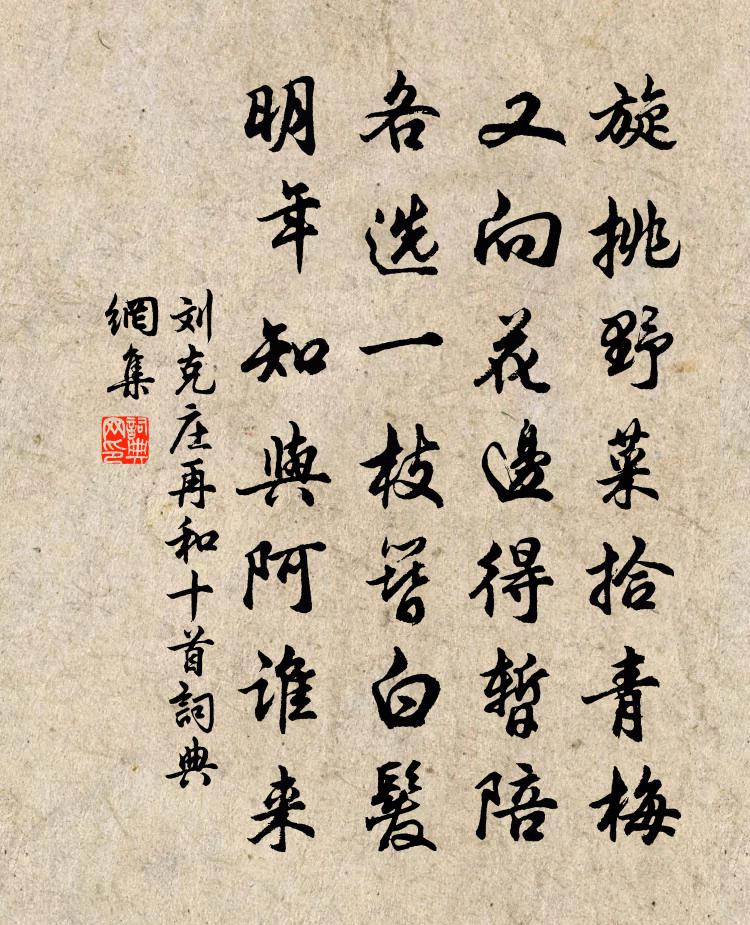 旋挑野菜拾青梅,又向花邊得暫陪。各選一枝簪白髮,明年知與阿誰來。