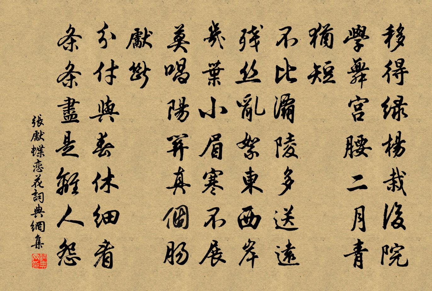 過片“幾葉小眉寒不展”,以楊柳嫩葉比美人之眉,仍是繼續前面的擬人,連下句依然顯現著那個小歌女的形象。葉兒“寒不展”,狀歌女顰眉情態,表明她心緒不佳。“莫唱《陽關》”四字暗示出離別情事 。《陽關》,曲辭即王維名作《送元二使安西》,乃送別曲也。與誰離別呢?看來便是前述那位好心的主人了 ,他將外出,故伊人依依難捨 。“真箇腸先斷”的“腸”與“眉”一樣是柳的借喻。末二句進一步點明斷腸原因,兼寄詞人的感慨。其中代用了唐人雍陶《題情盡橋》“自此改名為折柳,任他離恨一條條 ”的名句 。那柳絲似乎條條儘是離人怨苦的具象了。