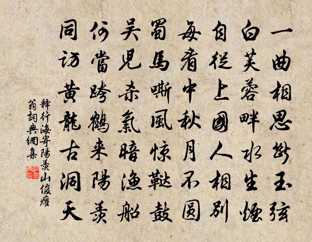 詩詞名句歷史字典書法欣賞書法字典國語詞典說文解字康熙字典古漢語字典標 題 作 者 詩 句 寄陽羨山俊癯翁作者:釋行海 朝代:宋代寄陽羨山俊癯翁原文一曲相思斷玉弦,白芙蓉畔水生煙。自從上國人相別,每看中秋月不圓。蜀馬嘶風驚韃鼓,吳兒殺氣暗漁船。何當跨鶴來陽羨,同訪黃龍古洞天。詩詞問答問:寄陽羨山俊癯翁的作者是誰?答:釋行海問:寄陽羨山俊癯翁寫於哪個朝代?答:宋代釋行海寄陽羨山俊癯翁書法欣賞寄陽羨山俊癯翁書法作品詩詞推薦午晴至園中陸游〔宋代〕老不禁寒起每遲,出門蕭散午晴時。春回九地梅先覺,霜霣千林竹不知。藥圃采苗芒屨濕,石泉照影角巾欹。歸來次楊子直使君韻周必大〔宋代〕雪繭冰絲結素華,天孫初織費繅車。花開金谷空千種,蕊疊瑤英自一家。下比山礬誰薄相,上攀瓊木客雄夸。集仙擬長沙訪姚雪蓬至永返賦此為寄樂雷發〔宋代〕今傍南軒住,應知理趣精。通書多似易,論語不言誠。擬欲聽微論,猶能慰別情。江湖風浪隔,腸斷楚鴻聲。偈頌九十三首釋梵琮〔宋代〕了知生死本來同,無數深紅間淺紅。堪笑衲僧無用處,盡將衣缽付春風。勞生正昏睡,侵曉已先行。到家一著子,如夢令張翥〔元代〕月似二年前好。人比二年前老。今夕又鯨川,但欠酒杯傾倒。聞道。聞道。三徑漸荒秋草。沐浴啟聖僧舍與趙德麟邂逅蘇軾〔宋代〕南山北闕兩非真,東潁西湖跡已陳。季子來歸初可喜,老聃新沐定非人。酒清不醉休休暖,睡穩如禪息息勻。自笑靈雲岩李燾〔宋代〕路轉層岡十里余,武陵傳者亦難如。昔年煉藥仙人室,今日餐霞道士居。洞外蟠花開錦繡,岩前石溜漱瓊琚。猗歟折楊柳魚玄機〔唐代〕朝朝送別泣花鈿,折盡春風楊柳煙。願得西山無樹木,免教人作淚懸懸。和魯如晦春日過定遠山口王之道〔宋代〕雨足塍塍水,春晴處處花。畏塗雙只堠,荒戍兩三家。心折朝鳴鹿,魂驚暮集鴉。想君行役苦,愁蹙不成嗟。酥溪寺舍窗前有黃金間璧玉竹可愛謾作二十字杜范〔宋代〕中土太淡素,東皇染半節。此君已不群,此種更奇絕。警惰陳淳〔宋代〕日月雙跳丸,一旦復一旦。於穆無疆命,後□□如趲。前頭只逗遛,不勇攻與戰。當然緊切功,一一事散漫。便是雪中端約相招因以詩簡之蔡戡〔宋代〕纖纖暮雨變飛霙,夜聽敲窗瀉竹聲。柳絮因風誠可擬,梅花帶月有餘清。梁園公子方開宴,姑射神人最賦情。可笑初榮曾豐〔宋代〕{上艹下爭}{上艹下爭}者梅,十月初榮。於郡之廳,有罍有觥。主禮孔誠,洽其歡聲。之子初榮,為鄉為馨。宿建溪中宵即事歐陽詹〔唐代〕隆穹一席眠還坐,蛙噪螢飛夜未央。僮僕舟人空寂寂,隔簾微月入中倉。失調名佚名〔宋代〕夜來一陣催花雨。寄劉尚書魚玄機〔唐代〕八座鎮雄軍,歌謠滿路新。汾川三月雨,晉水百花春。囹圄長空鎖,干戈久覆塵。儒僧觀子夜,羈客醉紅茵。筆硯頌古三十六首釋惟一〔宋代〕鷓鴣啼處百花香,劫外風光不覆藏。往往遊人多蹉過,卻從上苑探群芳。感懷孟郊〔唐代〕秋氣悲萬物,驚風振長道。登高有所思,寒雨傷百草。平生有親愛,零落不相保。五情今已傷,安得自能老。晨登訴衷情(趙德大還延平,因語舊遊,作此以贈之)曾覿〔宋代〕半鉤珠箔小揚州。春色在重樓。曾醉玳筵歌舞,楚夢苦難留。情脈脈,恨悠悠。幾時休。大都人世,會少離多,總冷齋張明中〔宋代〕雨濕桑樞夜不關,北窗誰更肯遮闌。冷侵硯滴渾無潤,凍折詩眉未系寒。萬里雲容同水墨,四垂檐溜欲琅玕。梅花名句推薦蠶無夏織桑充寨,田廢春耕犢勞軍。杜荀鶴《題所居村舍》 春來遍是桃花水,不辨仙源何處尋。王維《桃源行》 去年燕子天涯,今年燕子誰家?張炎《清平樂·采芳人杳》 三百年間同曉夢,鐘山何處有龍盤。李商隱《詠史二首·其一》 莫罵酉時妻,一夜受孤淒。佚名《增廣賢文·上集》 情之所鍾,雖醜不嫌。沈復《浮生六記·閨房記樂》 積土成山,風雨興焉;荀子《勸學》 年年遊子惜余春,春歸不解招遊子。賀鑄《惜余春·急雨收春》 漢臣曾此作縲囚,茹血衣毛十九秋。汪遵《詠北海》 欲為聖明除弊事,肯將衰朽惜殘年。韓愈《左遷至藍關示侄孫湘》