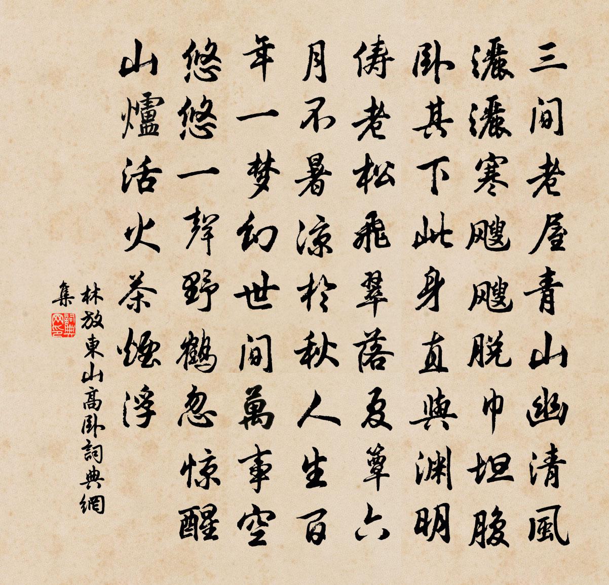 詩詞名句歷史字典書法欣賞書法字典國語詞典說文解字康熙字典古漢語字典標 題 作 者 詩 句 東山高臥作者:林放 朝代:宋代東山高臥原文三間老屋青山幽,清風灑灑寒颼颼。脫巾坦腹臥其下,此身直與淵明儔。老松飛翠落夏簟,六月不暑涼於秋。人生百年一夢幻,世間萬事空悠悠。一聲野鶴忽驚醒,山爐活火茶煙浮。詩詞問答問:東山高臥的作者是誰?答:林放問:東山高臥寫於哪個朝代?答:宋代林放東山高臥書法欣賞東山高臥書法作品詩詞推薦題施璘畫竹圖韋遵〔唐代〕枯籜危根繳石頭,千竿交映近清流。堪珍仲寶窮幽筆,留得荊湘一片秋。題雲錦劉從甫水竹雲山亭艾性夫〔宋代〕玻璃冷浸清湘玉,白衣暖護秋屏綠。淮南公子有勝情,收拾四美歸吾亭。問君亭中更何有,解事家人頻送酒。客來歸途次韻黃彥平〔宋代〕村落人家柳過牆,舞腰曾共小姑長。點妝拂黛留相學,卷葉吹蘆莫漫狂。頌一百則釋重顯〔宋代〕日面佛,月面佛,五帝三皇是何物。二十年來曾苦辛,為君幾下蒼龍窟。屈堪述明眼,衲僧莫輕忽。林貴州哀詩二首劉克莊〔宋代〕歲晚淹留潦霧間,朱幡雖寵變蒼顏。潁川鳳下來何晚,浪泊鳶飛去不還。道遠返喪新燧改,州貧無賻旅囊慳。新邱與孫氏周默〔宋代〕五十衰翁二十妻,目昏發白已頭低。絳幃深處休論議,天外青鸞伴木雞。赤隴山舒坦〔宋代〕野草如排戟,山花似列屏。維舟一登覽,誤入小蓬瀛。塞上曲裴說〔唐代〕極目望空闊,馬羸程又賒。月生方見樹,風定始無沙。楚水辭魚窟,燕山到雁家。如斯名利役,爭不老天涯。和諸學士秋夕禁直偶(一作遇)雪吳融〔唐代〕大華積秋雪,禁闈生夜寒。硯冰憂詔急,燈燼惜更殘。正遂攀稽願,翻追訪戴歡。更為三日約,高興未將闌。和朱元晦九曲櫂歌歐陽光祖〔宋代〕仙掌峰邊仙浴堂,泉聲戛戛漱琳琅。流從六曲灘頭去,猶帶落花風裡香。寄題王才臣南山隱居六首松庵魏了翁〔宋代〕受命獨也正,巋然十八公。人獨匪正命,胡然不如松。閱藏後題智證庵壁釋宗杲〔宋代〕柏子拈來香滿廬, * 靜里結跏呋。三年過眼千千卷,此際分明一字無。平原郡王南園詩二十一首忘機姜特立〔宋代〕機心已儘自虛明,滓翳寧容點太清。寄語堂前鷗與鷺,五湖煙水莫寒盟。劉子野攜諸名公詩軸見過為書其後蔡沈〔宋代〕畏暑懶出戶,息心聊罷詩。諸公舊有作,其意已無遺。嶺表經行處,賢闕扣見時。悠然皆往事,勉務日新期。馬斃三首仇遠〔宋代〕曉廏,塞翁一笑欲何如。西郊或有閒迎送,卻向東家借蹇驢。金丹大藥訣白玉蟾〔宋代〕離府龍飛,坎宮虎躍。金木混融,水火擊搏。刑德主賓,浮沉清濁。一百日胎,二八兩藥。白雪虛無,黃芽圓覺。連日與邢伯方兄弟飲成四十字趙蕃〔宋代〕江上風雖橫,林間月自新。探橐看墨妙,酌酒話情親。感嘆思前日,飄零愧此身。未妨頻夕醉,初不污東茵。九日雨中徐鉉〔唐代〕茱萸房重雨霏微,去國逢秋此恨稀。目極暫登台上望,心遙長向夢中歸。荃蘪路遠愁霜早,兄弟鄉遙羨雁飛。唯有使至嵩山尋杜四不遇慨然復傷田洗馬韓觀主…贈杜侯杜四宋之問〔唐代〕洛橋瞻太室,期子在雲煙。歸來不相見,孤賞弄寒泉。與君闊松石,於茲二十年。田公謝昭世,韓子秘幽埏。憶昔謝芝峰交隨惠茶釋智愚〔宋代〕揀芽芳字出山南,真味那容取次參。曾向松根烹瀑雪,至今齒頰尚余甘。名句推薦碧水丹山映杖藜,夕陽猶在小橋西。沈周《題畫》 生而富者驕,生而貴者傲。范曄《後漢書·列傳·崔駰列傳》 鵲橋波里出,龍車霄外飛。任希古《和長孫秘監七夕》 誰人背後無人說,哪個人前不說人?佚名《增廣賢文·上集》 拔劍擊大荒,日收胡馬群。杜甫《後出塞五首》 我醉欲眠卿且去,明朝有意抱琴來。李白《山中與幽人對酌》 見人初解語嘔啞,不肯歸眠戀小車。韋莊《與小女》 採蓮時,小娘紅粉對寒浪。溫庭筠《荷葉杯·鏡水夜來秋月》 文官不愛錢,武官不惜死,則天下太平。張廷玉《明史·列傳·卷一百四十三》 雞鳴紫陌曙光寒,鶯囀皇州春色闌。岑參《奉和中書舍人賈至早朝大明宮》