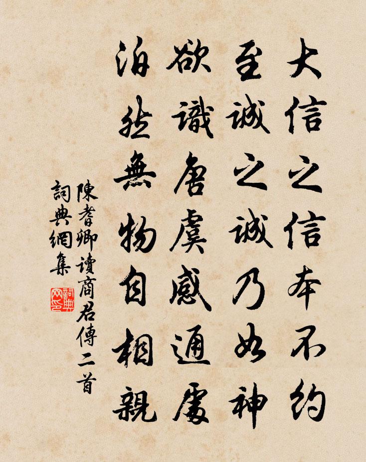 詩詞名句歷史字典書法欣賞書法字典國語詞典說文解字康熙字典古漢語字典標 題 作 者 詩 句 讀商君傳二首作者:陳耆卿 朝代:宋代讀商君傳二首原文大信之信本不約,至誠之誠乃如神。欲識唐虞感通處,泊然無物自相親。詩詞問答問:讀商君傳二首的作者是誰?答:陳耆卿問:讀商君傳二首寫於哪個朝代?答:宋代陳耆卿讀商君傳二首書法欣賞讀商君傳二首書法作品詩詞推薦守歲項安世〔宋代〕人情憐舊復憐新,擾擾通宵雜笑嚬。炷蠟煎膏留漏箭,賣椒沽酒辨廚珍。一聲竹里千家曉,百和香中九陌春。莫道橫吹曲辭出塞王之渙〔唐代〕黃砂直上白雲間,一片孤城萬仞山。羌笛何須怨楊柳,春光不度玉門關。葵葉楊萬里〔宋代〕蒻笠端能直幾錢,騎奴不擬雨連天。蓋頭旋折山葵葉,擘破青青傘半邊。鐵拄杖(並敘)蘇軾〔宋代〕柳真齡字安期,閩人也。家寶一鐵拄杖,如ω栗木,牙節宛轉天成,中空有簧,行輒微響。柳雲得之浙中,相傳王出次近郊宋祁〔宋代〕江練東南楚塞長,野煙寒氣共蒼茫。局轅班馬思長道,攫肉飢烏下夕陽。旅舍樵蘇勞後爨,農家簦笠遠相望。坐觀唐多令張之翰〔元代〕怨思入清笳。斜陽鳴亂鴉。正開尊、細酌流霞。北里南莊今歲然,全不覺、米難賒。筆硯淡生涯。胸中氣自華。看上魏南夫丞相釋寶曇〔宋代〕浩如都會藏槃槃,靜若江漢捐濤瀾。公手不動安如山,人在廣莫行寬閒。昨朝齋戒謁帝還,精禱默際天人間。風雨和楊同州寒食乾坑會後聞楊工部欲到知予與工部有宿酲白居易〔唐代〕夜飲歸常晚,朝眠起更遲。舉頭中酒後,引手索茶時。拂枕青長袖,欹簪白接蘺。宿酲無興味,先是肺神知。古寺黃彥輝〔宋代〕古寺雲深去路賒,來分僧缽共生涯。依稀池草成春夢,容易江梅老歲華。長鋏悲彈三尺雪,短檠寒落五更花。夜來雨中牡丹穆修〔宋代〕萬金期勝賞,三月破穠芳。妬忌巫娥雨,摧殘洛苑香。怨啼甄后玉,寒出貴妃湯。掩斂無聊極,誰來替斷腸。後漢門獻帝周曇〔唐代〕只為曹侯數貴人,普天黔首盡黃巾。漢靈早聽侍中諫,安得獻生稱不辰。冬日題智門寺北樓杜牧〔唐代〕滿懷多少是恩酬,未見功名已白頭。不為尋山試筋力,豈能寒上背雲樓。海陵病中呂本中〔宋代〕病知前路資糧少,老覺平生事業非。無數青山隔滄海,與誰同往卻同歸。次韻謝王粟秀才四首項安世〔宋代〕掩關飽黑甜,屏跡慕鳥有。何心望披拂,注意及衰朽。勞君催魏徒,過我沮溺耦。拜手把瓜桃,捫胸愧箕斗。腰痛胡仲弓〔宋代〕門前齊雪立,因被病相魔。堪佩金魚否,能懸寶劍麽。折非陶令懶,瘦似沈郎多。已辦揚州鶴,其如十萬何。賀新郎·賦琵琶辛棄疾〔宋代〕鳳尾龍香撥。自開元霓裳曲罷,幾番風月?最苦潯陽江頭客,畫舸亭亭待發。記出塞、黃雲堆雪。馬上離愁三萬里水調歌林正大〔宋代〕落日峴山下,倒著接回。傍人笑問山翁,日日醉歸來。三萬六千長日,一日杯傾三百,罍麴築糟抬。漢水鴨頭綠湖村月夕陸游〔宋代〕誰持綠酒醉幽人?鶴氅筇枝發興新。今夜湖邊有奇事,青山缺處涌冰輪。登廬山東峰觀九江合彭蠡湖吳筠〔唐代〕百川灌彭蠡,秋水方浩浩。九派混東流,朝宗合天沼。寫心陟雲峰,縱目還縹緲。宛轉眾浦分,差池群山繞。江妃還獄文天祥〔宋代〕人情感故物,百年多離憂。桑下住三宿,應者猶遲留。矧茲方丈室,屏居二春秋。夜眠與晝坐,隤乎安楚囚。自罹名句推薦朱門沉沉按歌舞,廄馬肥死弓斷弦。陸游《關山月》 雲銷雨霽,彩徹區明。王勃《滕王閣序》 山寺月中尋桂子,郡亭枕上看潮頭。白居易《憶江南·江南憶》 長安回望繡成堆,山頂千門次第開。杜牧《過華清宮絕句三首》 毛羽不豐滿者不可以高飛劉向《戰國策·秦一·蘇秦始將連橫》 里仁為美,擇不處仁,焉得知?孔子弟子《論語·里仁篇》 昭君拂玉鞍,上馬啼紅頰。李白《王昭君二首》 處大無患者恆多慢,處小有憂者恆思善陳壽《三國志·蜀書·杜周杜許孟來尹李譙郤傳》 鳥飛千白點,日沒半紅輪。白居易《彭蠡湖晚歸》 花門樓前見秋草,豈能貧賤相看老。岑參《涼州館中與諸判官夜集》